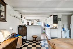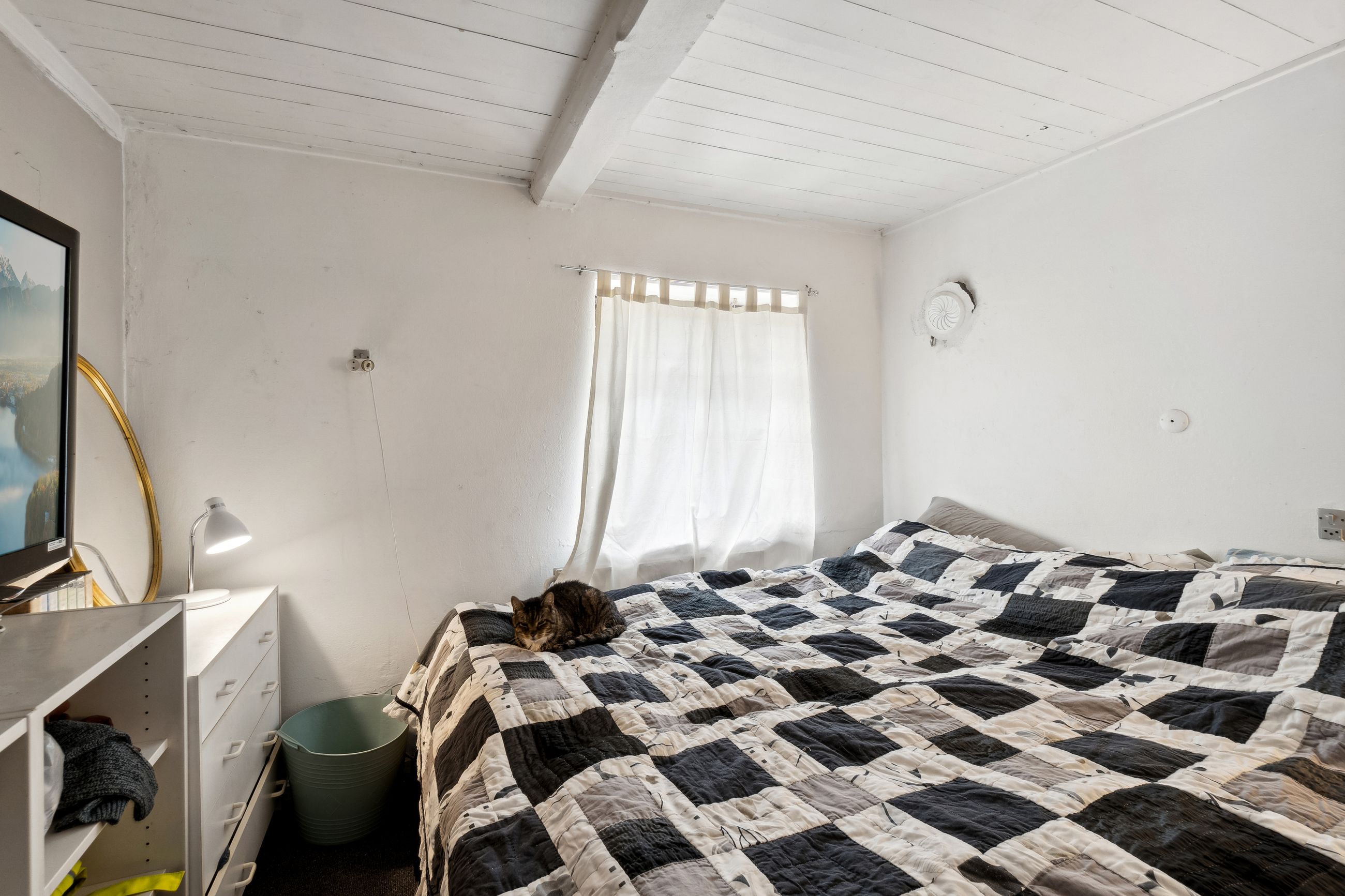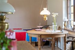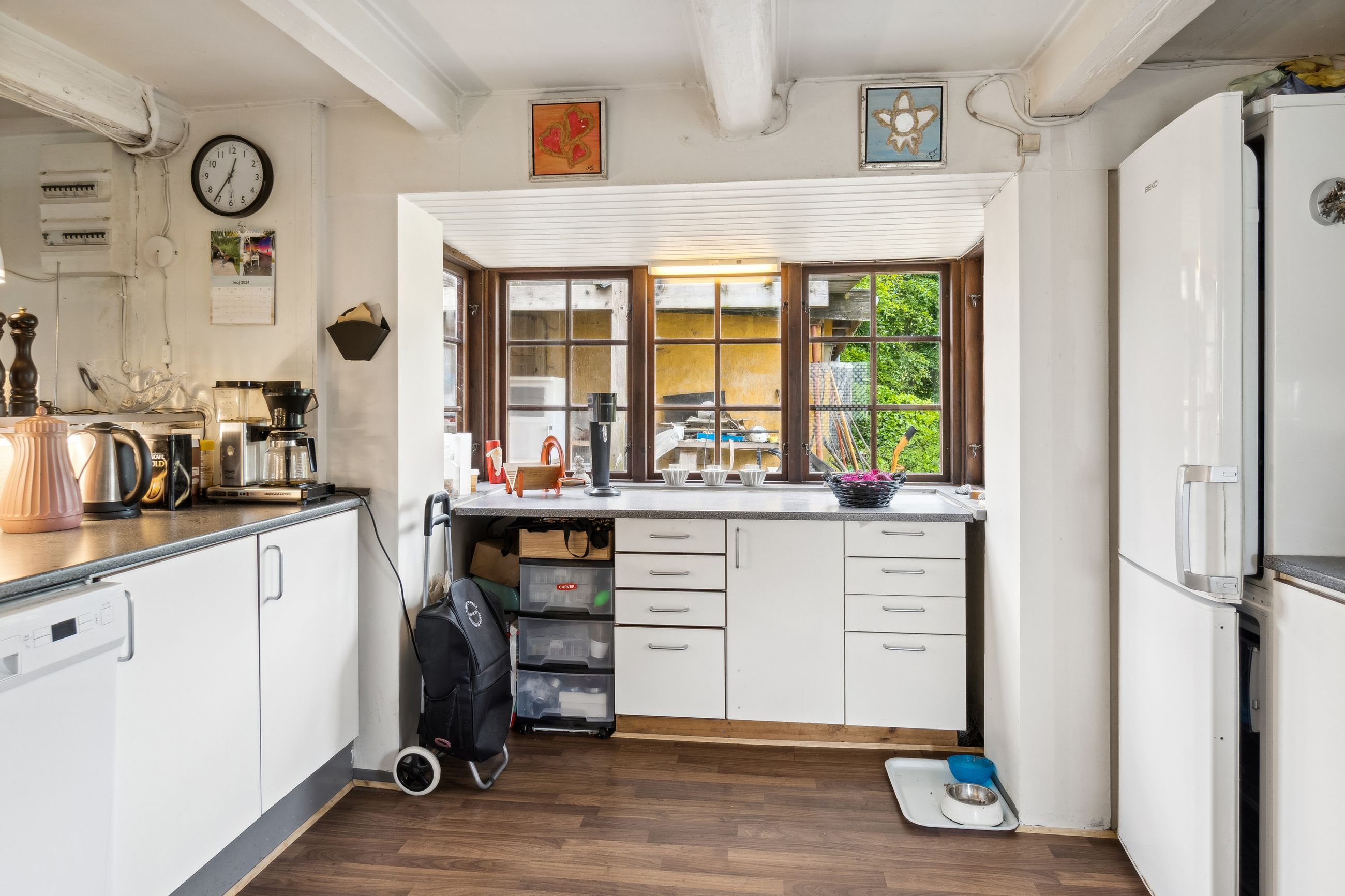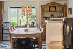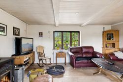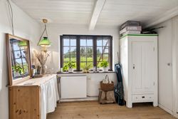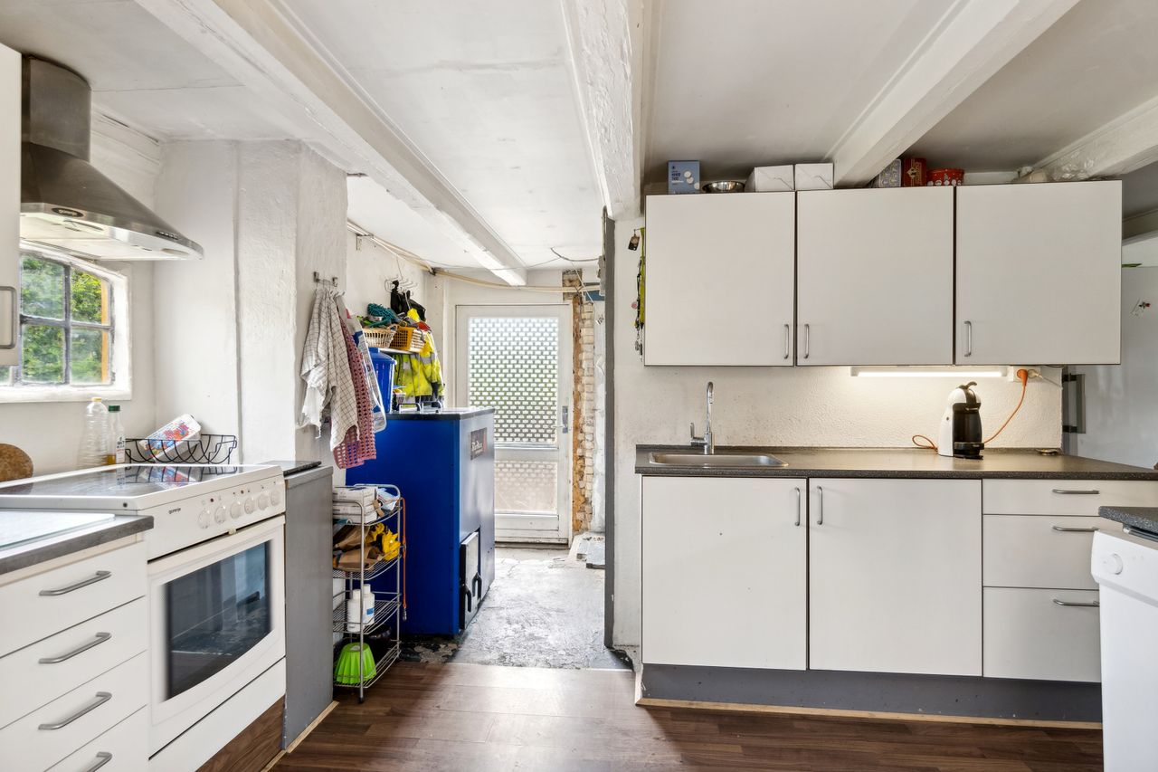 sprossede vinduer og en stemningsfuld brændeovn. Køkken-alrummet fremstår pænt med metalgreb på