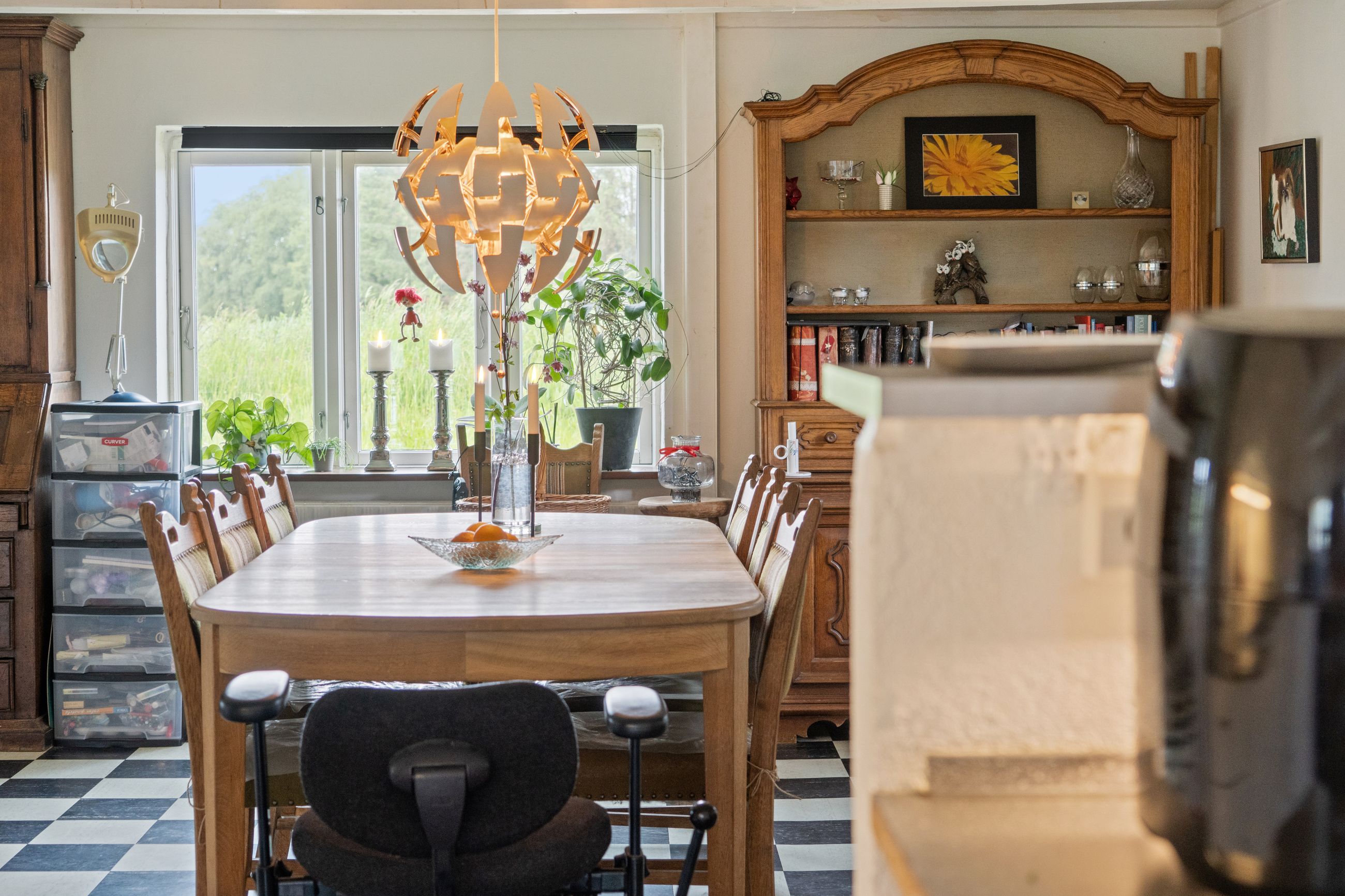 hvide fronter, og over halvvæggen er der frit udsyn til den store spiseafdeling. Stueplan afrundes af et