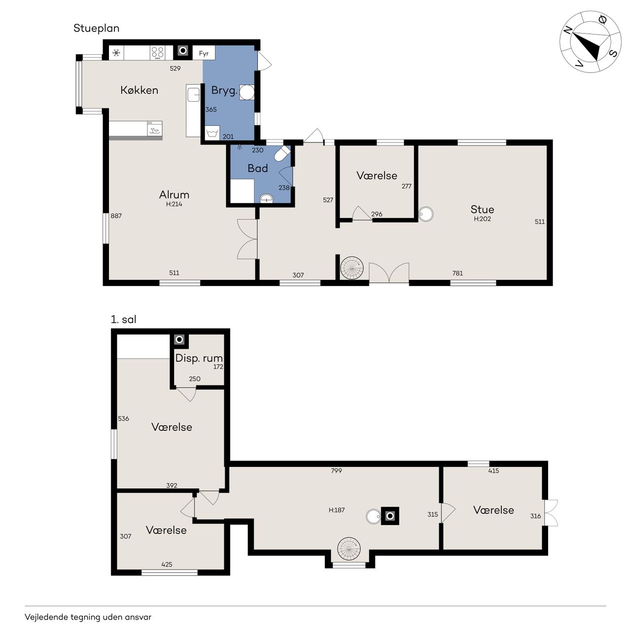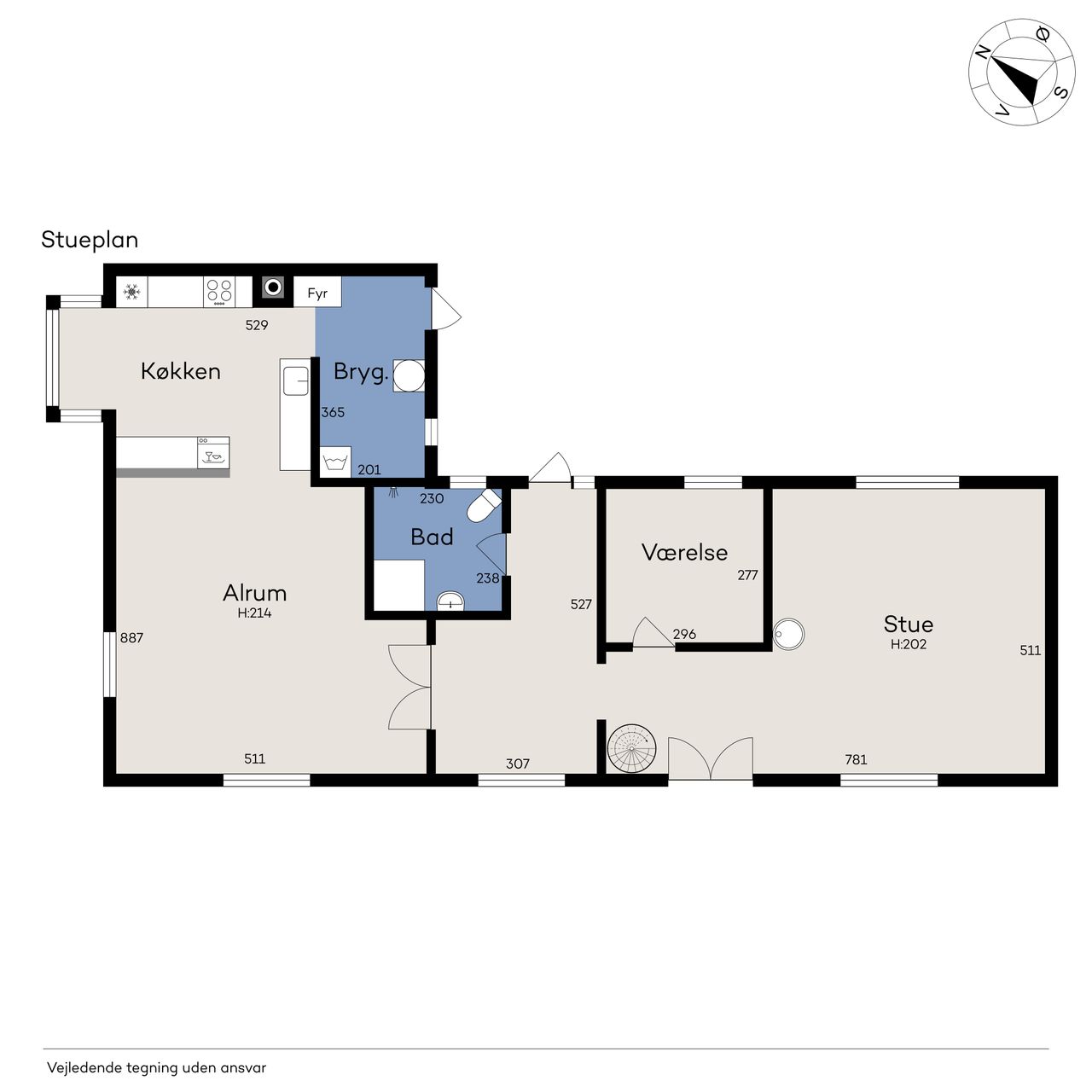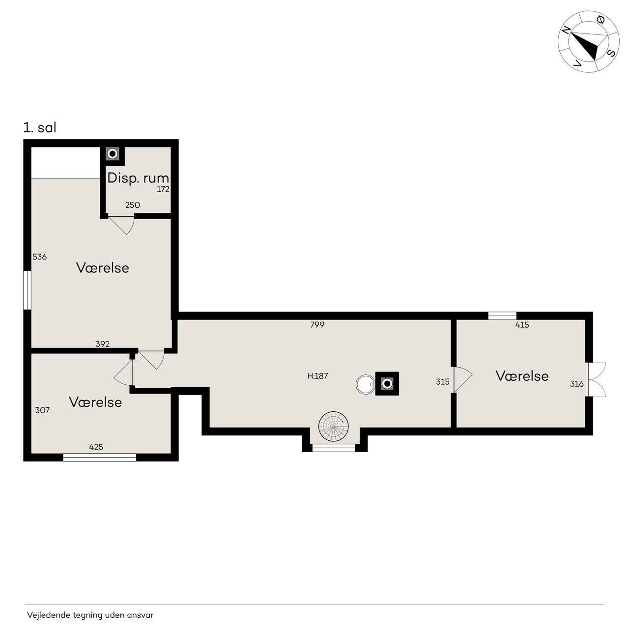 sydgavlen, mens den lille fordelingsgang i stuens modsatte ende giver adgang til to gode disponible