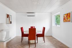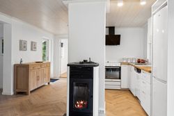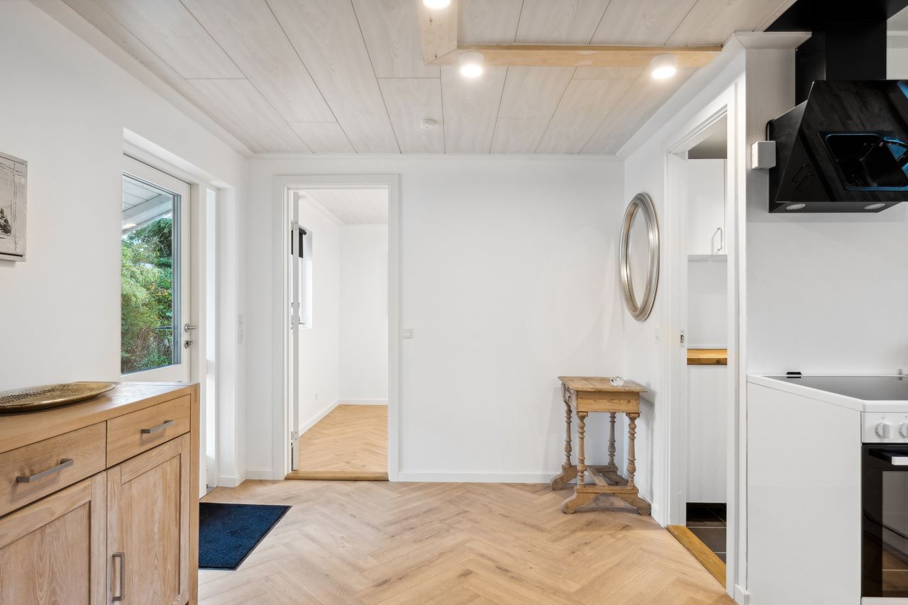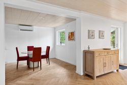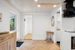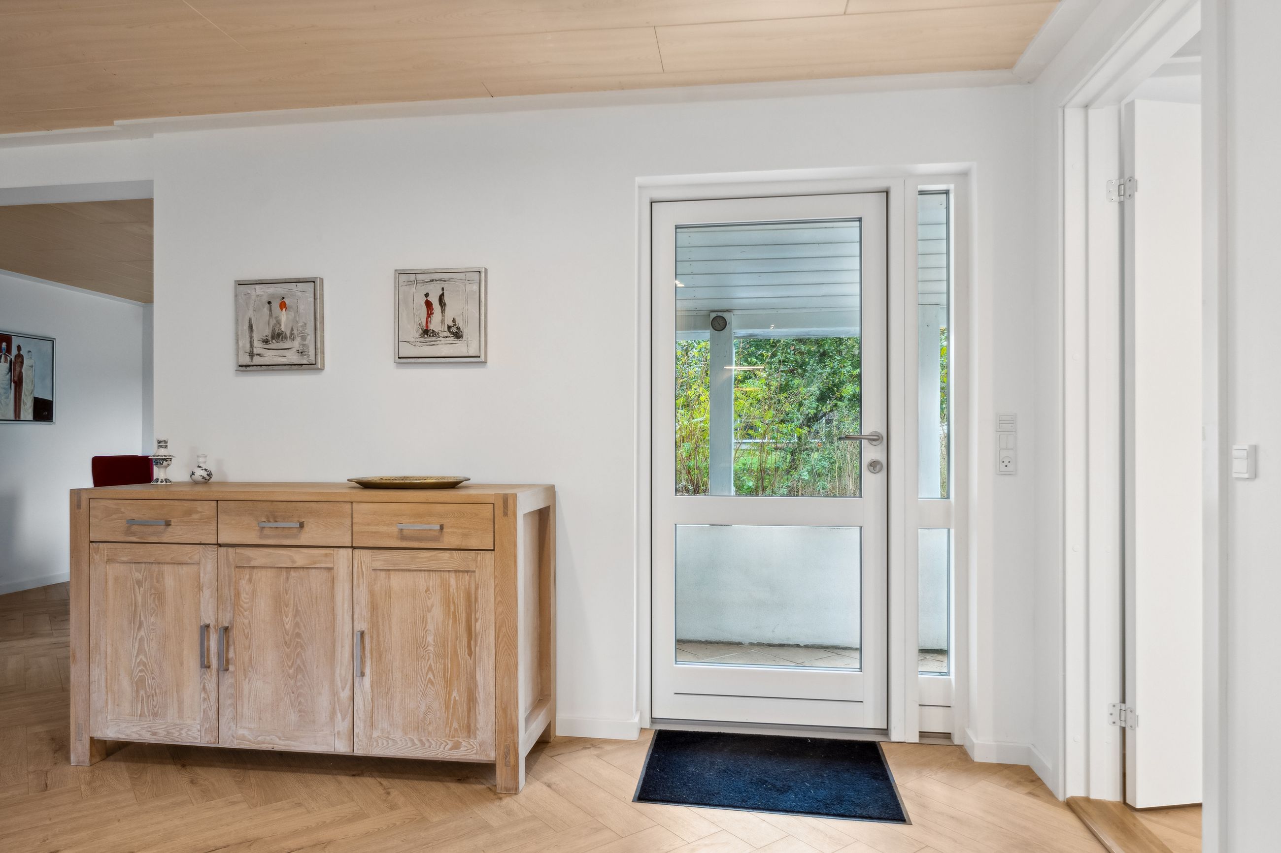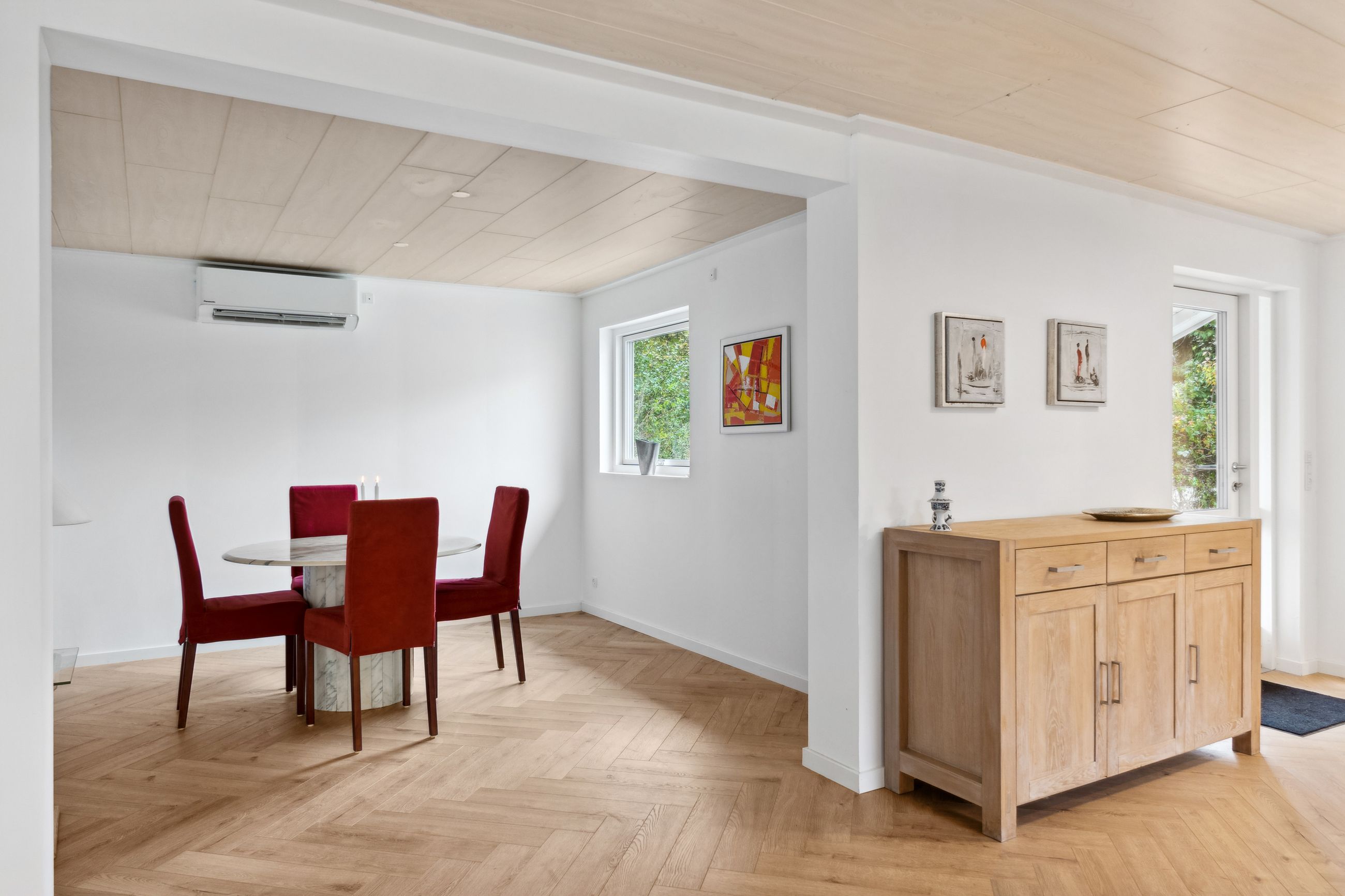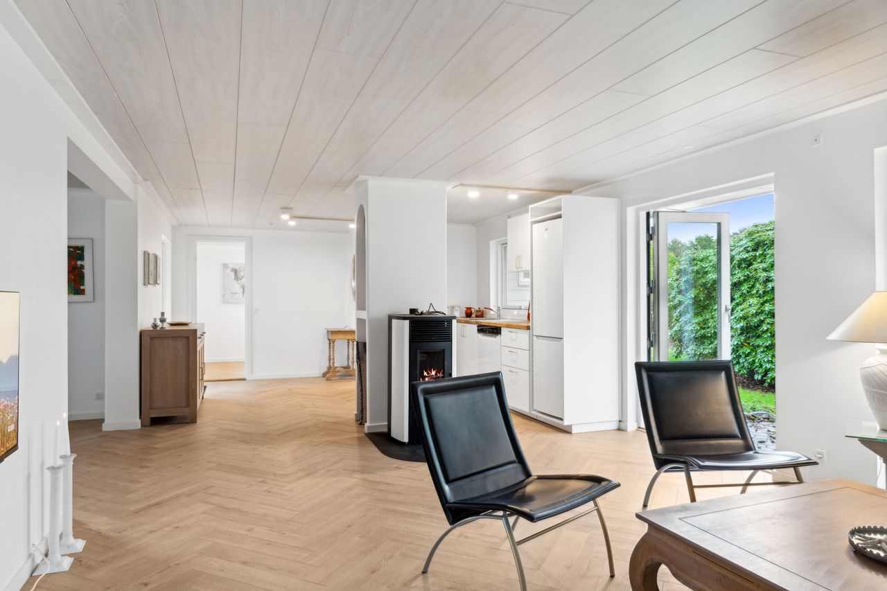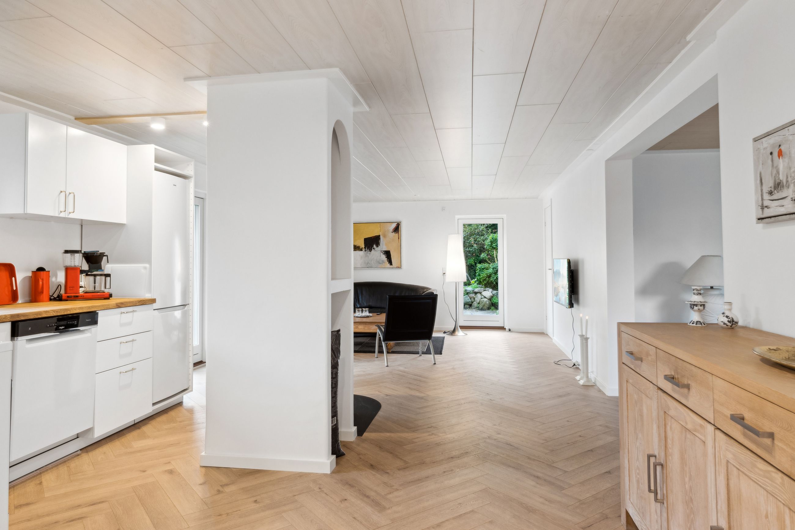 I træder direkte ind i det store opholdsrum, hvor køkken, stuer og entré er forenet. Læg mærke til det smukke gulv i sildebensmønster og de gennemgående lysindfald, der sammen med et tidssvarende køkken bidrager til den behagelige atmosfære.