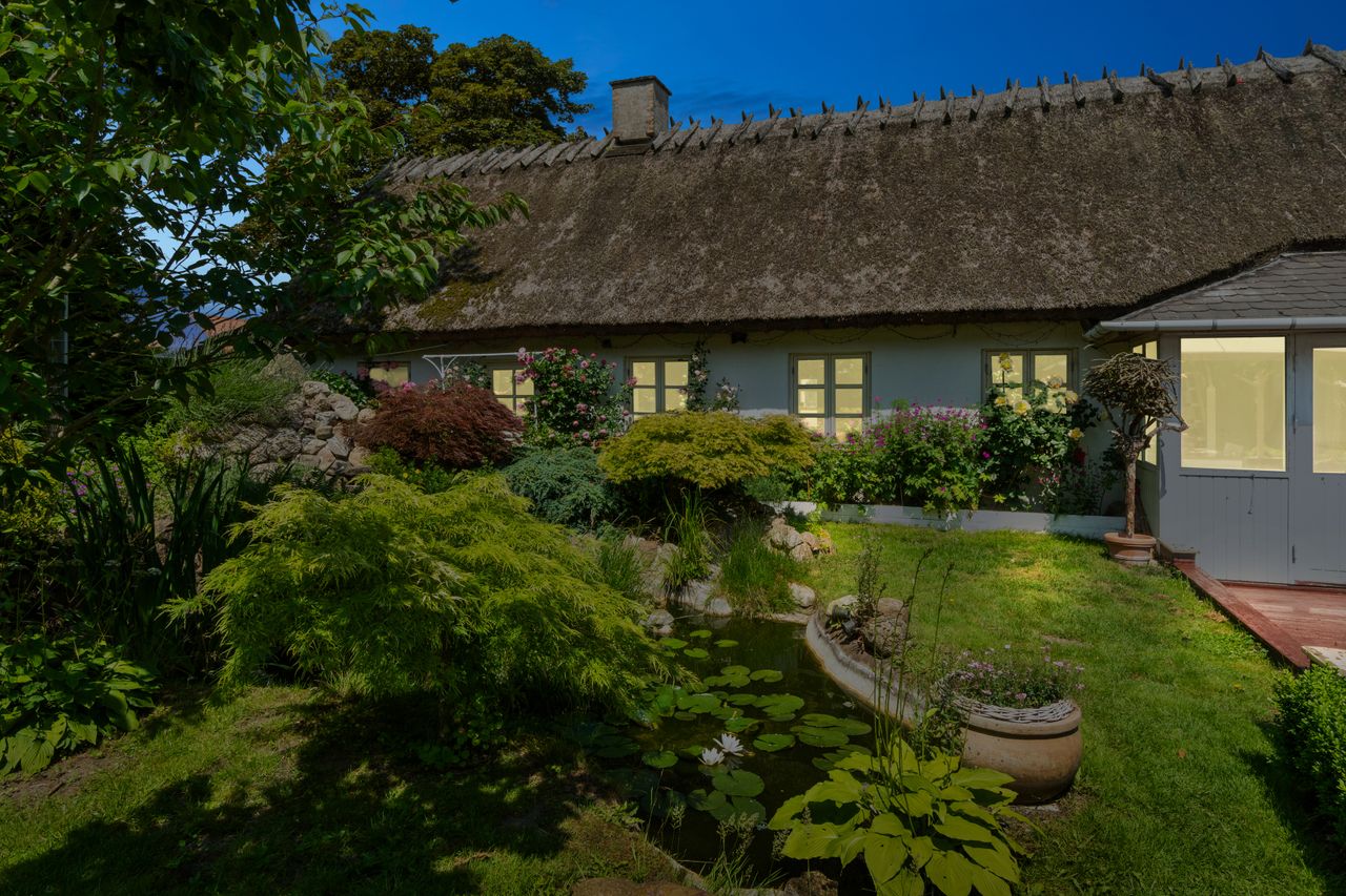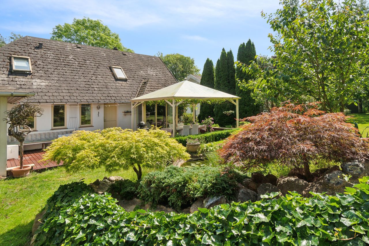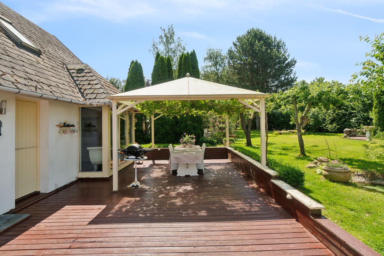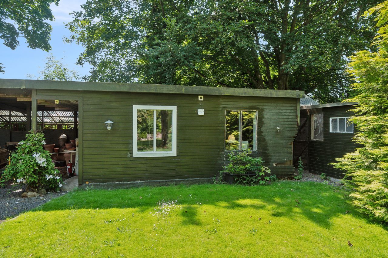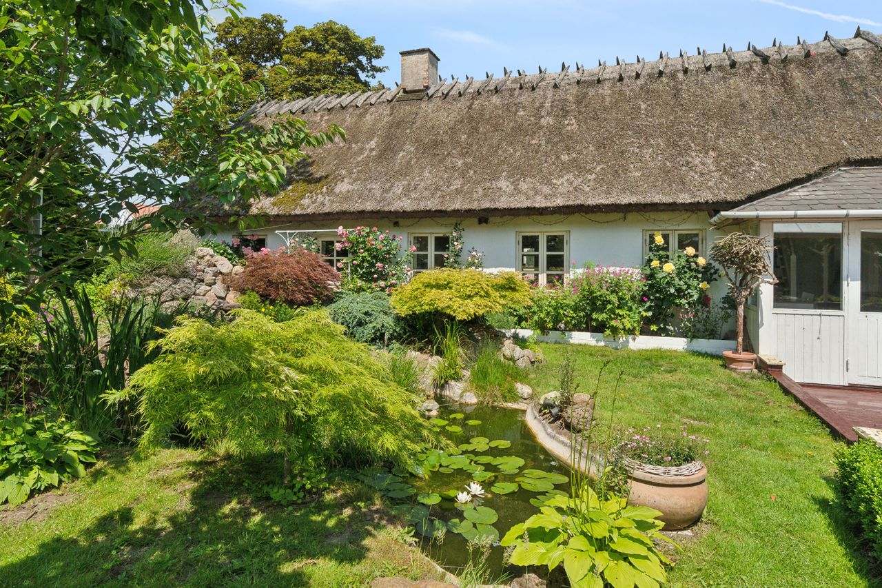 Haven er en sand oase – frodig og idyllisk anlagt med stensætninger, en charmerende havedam og flere solkroge og terrasser. Den store træterrasse med pergola og vinplanter er et perfekt sted at nyde solskinnet, og et af de gamle bygninger er blevet forvandlet til et skønt orangeri. Derudover finder I flere udhuse og skure, som giver ekstra opbevaringsmuligheder.