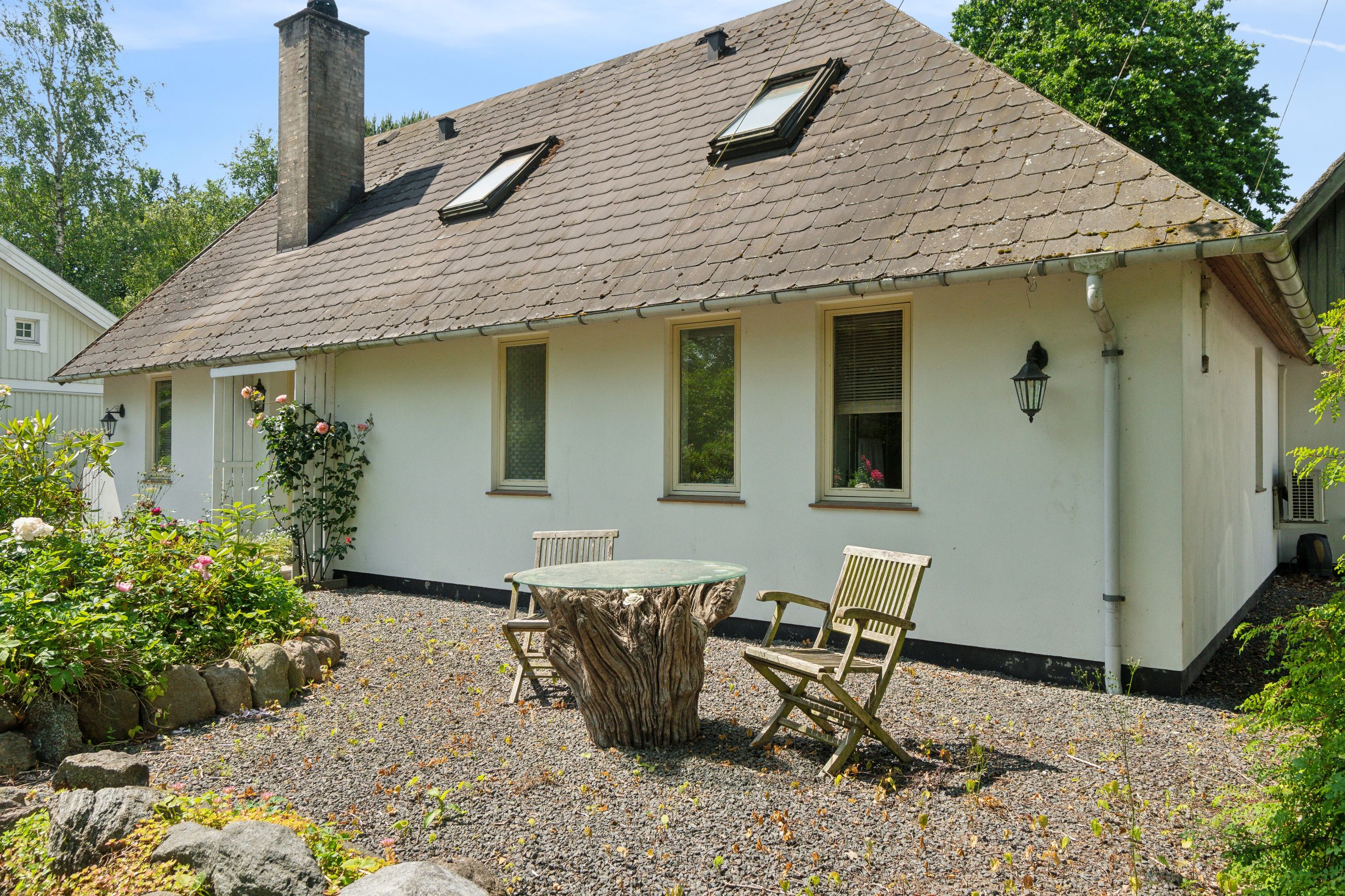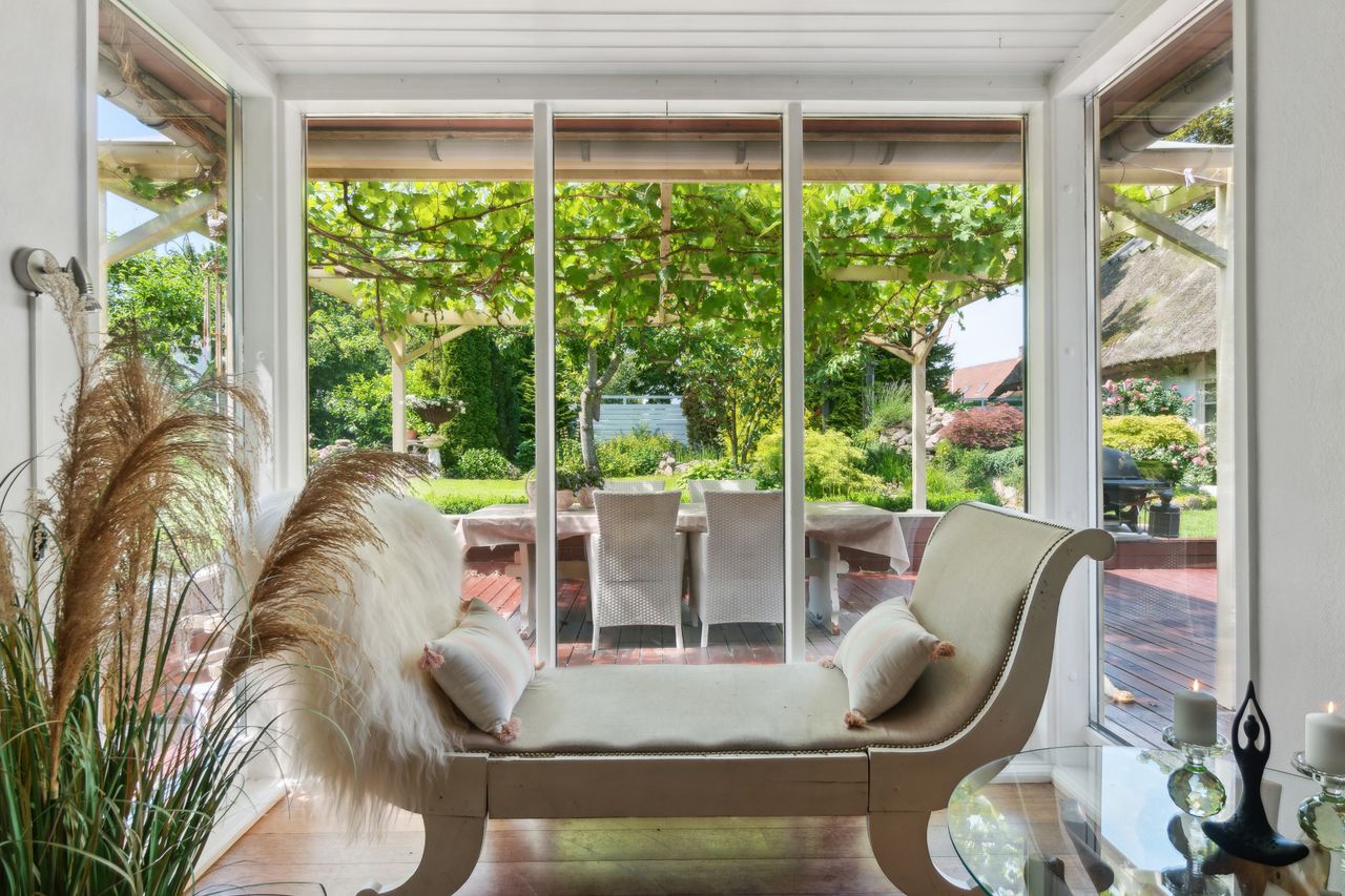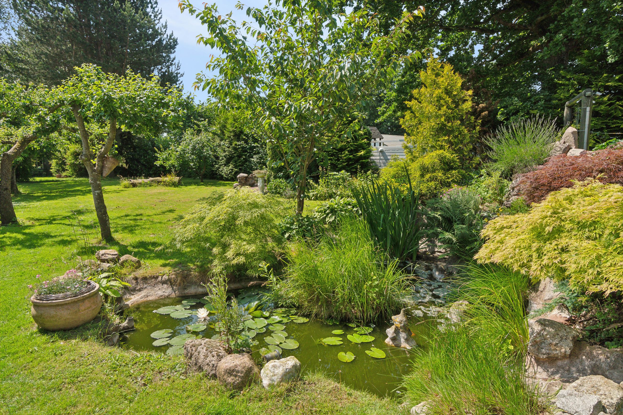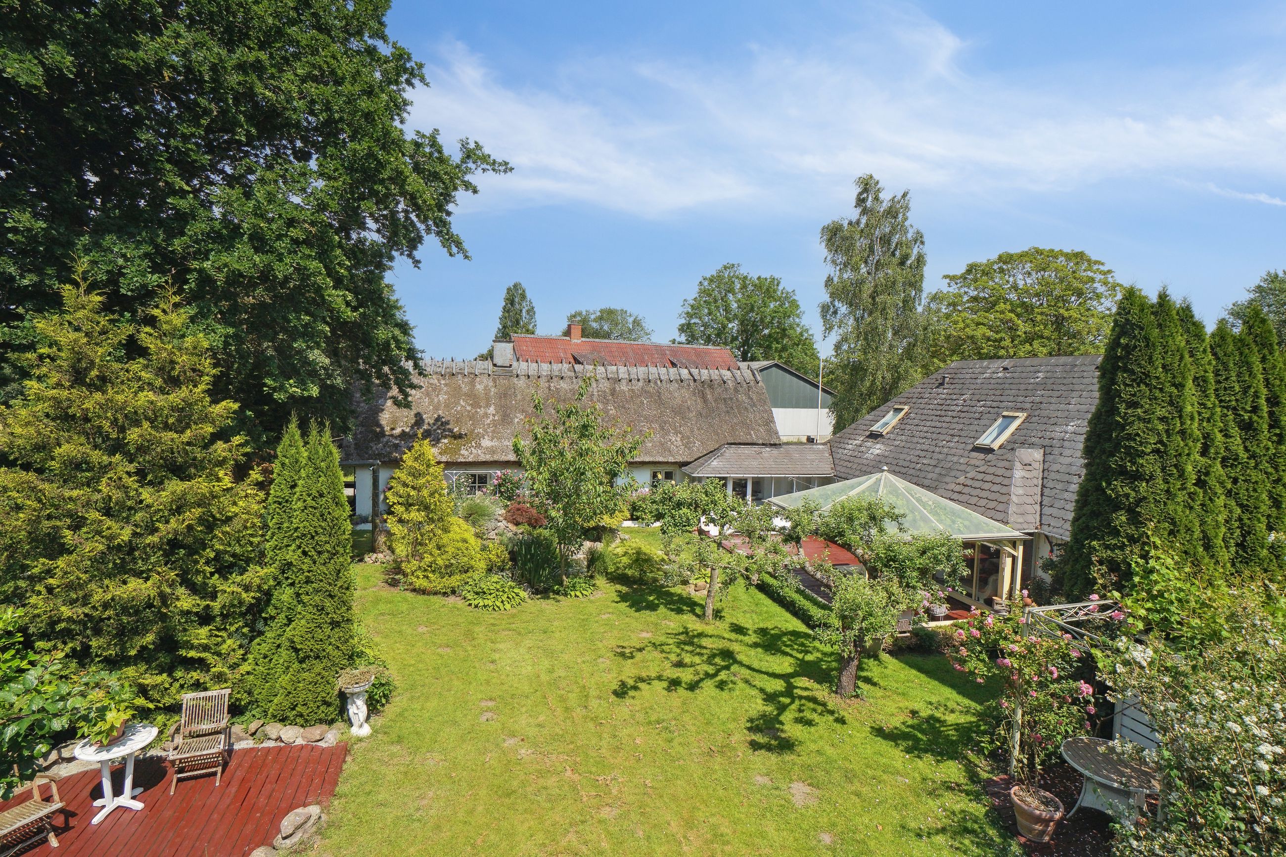 Haven er en sand oase – frodig og idyllisk anlagt med stensætninger, en charmerende havedam og flere solkroge og terrasser. Den store træterrasse med pergola og vinplanter er et perfekt sted at nyde solskinnet, og et af de gamle bygninger er blevet forvandlet til et skønt orangeri. Derudover finder I flere udhuse og skure, som giver ekstra opbevaringsmuligheder.