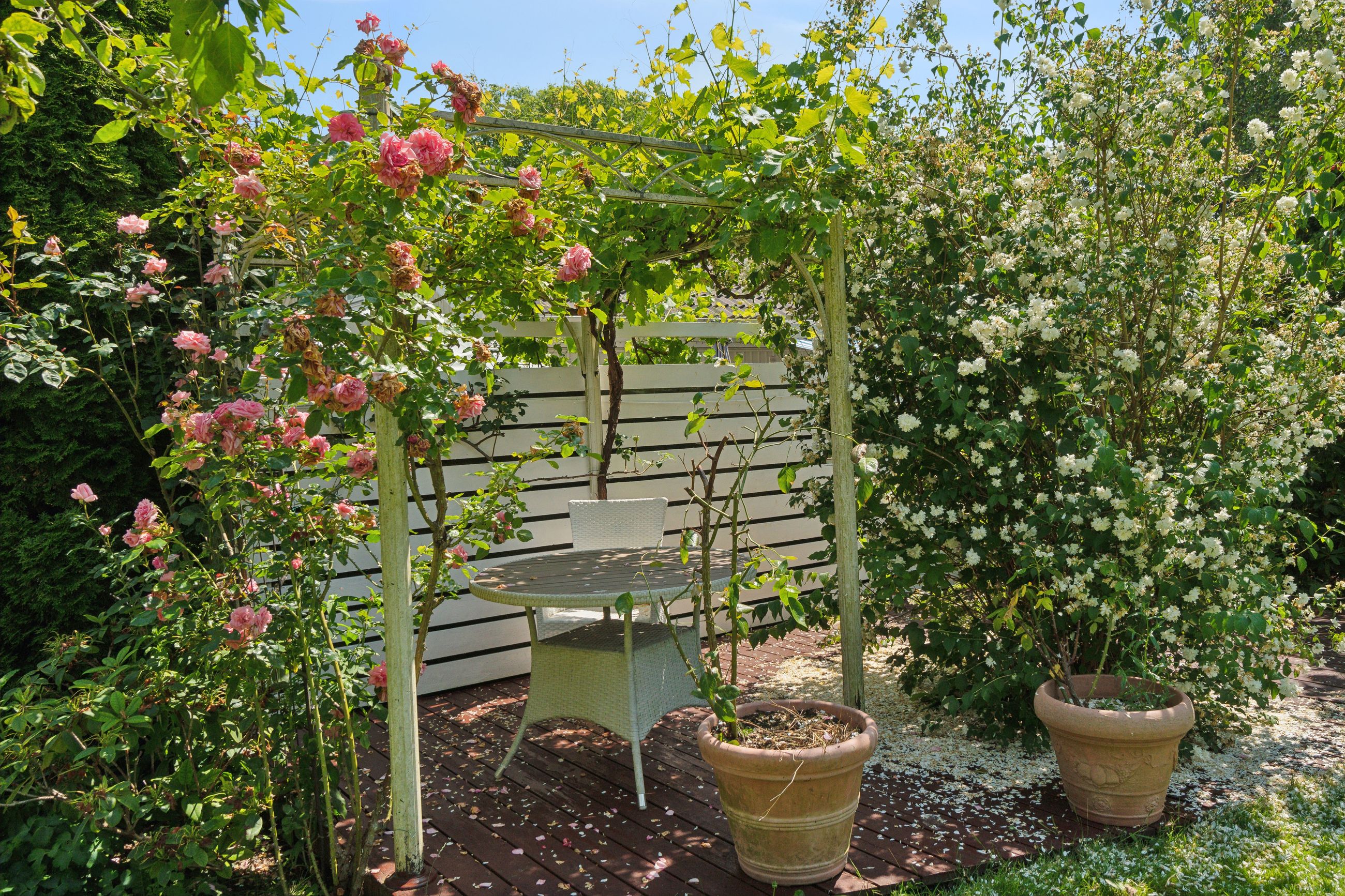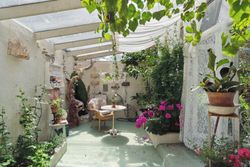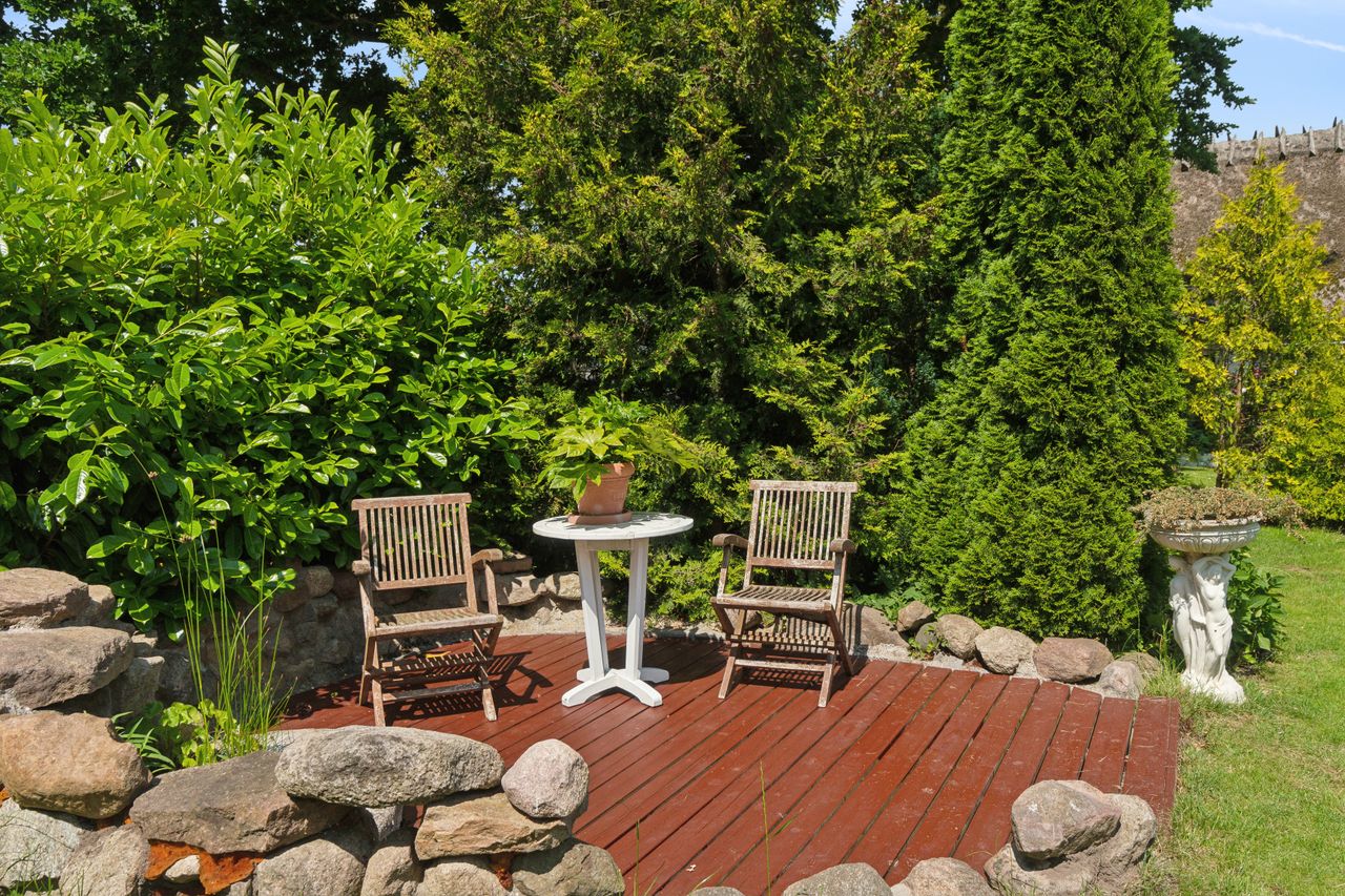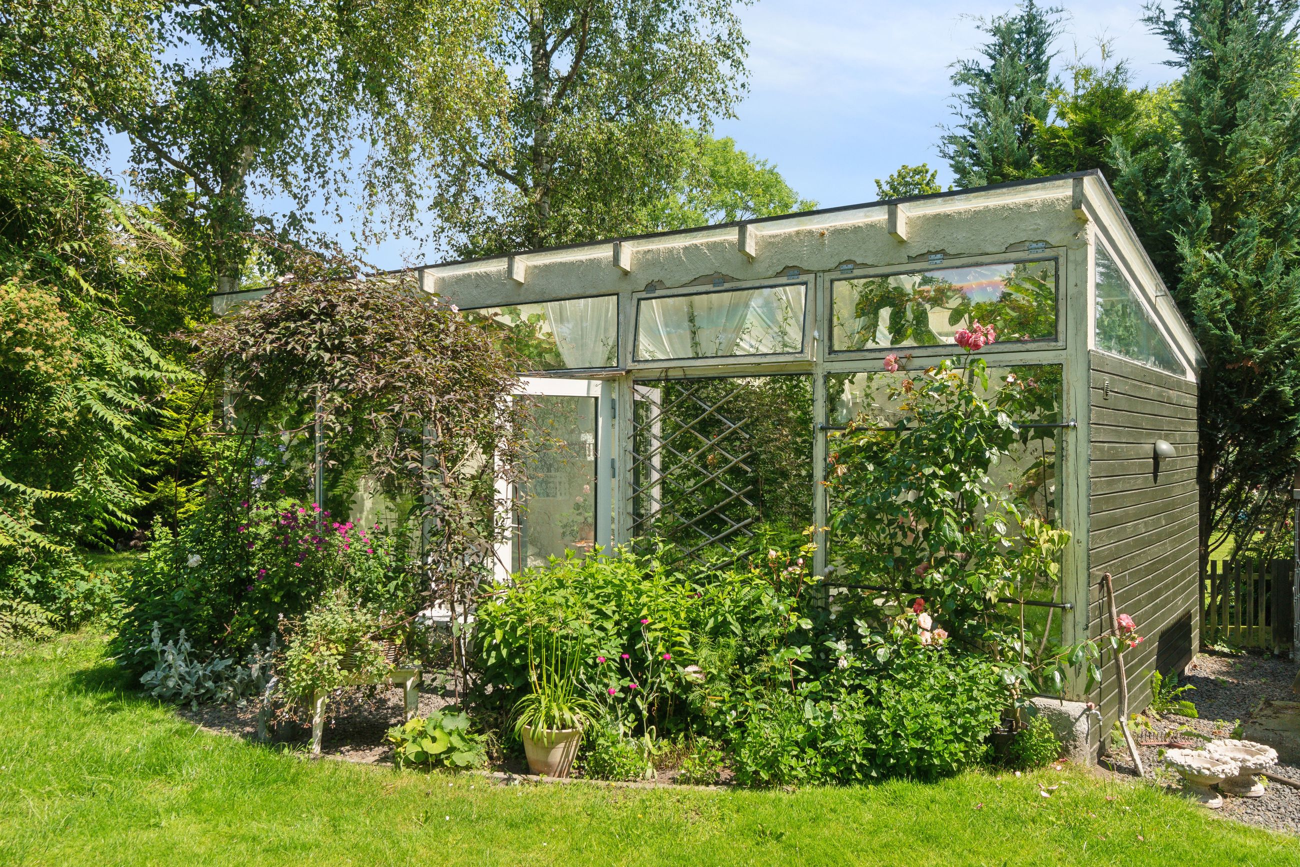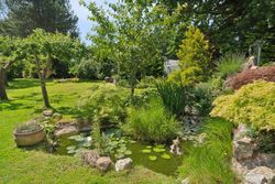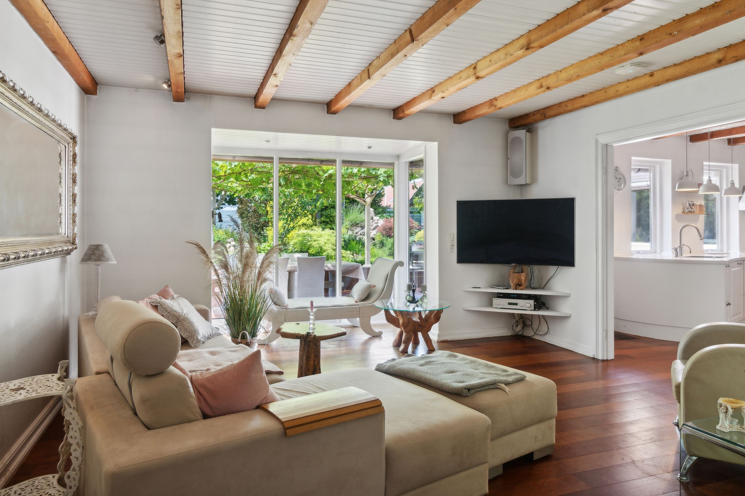 Haven er en sand oase – frodig og idyllisk anlagt med stensætninger, en charmerende havedam og flere solkroge og terrasser. Den store træterrasse med pergola og vinplanter er et perfekt sted at nyde solskinnet, og et af de gamle bygninger er blevet forvandlet til et skønt orangeri. Derudover finder I flere udhuse og skure, som giver ekstra opbevaringsmuligheder.