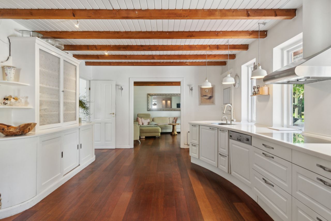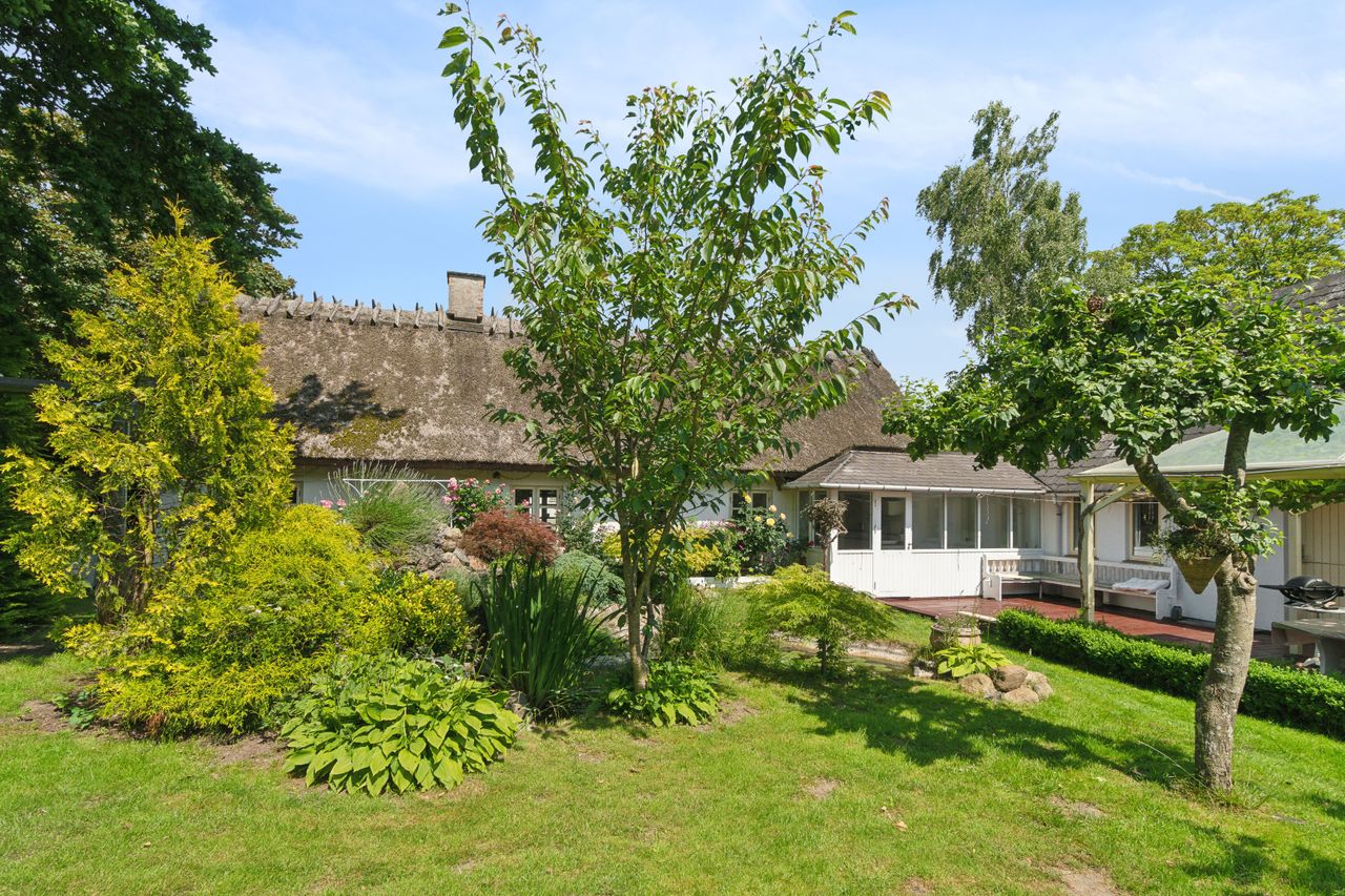 Ejendommens historie går helt tilbage til 1780, og den ældste bygning har et smukt stråtag, der tilføjer ekstra charme. Hver bolig er opført med førstesal og byder på et samlet boligareal på 252 m2. Det stråtækte hus rummer blandt andet et lyst køkken med terrassedør og to værelser, mens førstesalen indeholder et ekstra værelse og en dejlig stue med kiploft og synlige hanebånd. Huset har også et badeværelse og et praktisk depotrum. Mellem de to huse er der et praktisk gangareal med bryggers. I hus nummer to finder I et stort spisekøkken, der er åbent mod en hyggelig stue med trægulv og synlige loftsbjælker. Her er også en brændeovn og en smuk glaskarnap. Denne boligafdeling rummer desuden tre gode værelser, et gæstetoilet og et badeværelse.