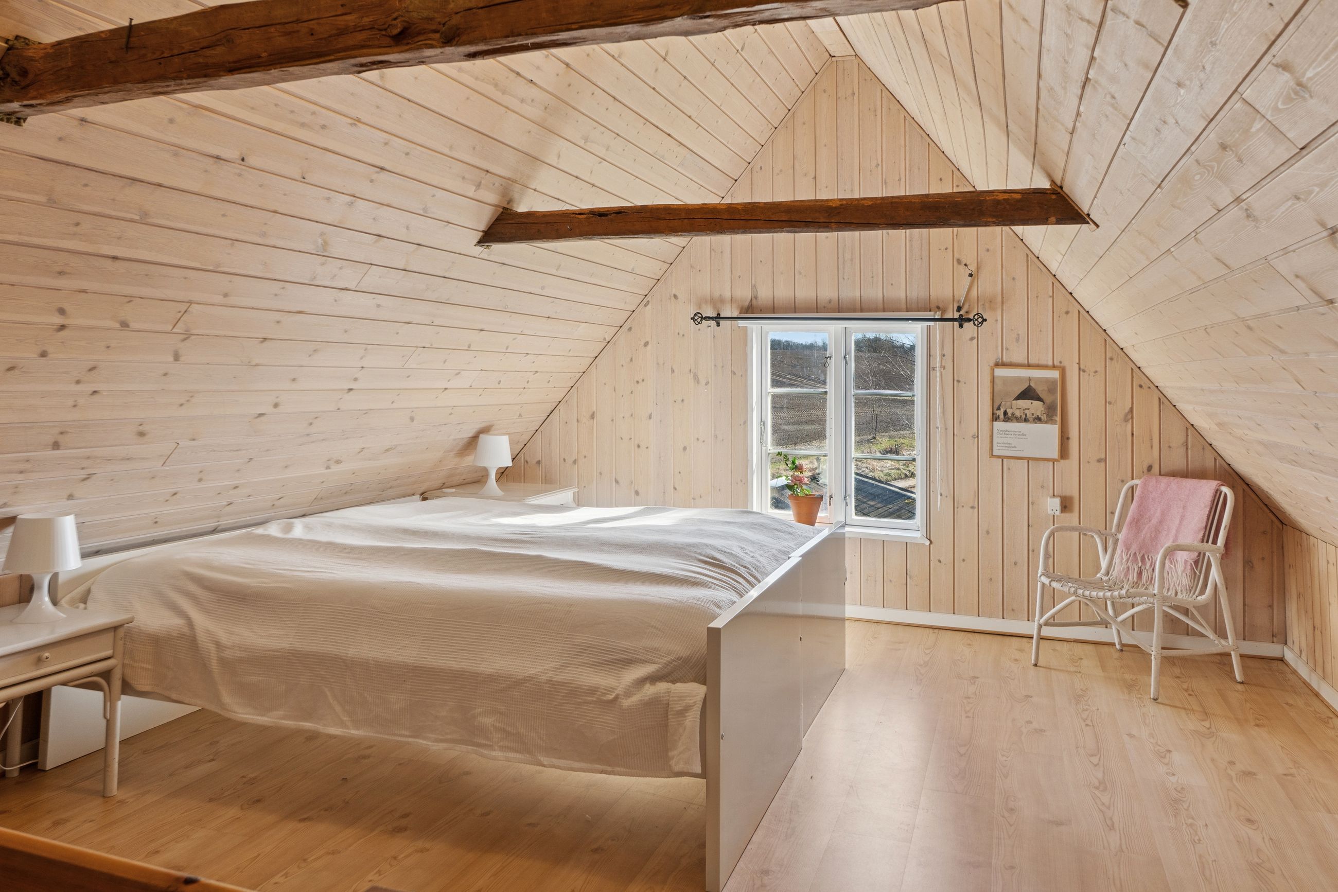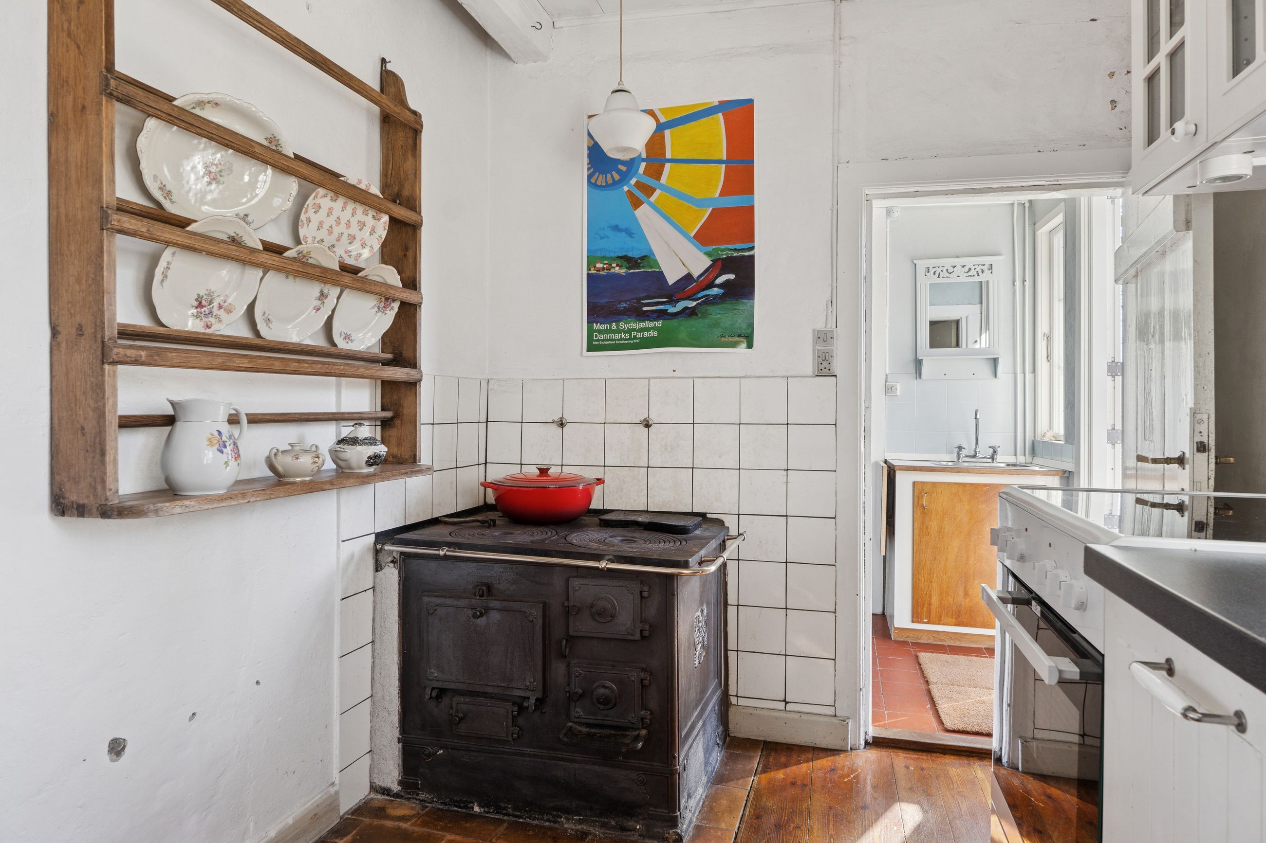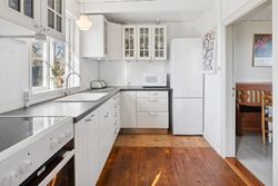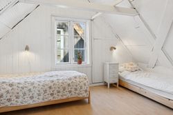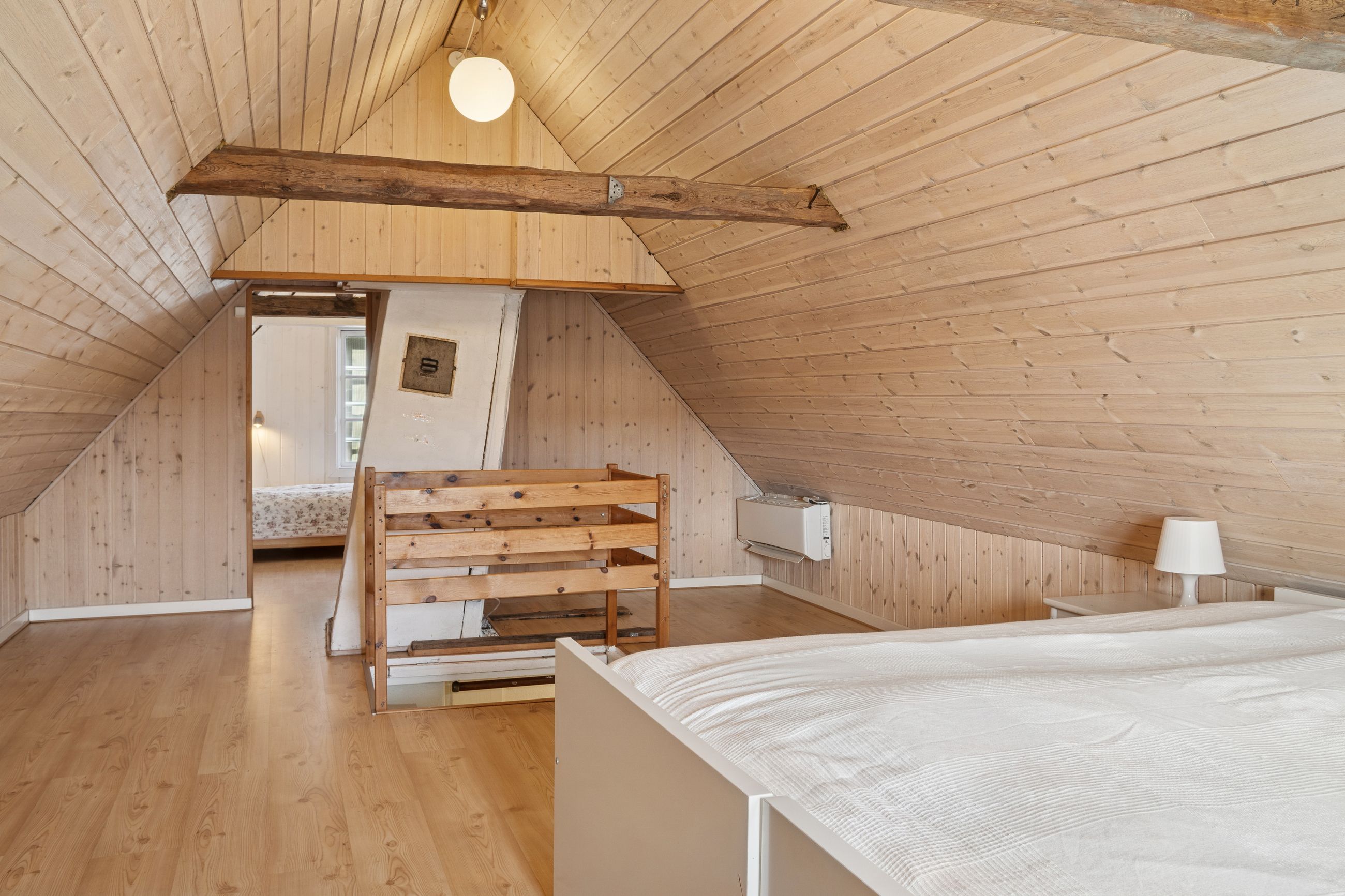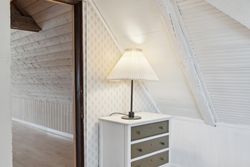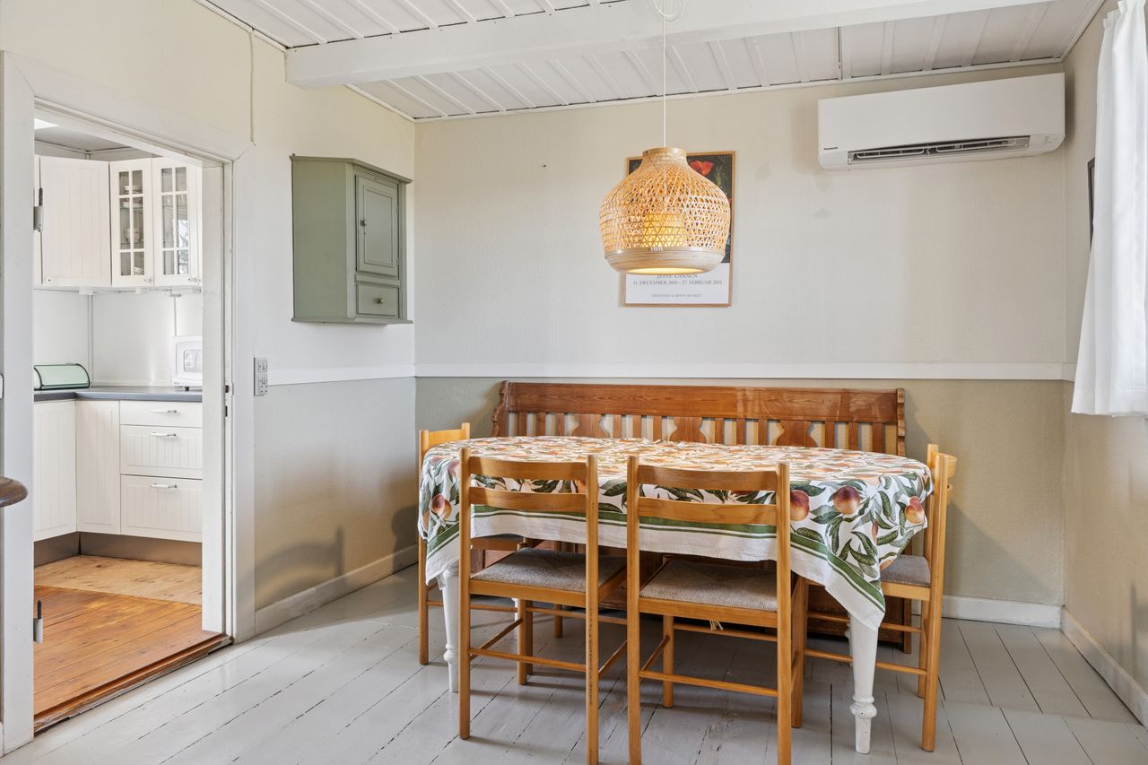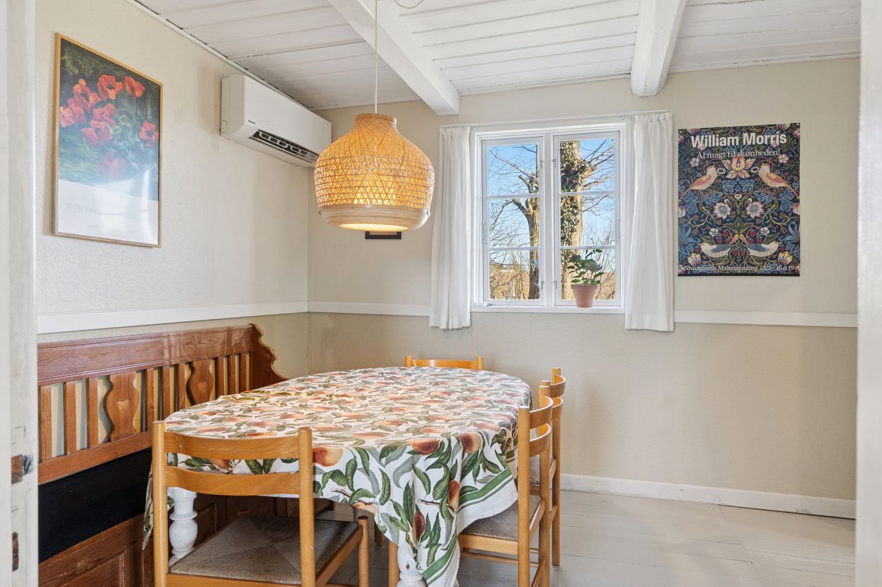 Huset er indrettet med en rummelig stue, hvor lysindfaldet er særdeles behageligt, og videre i stueplanet er der arrangeret en spisestue tilstødende det pæne, funktionelle køkken, som indeholder gammelt autentisk brændekomfur såvel som nyere komfur fra 2024. Et badeværelse fuldender etagen, som overalt har en rigtig god loftshøjde, mens I på førstesalen tilgodeses af to værelser.