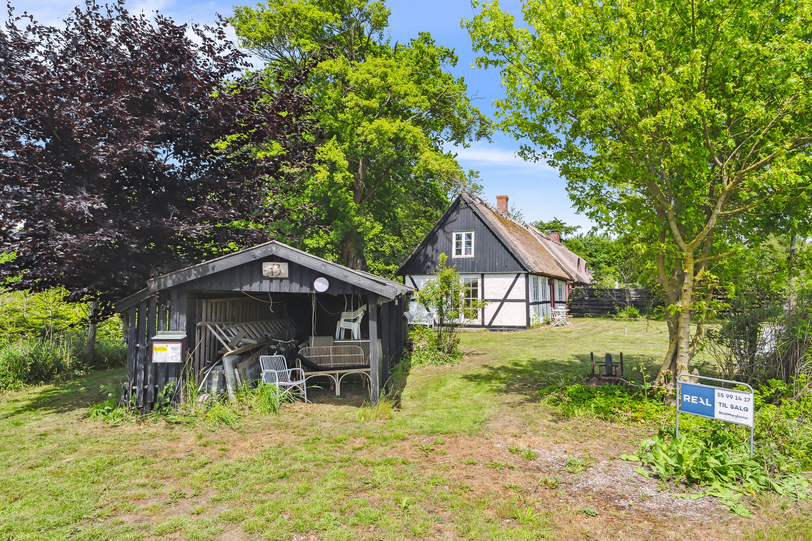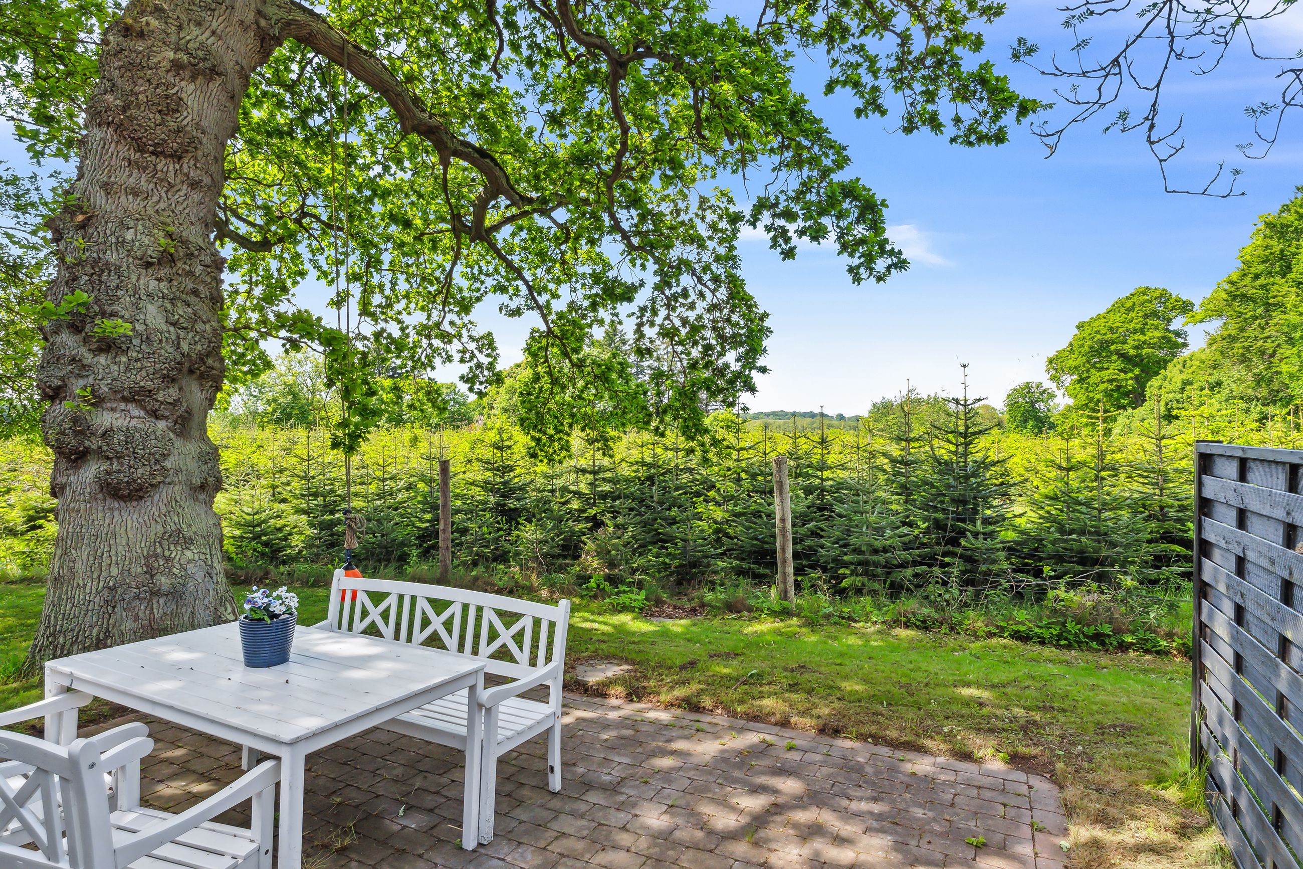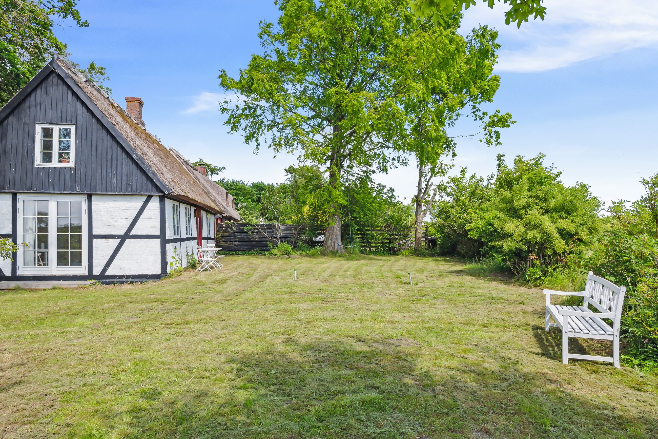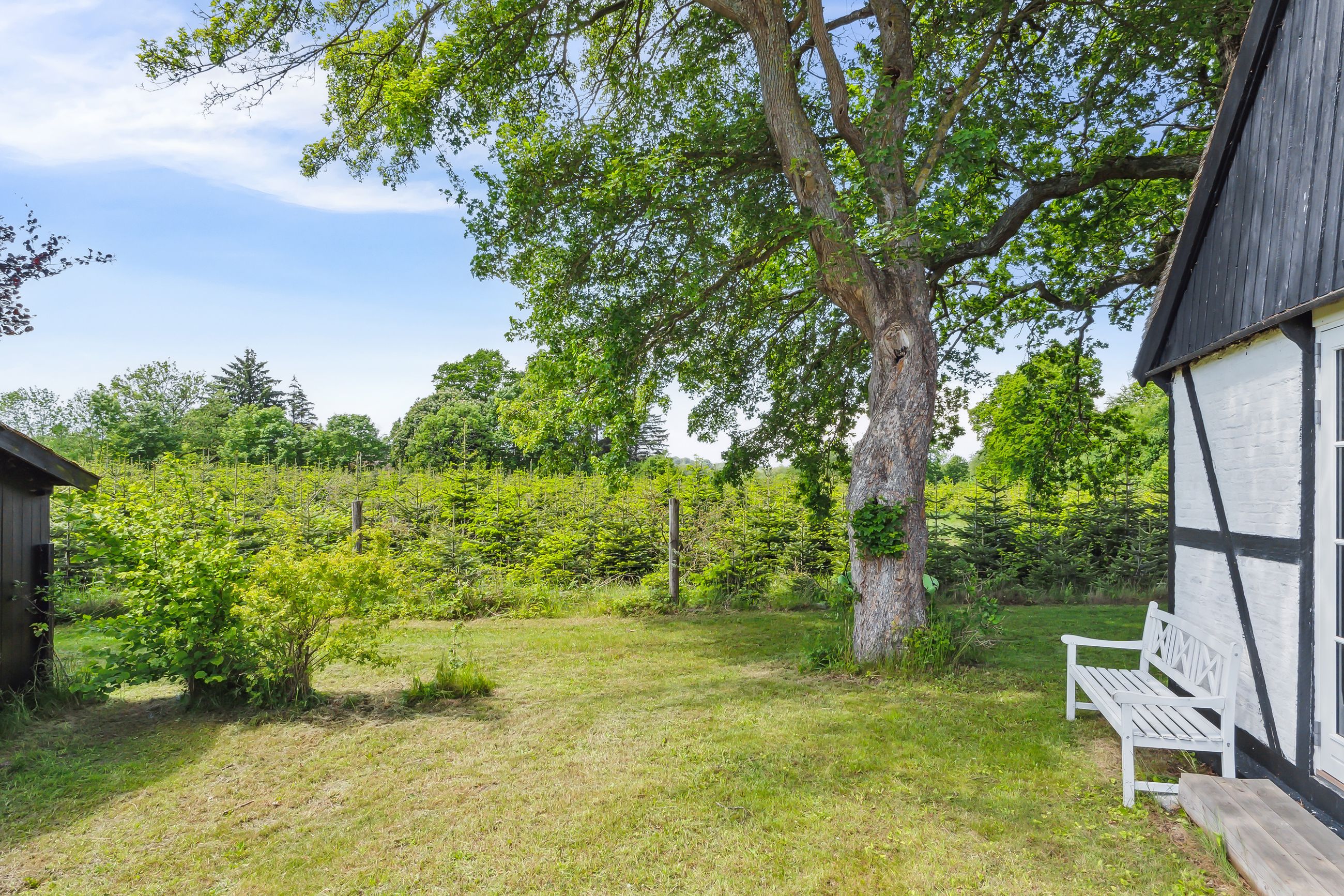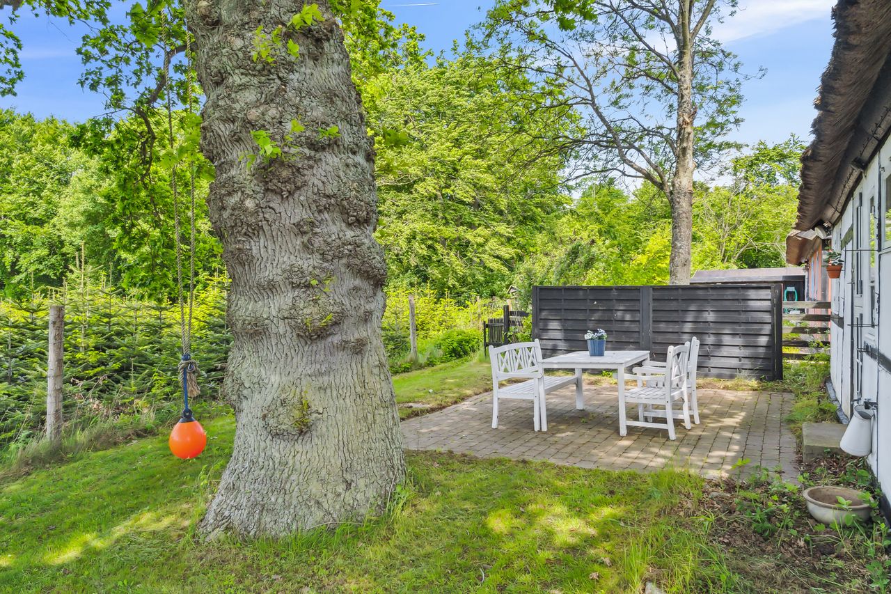 Haven understøtter til fulde sommerhusets udtryk. Her er store, gamle træer, som om sommeren kaster svalende skygge på den ellers overordentligt solrige grund. Beplantningen er holdt i en vedligeholdelseslet facon, og sidst, men ikke mindst, står der på matriklen en carport.