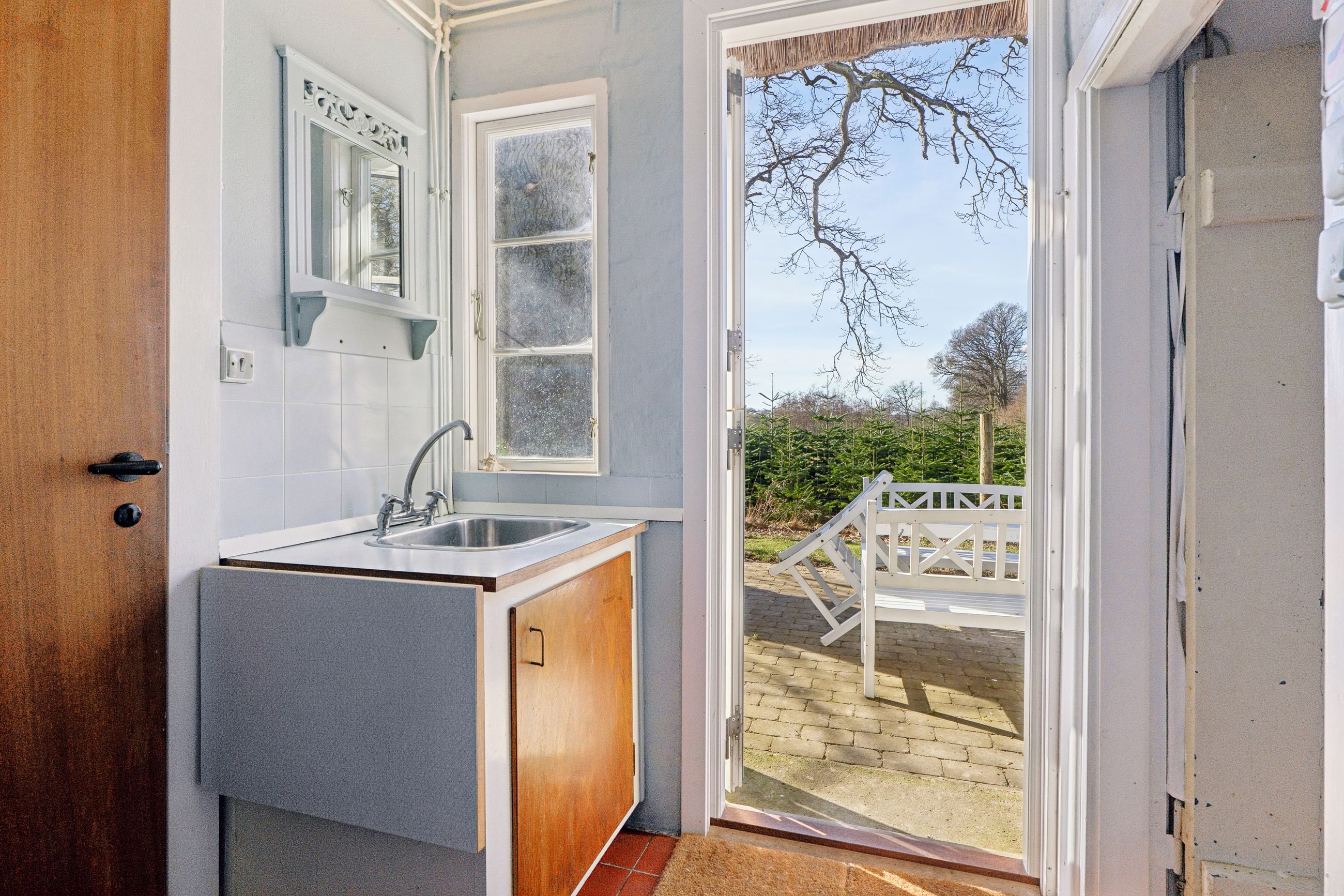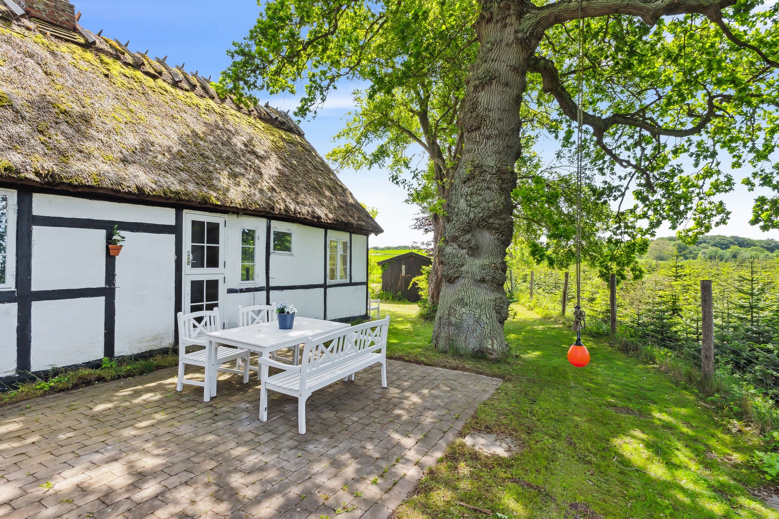 Bare et par kilometer nord for Præstø ligger dette uhyre charmerende og autentiske fritidshus. Æstetikken med sort bindingsværk, hvide tavl og stråtag passer perfekt ind i de naturskønne og yderst fredelige omgivelser, og netop naturen med fjorden og skoven er med til at understrege den helt særlige idyl, som opleves på Oregaardsvængevej 13.
