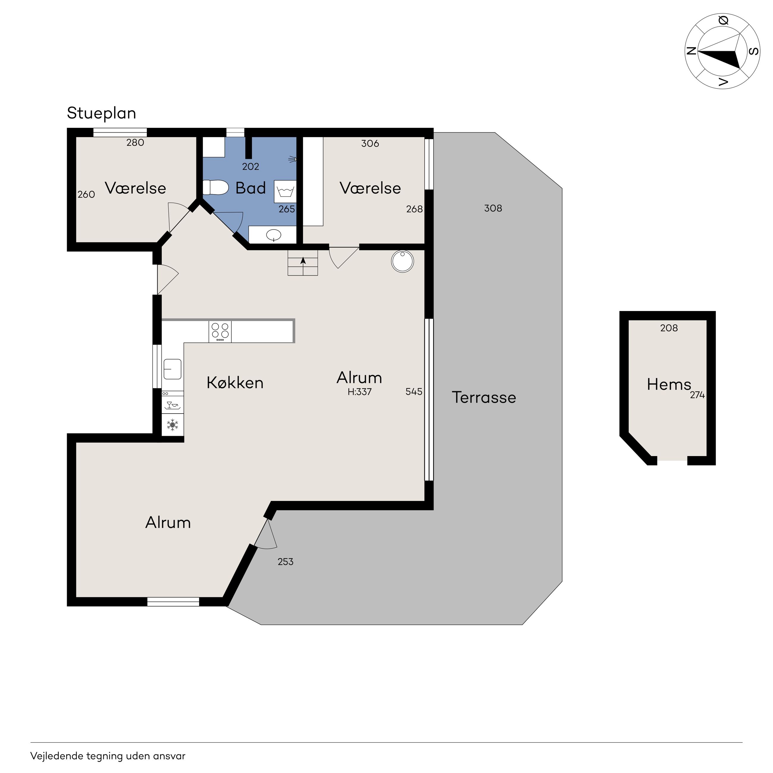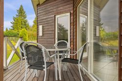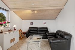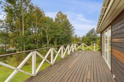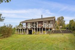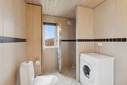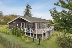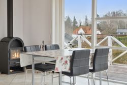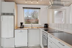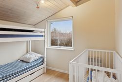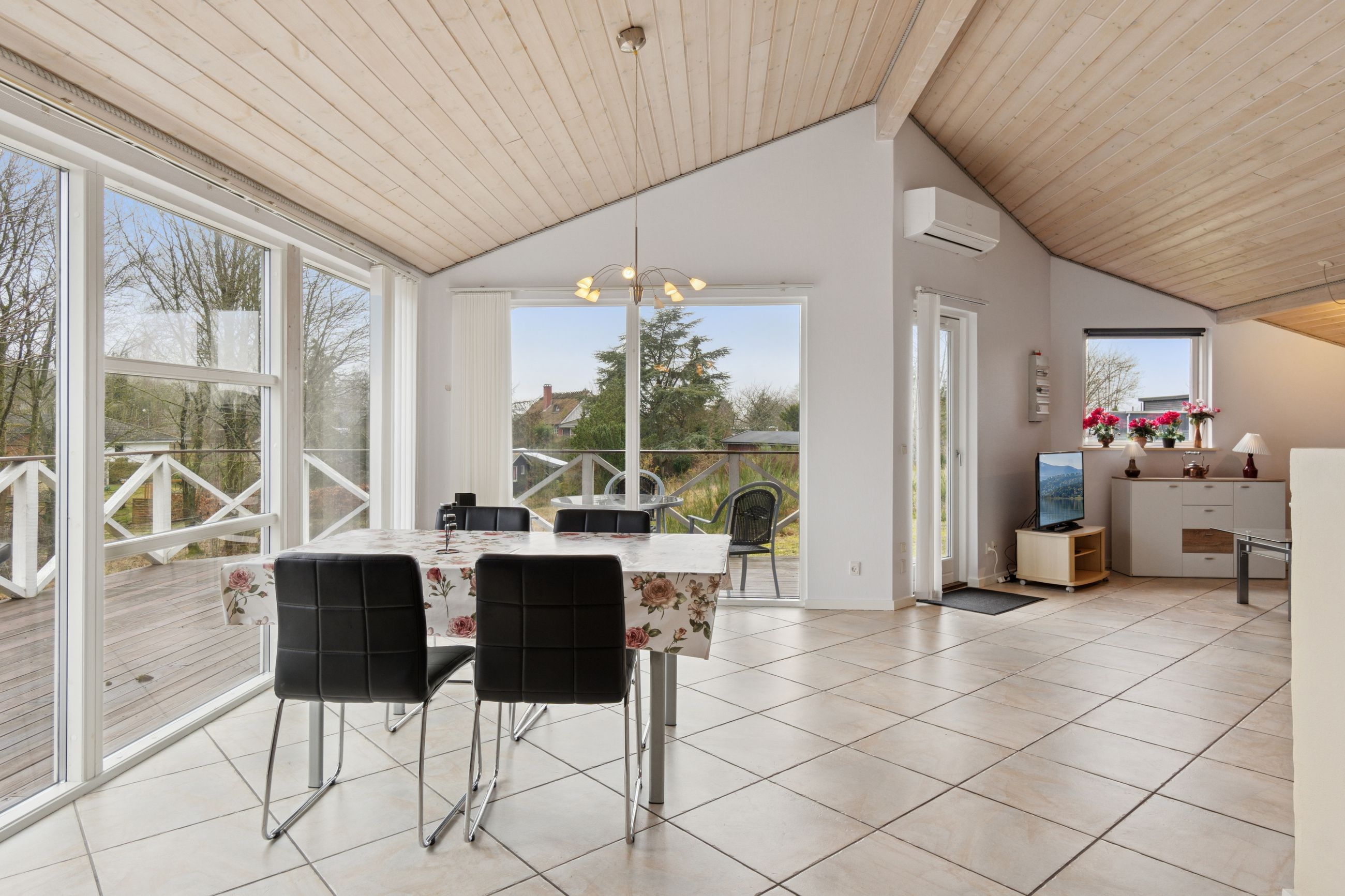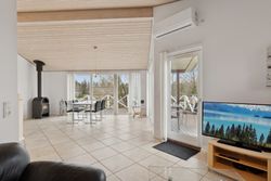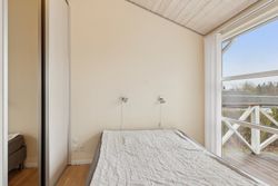 De høje vinduespartier i stuen, som ligger i åben forbindelse med køkken-alrummet, sikrer et rigt lysindfald. Herfra er der desuden adgang til en "hems". Luft-til-luft-varmepumpen fra 2022 og brændeovnen sørger for en behagelig atmosfære året rundt, hvilket gør det dejligt at opholde sig her selv om vinteren. Beklædt med lærketræ og godt isoleret kombinerer huset således komforten med den naturlige æstetik, der kendetegner et klassisk fritidshus.