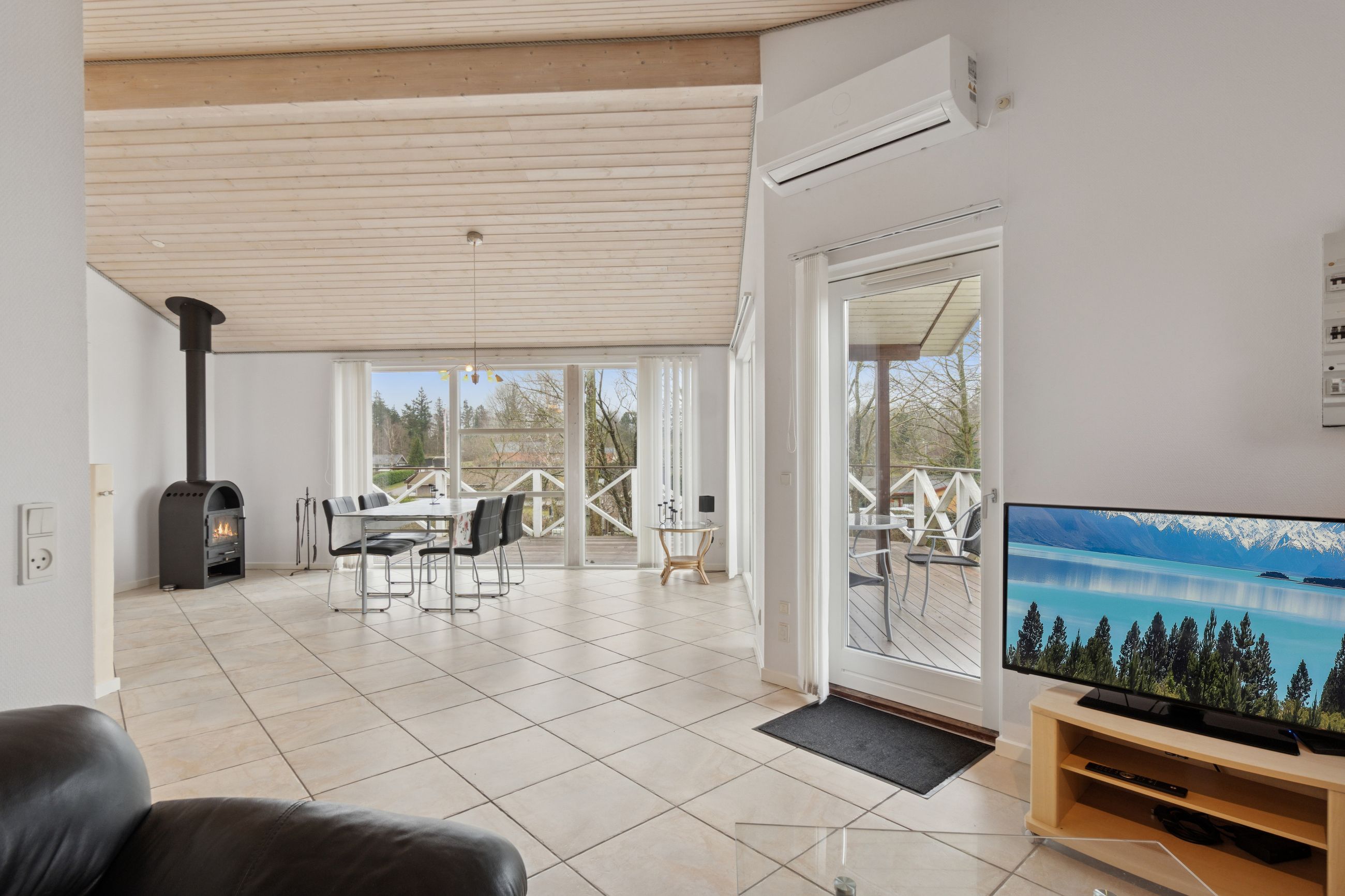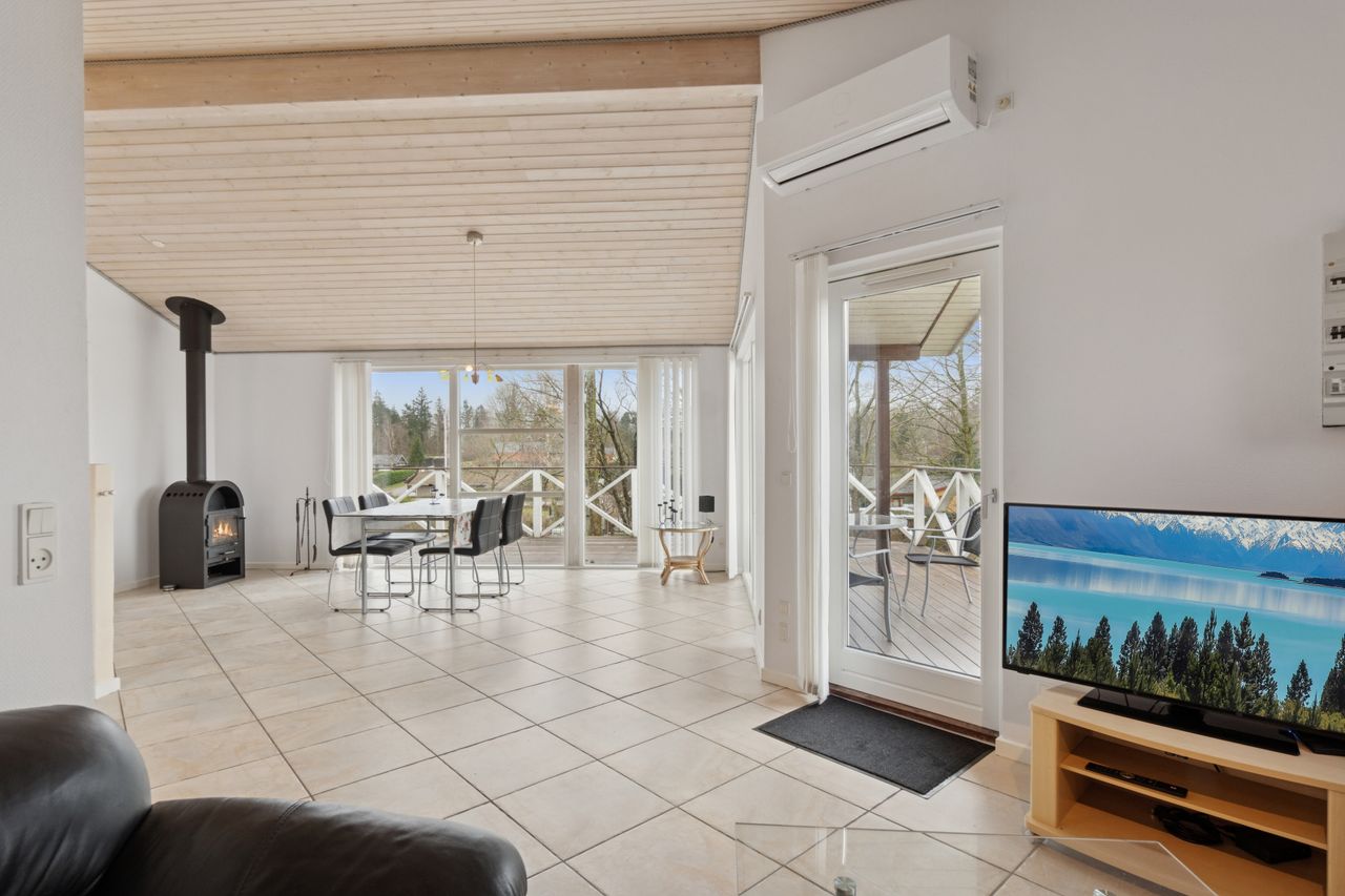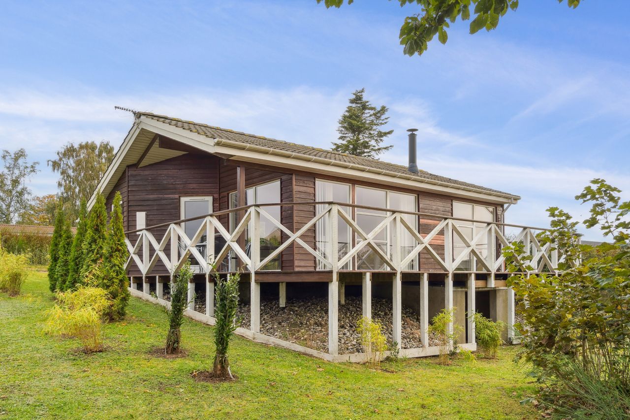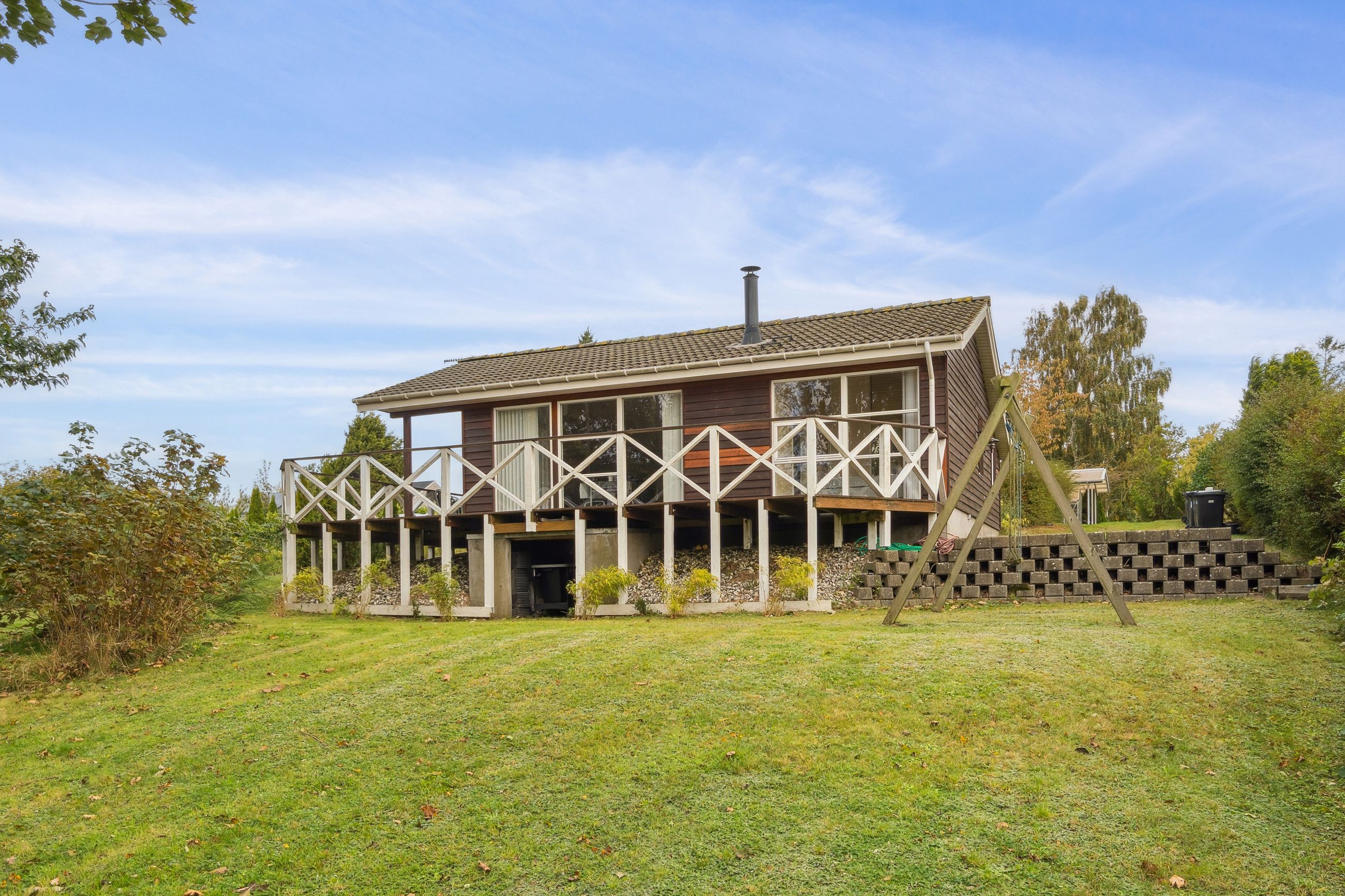 Fritidshuset er strategisk placeret højt i landskabet, hvilket giver et fantastisk udsyn over området. Den store terrasse er perfekt placeret mod syd og vest så solrige dage kan nydes i fulde drag herude, og dette naturlige lys vil I også opleve indenfor, hvor indretningen er indbydende.