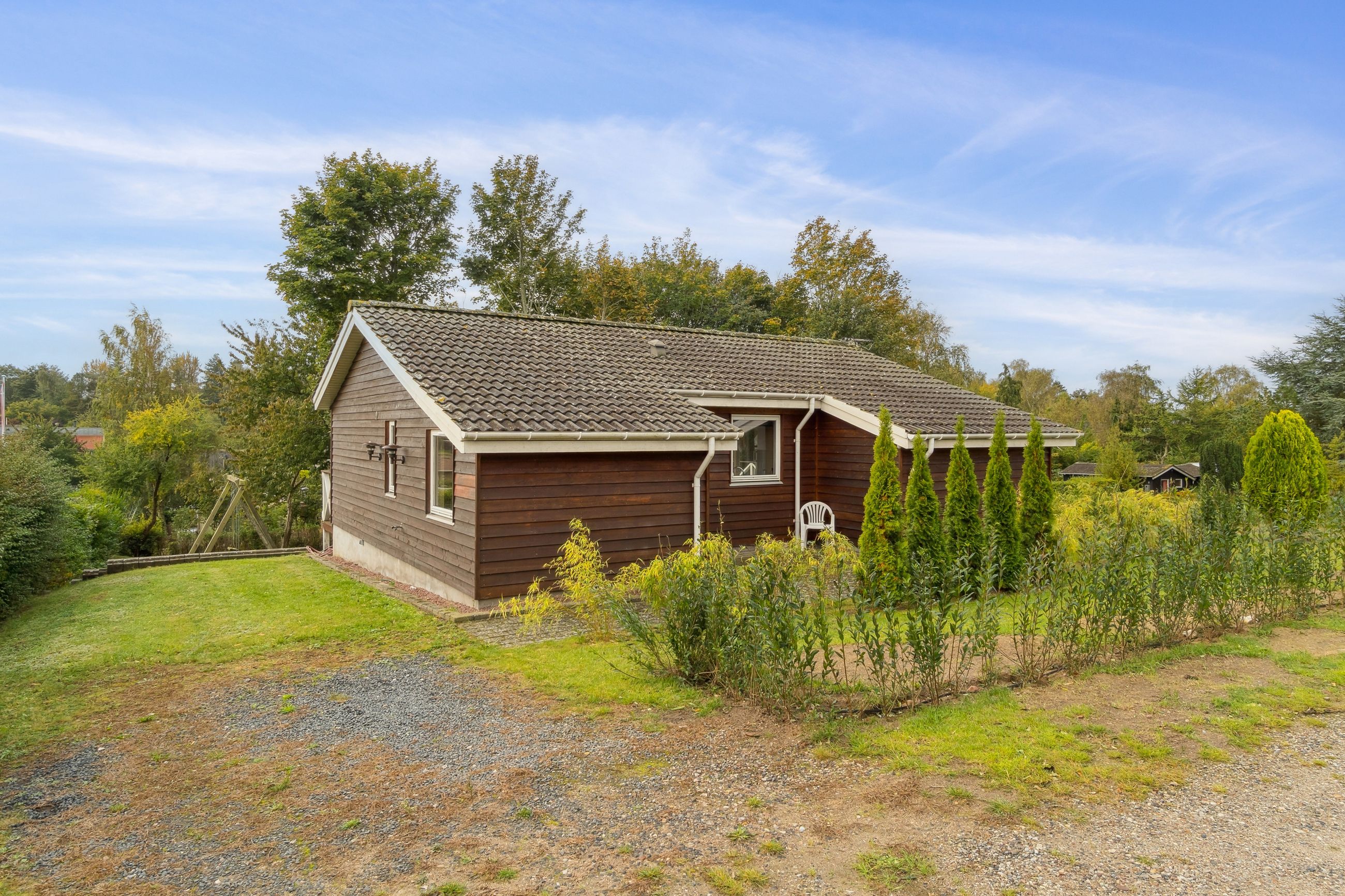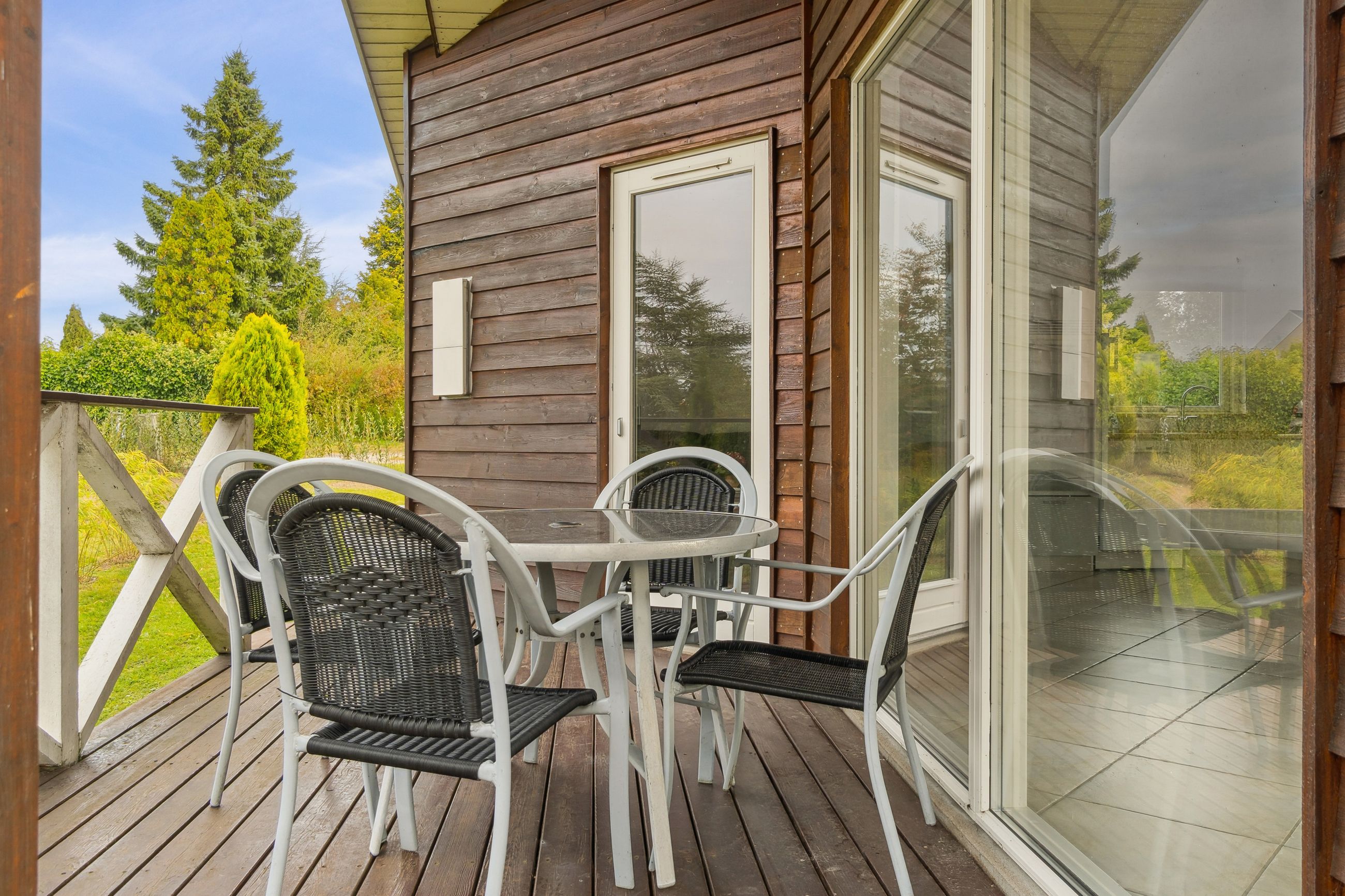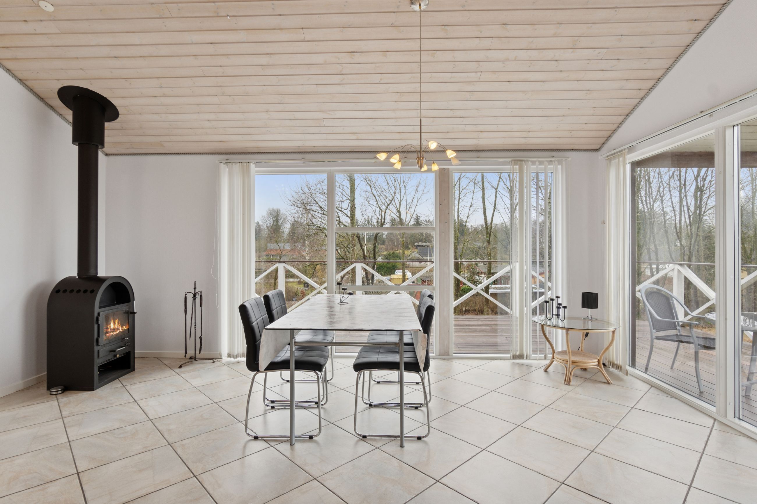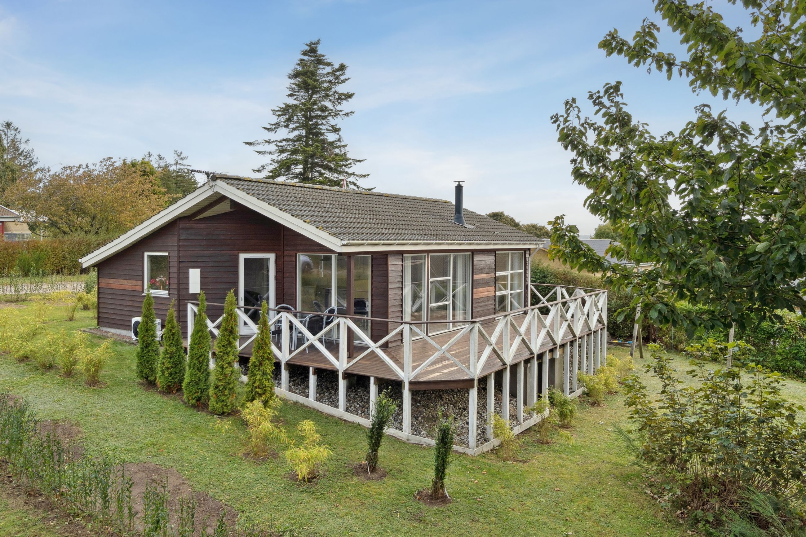 Fritidshuset er strategisk placeret højt i landskabet, hvilket giver et fantastisk udsyn over området. Den store terrasse er perfekt placeret mod syd og vest så solrige dage kan nydes i fulde drag herude, og dette naturlige lys vil I også opleve indenfor, hvor indretningen er indbydende.