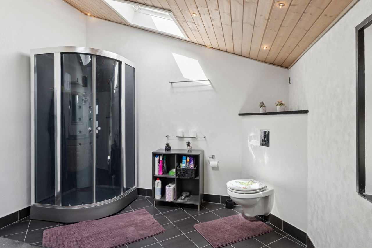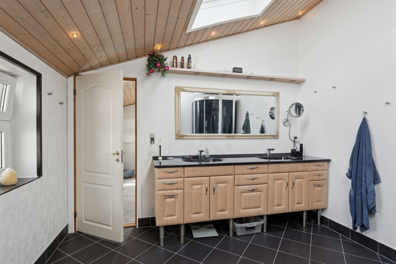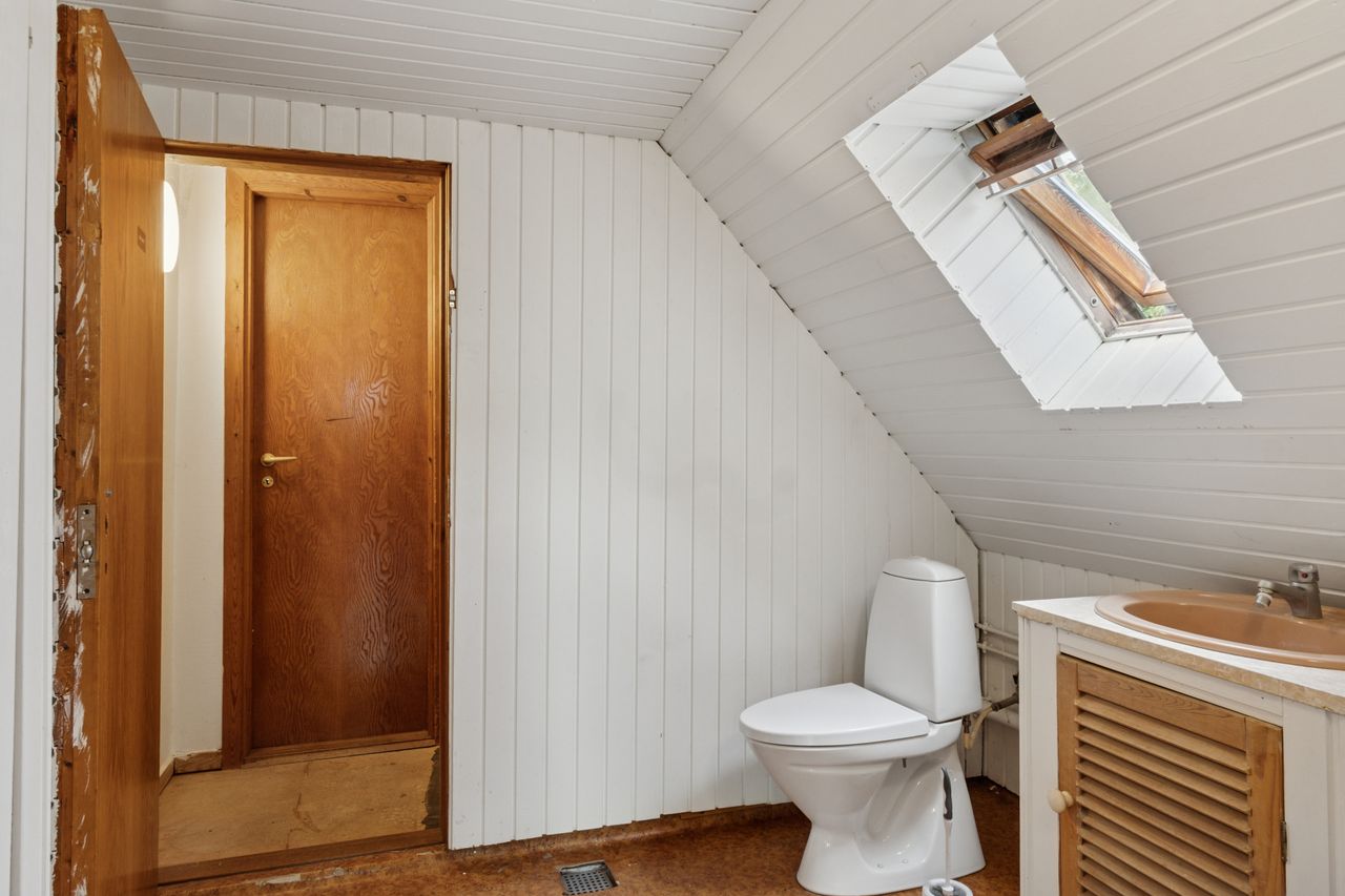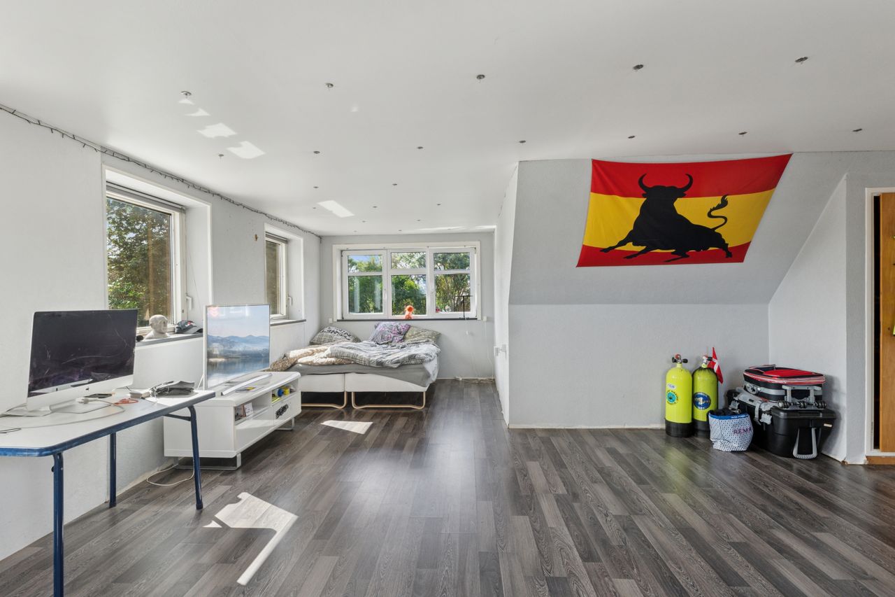 På førstesalen ligger yderligere to værelser, hvoraf det ene har et tilhørende depotrum til opbevaring. Hertil kommer endnu et badeværelse. Kælderen rummer et praktisk vaskerum, mens et stort udhus udenfor giver masser af plads til opbevaring i de to skure.