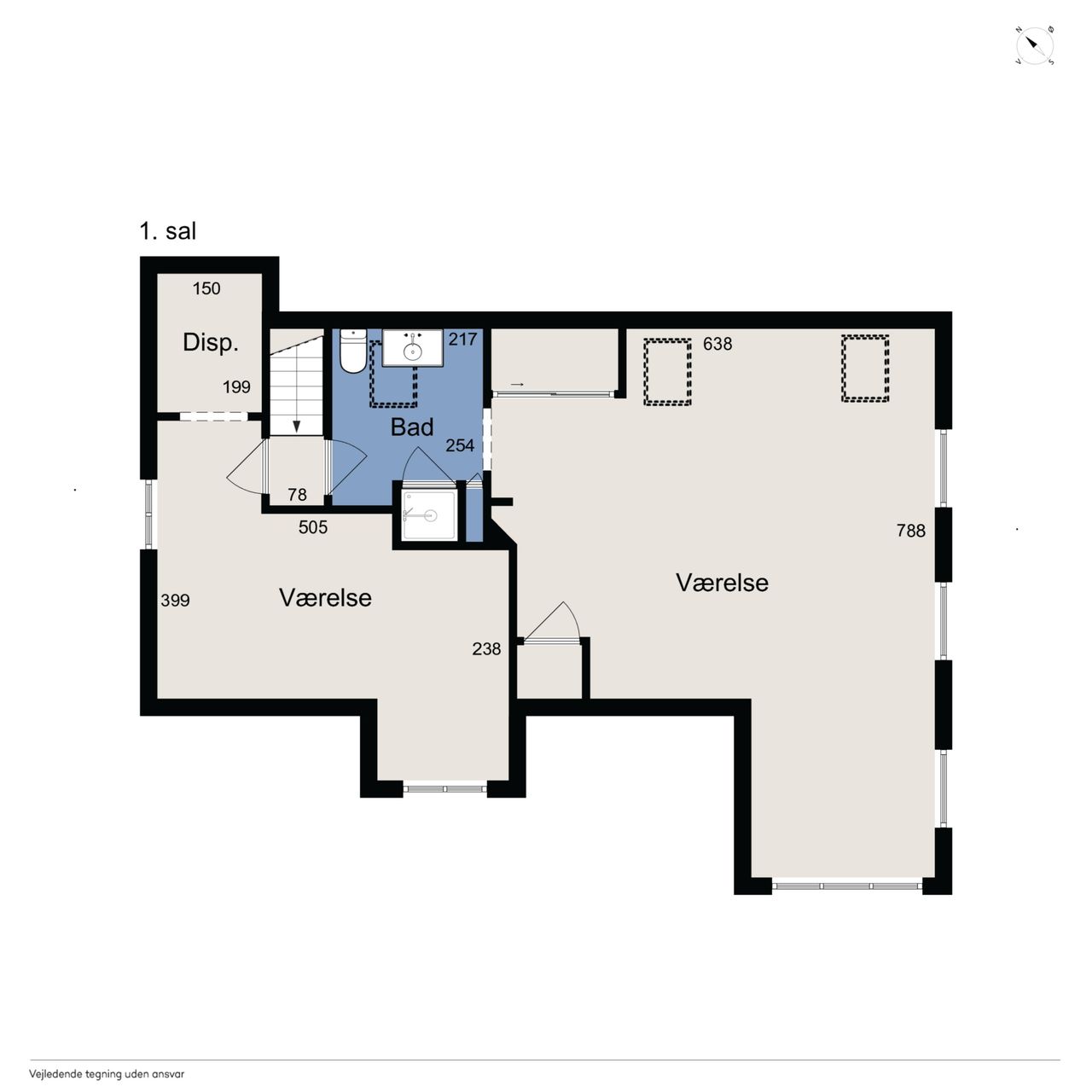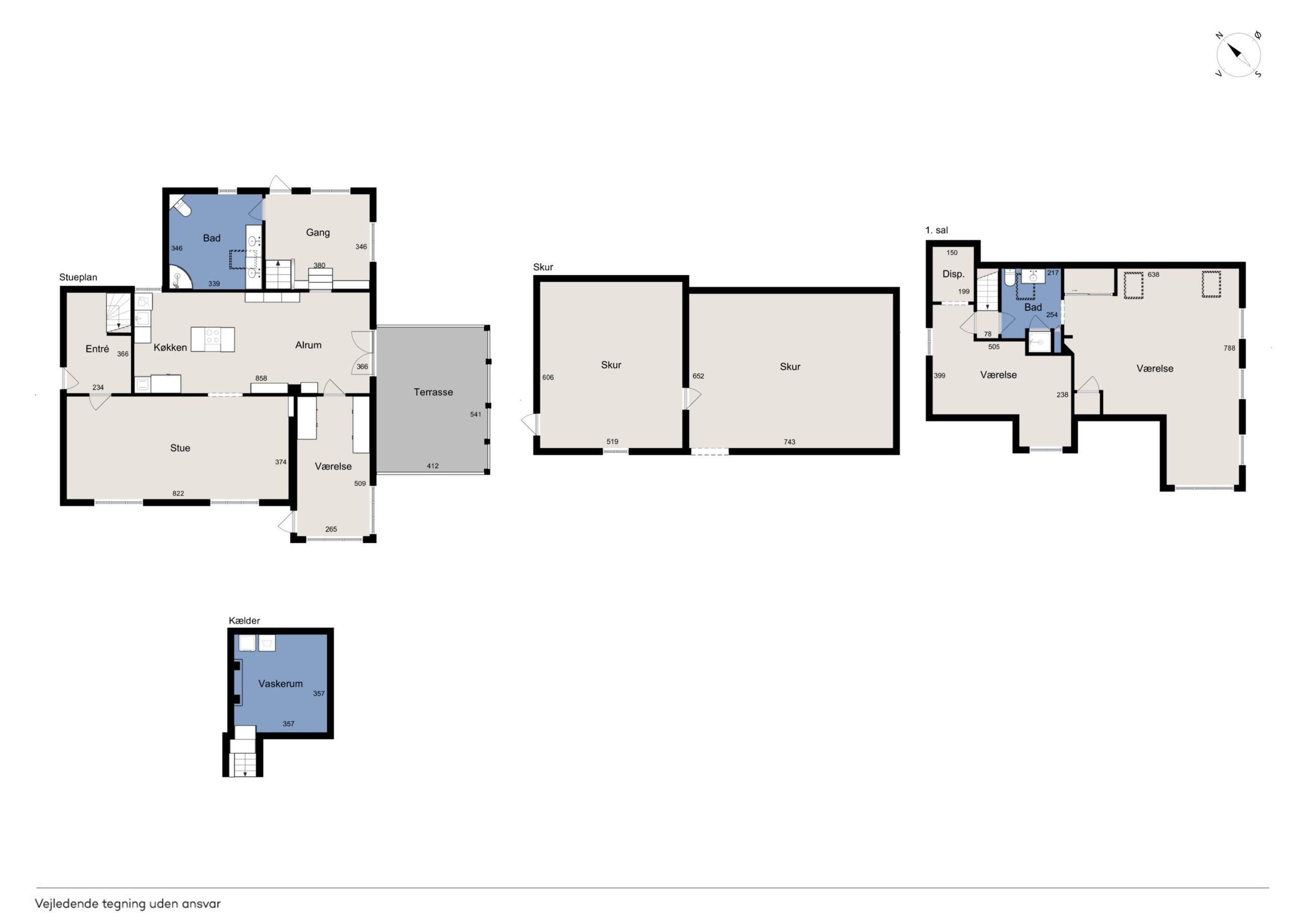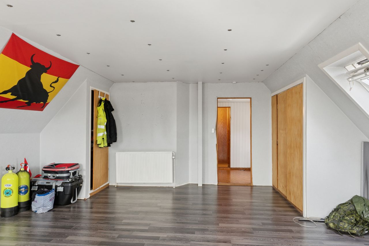 På førstesalen ligger yderligere to værelser, hvoraf det ene har et tilhørende depotrum til opbevaring. Hertil kommer endnu et badeværelse. Kælderen rummer et praktisk vaskerum, mens et stort udhus udenfor giver masser af plads til opbevaring i de to skure.