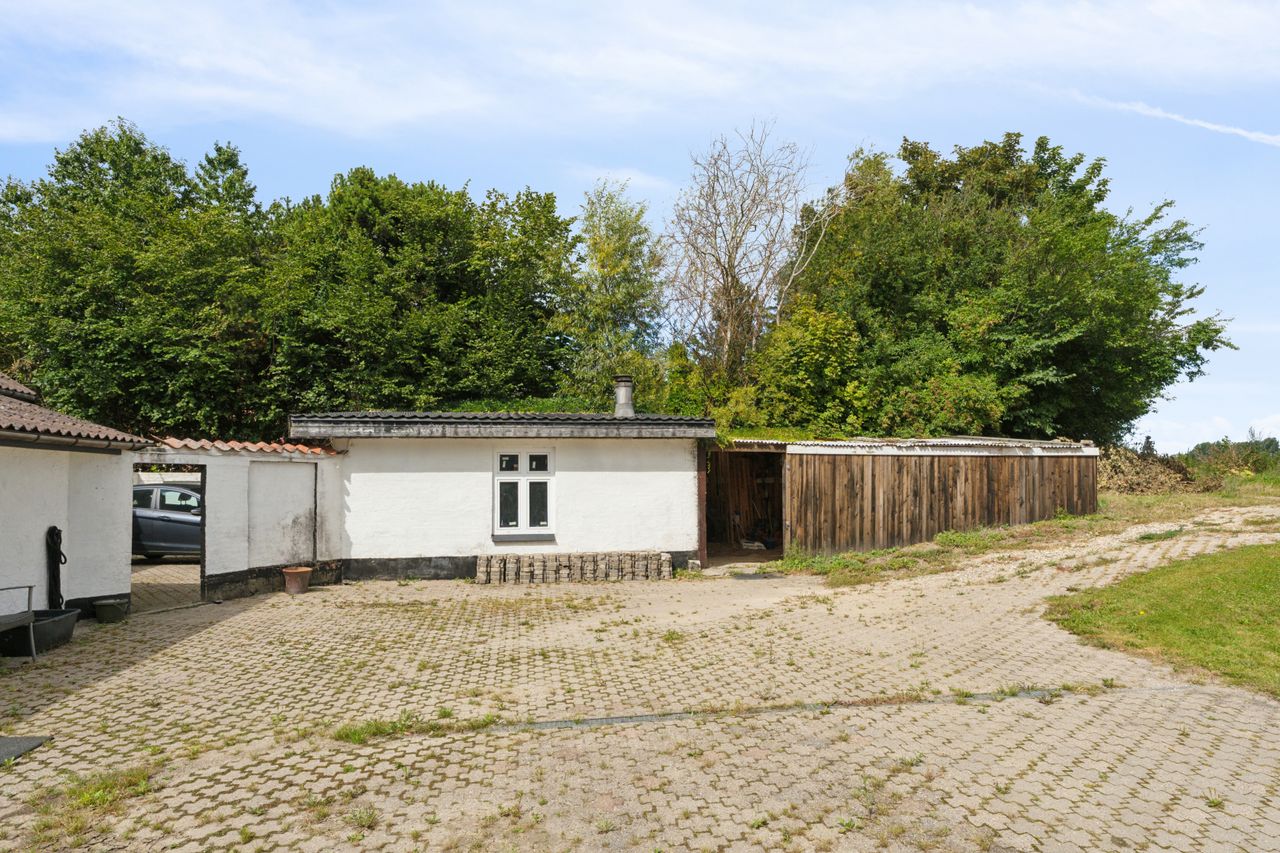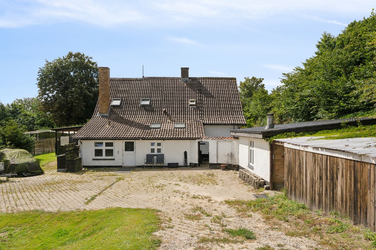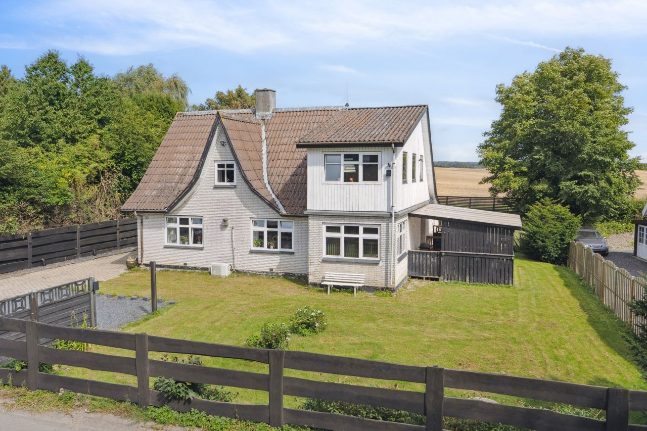 Grunden er anlagt med en indhegnet forhave med græsplæne, god parkeringsplads og adgang til baghaven, hvor et stort terrassemiljø giver rig mulighed for både afslapning og hyggelige sammenkomster. Fra haven er der et skønt kig til de omkringliggende marker, som understreger den fredelige beliggenhed.