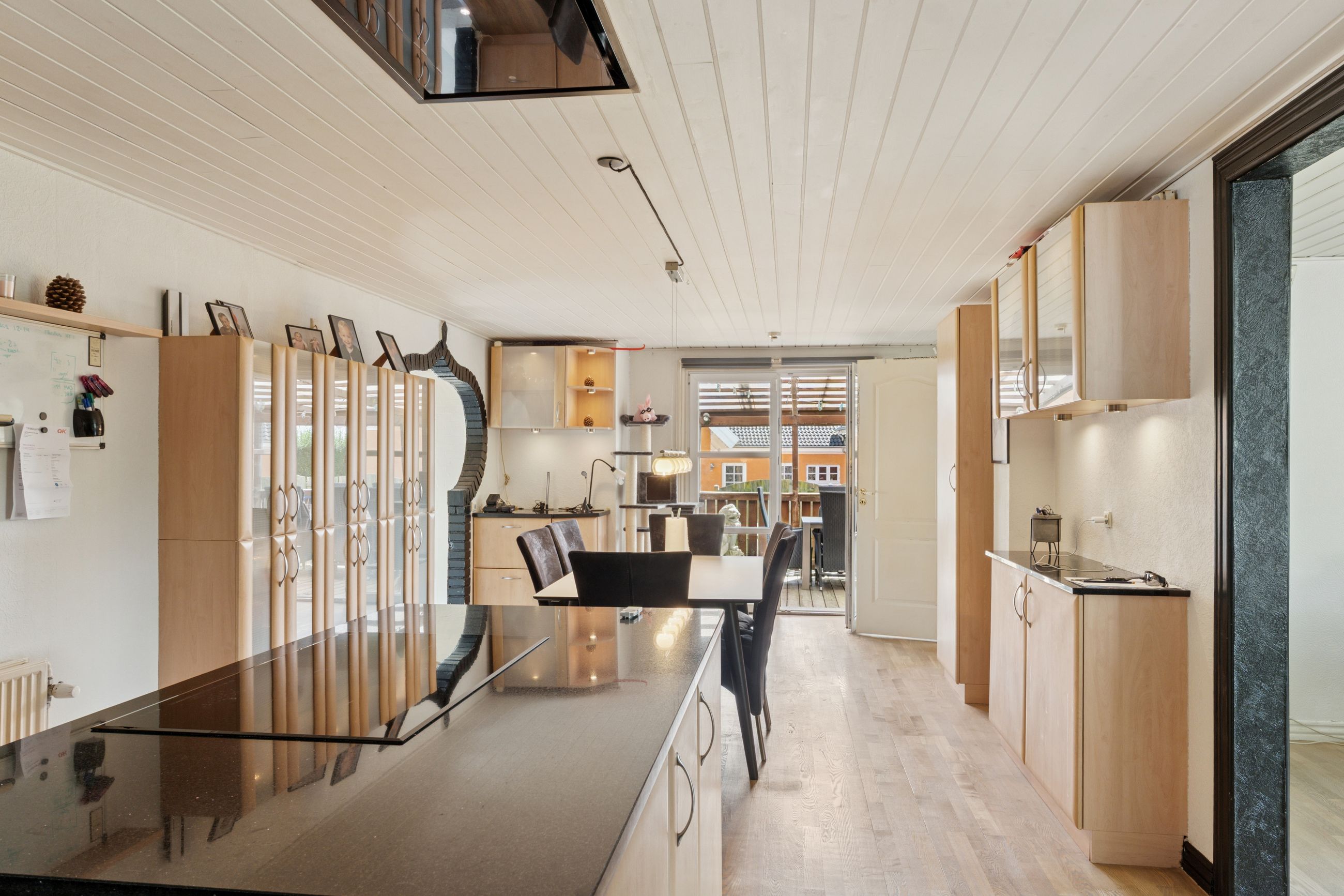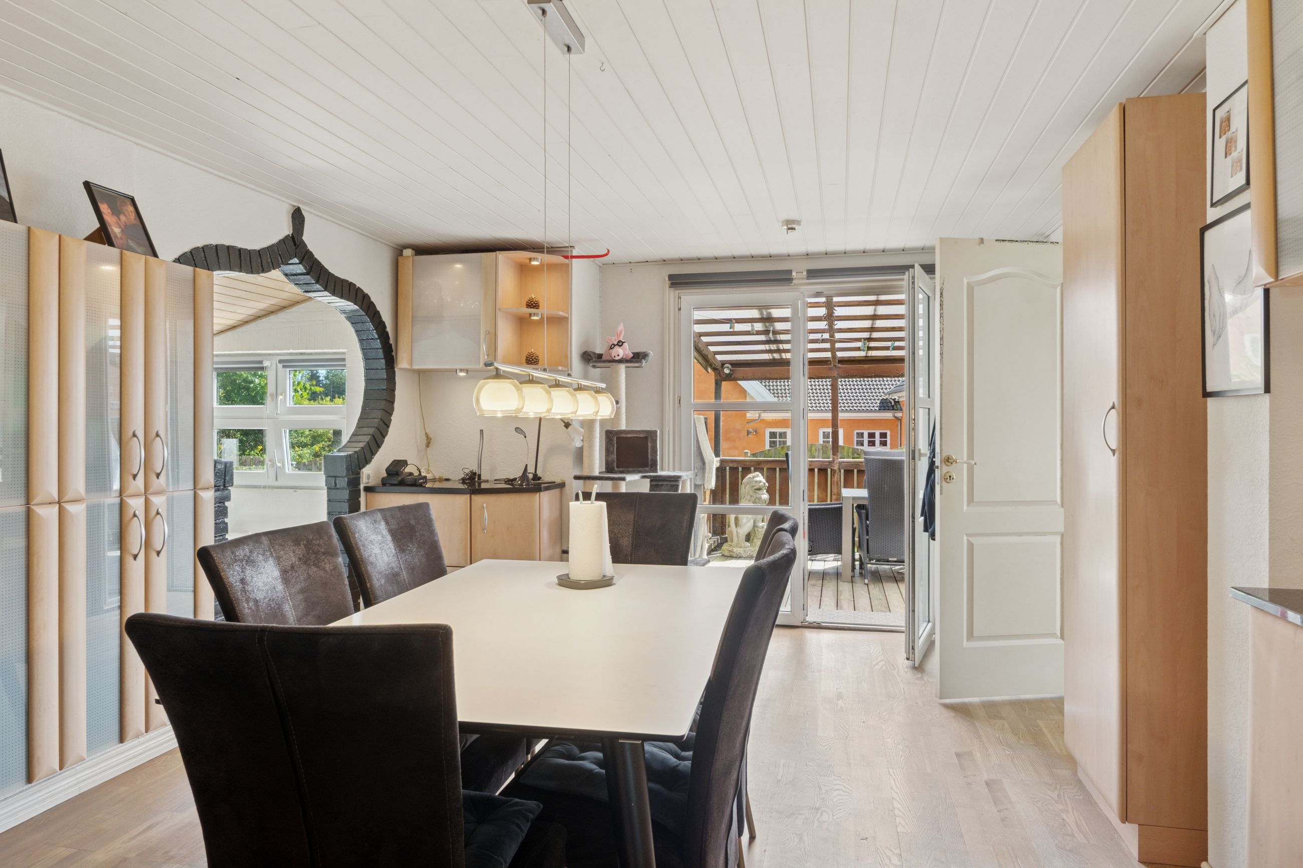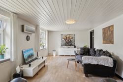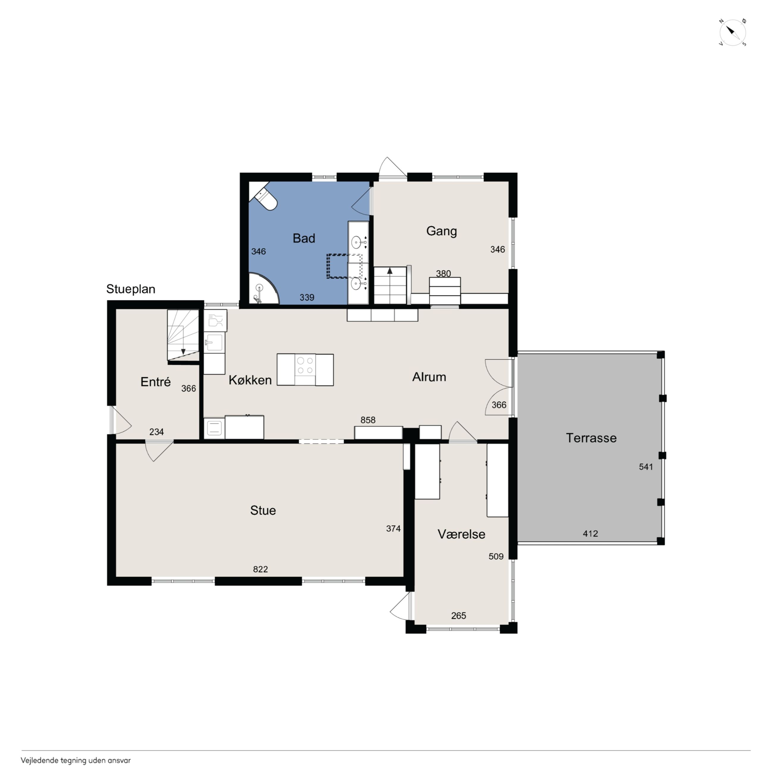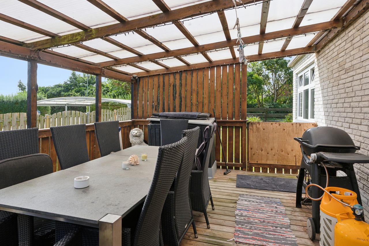 Boligen byder på et lyst stueplan med et køkken-alrum, der ligger tilstødende til en stor stue. Herfra er der udgang til den overdækkede terrasse, som danner en naturlig ramme om udelivet. Etagen rummer desuden et værelse samt en baggang med adgang til et pænt badeværelse, der i 2024-2025 er blevet moderniseret med nyt flisegulv og gulvvarme.