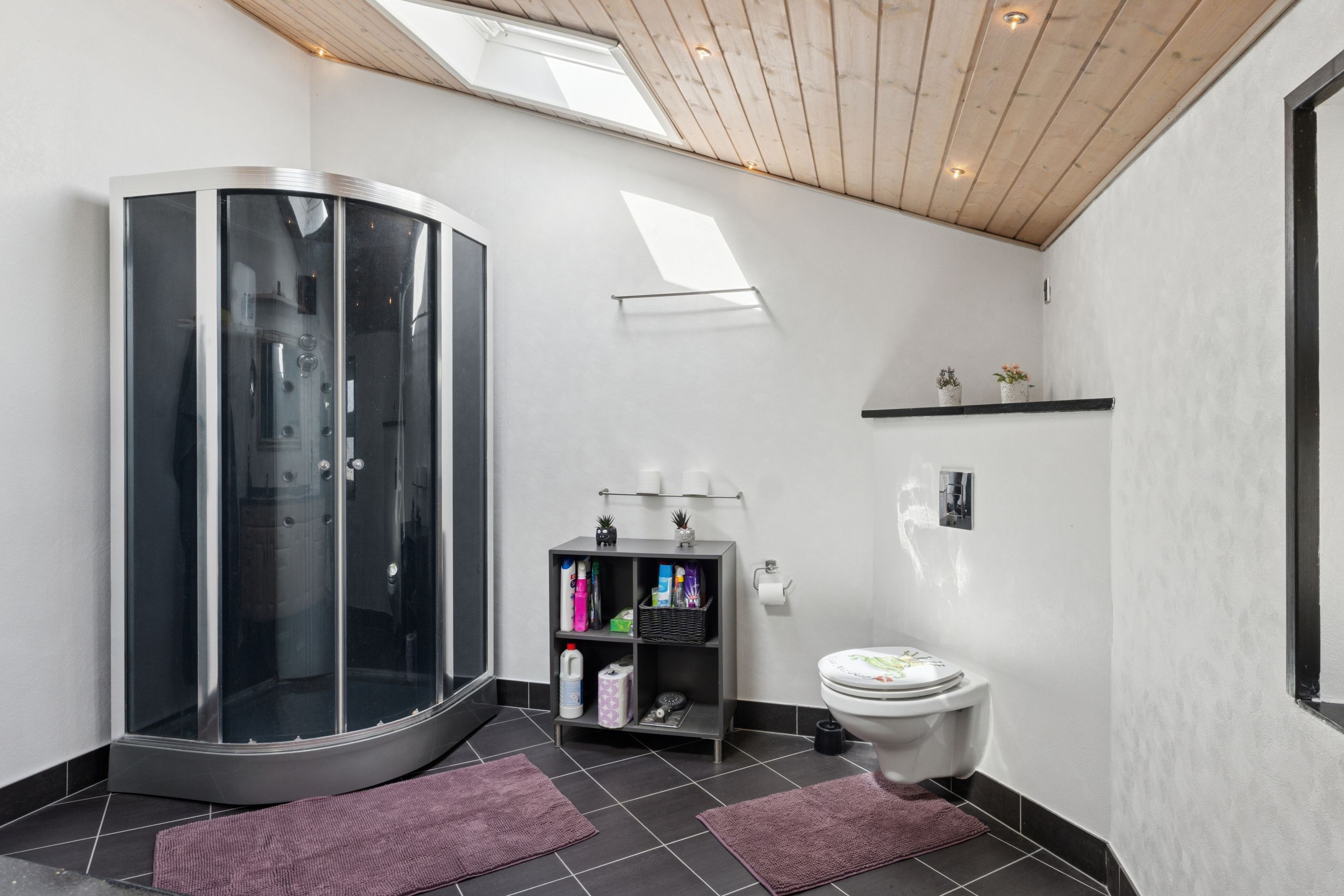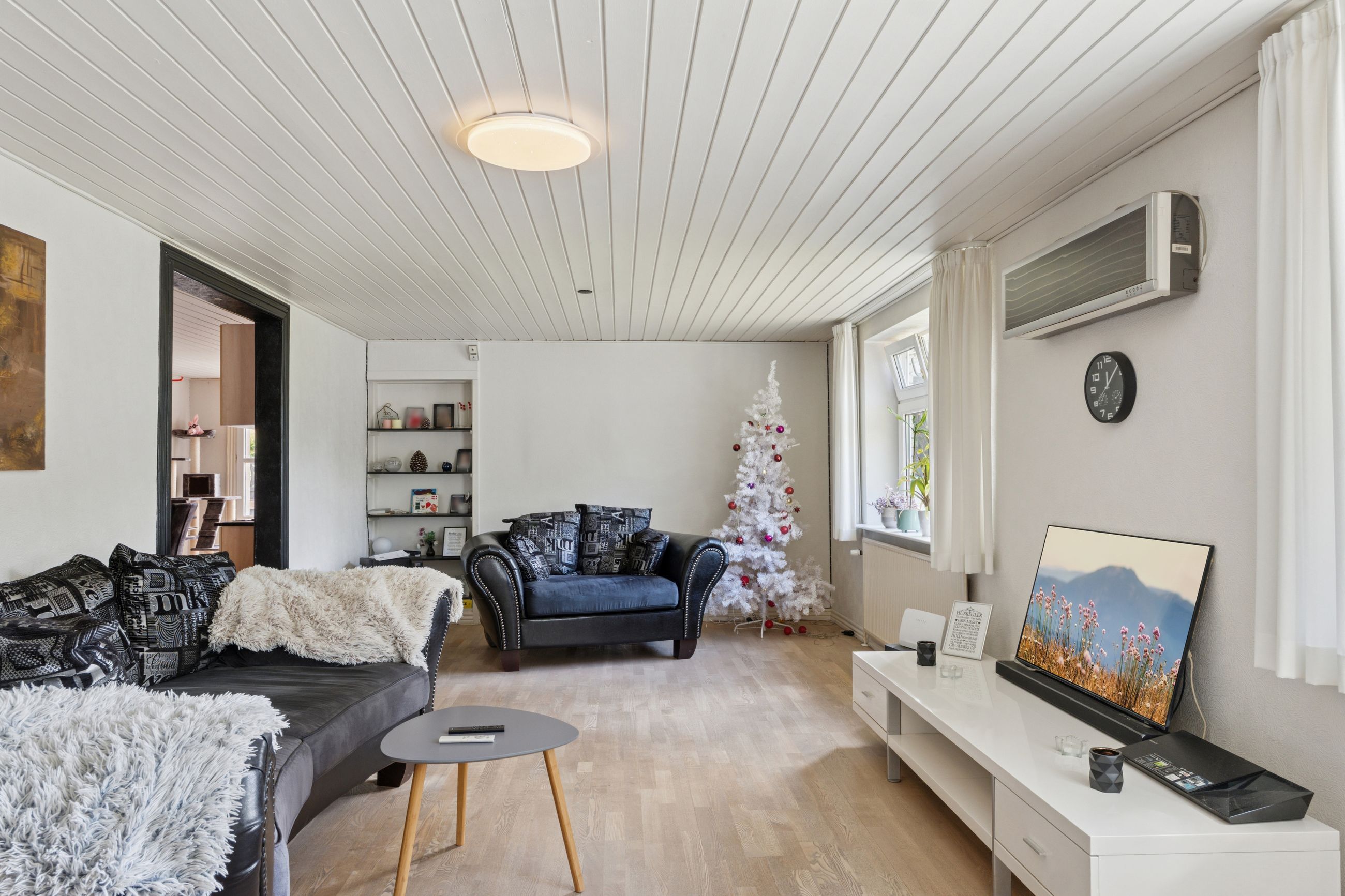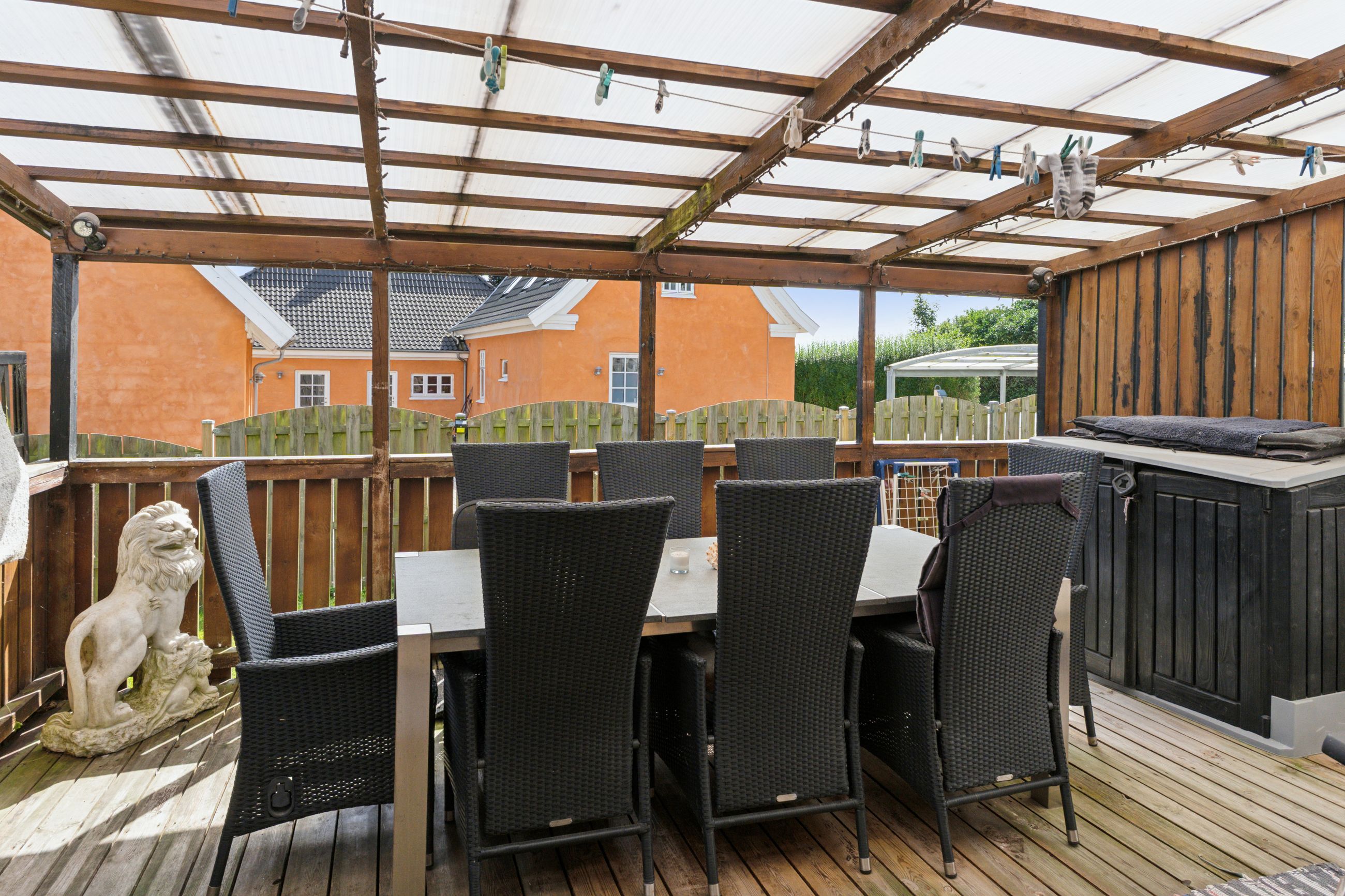 Boligen byder på et lyst stueplan med et køkken-alrum, der ligger tilstødende til en stor stue. Herfra er der udgang til den overdækkede terrasse, som danner en naturlig ramme om udelivet. Etagen rummer desuden et værelse samt en baggang med adgang til et pænt badeværelse, der i 2024-2025 er blevet moderniseret med nyt flisegulv og gulvvarme.