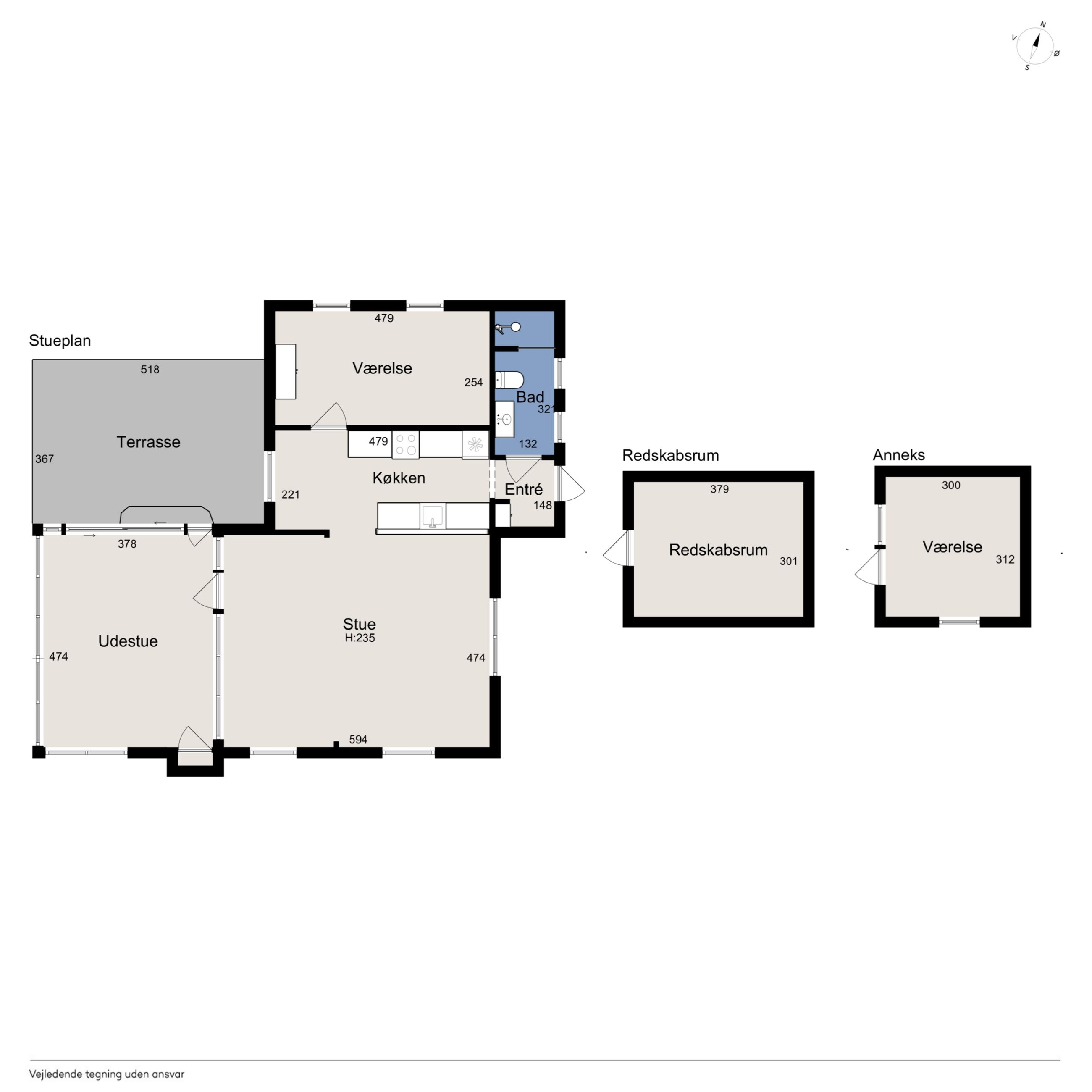 Hertil kommer et udhus, carport og et hyggeligt "gæsteanneks" med to værelser, så vi har i alt 8 sovepladser.