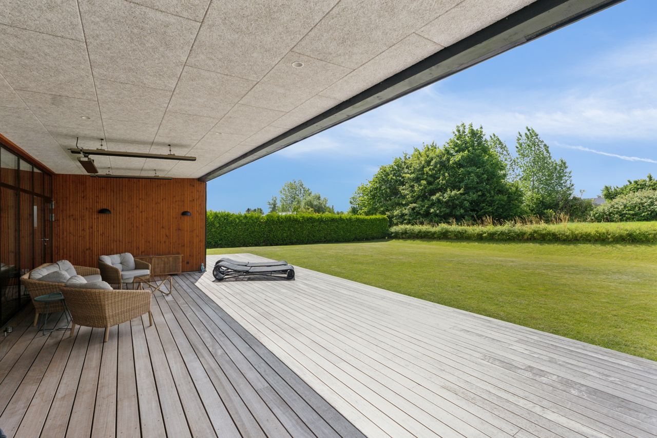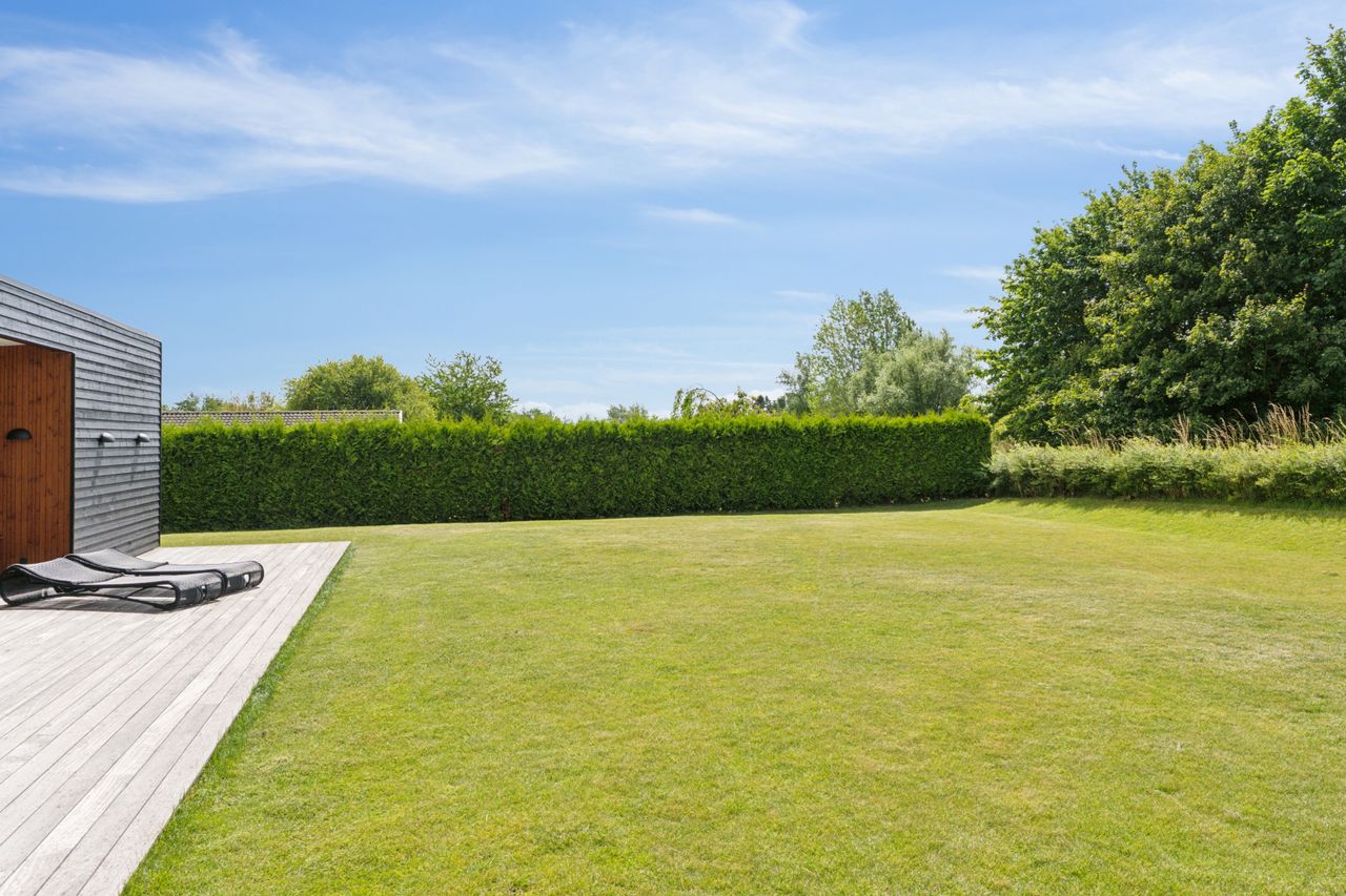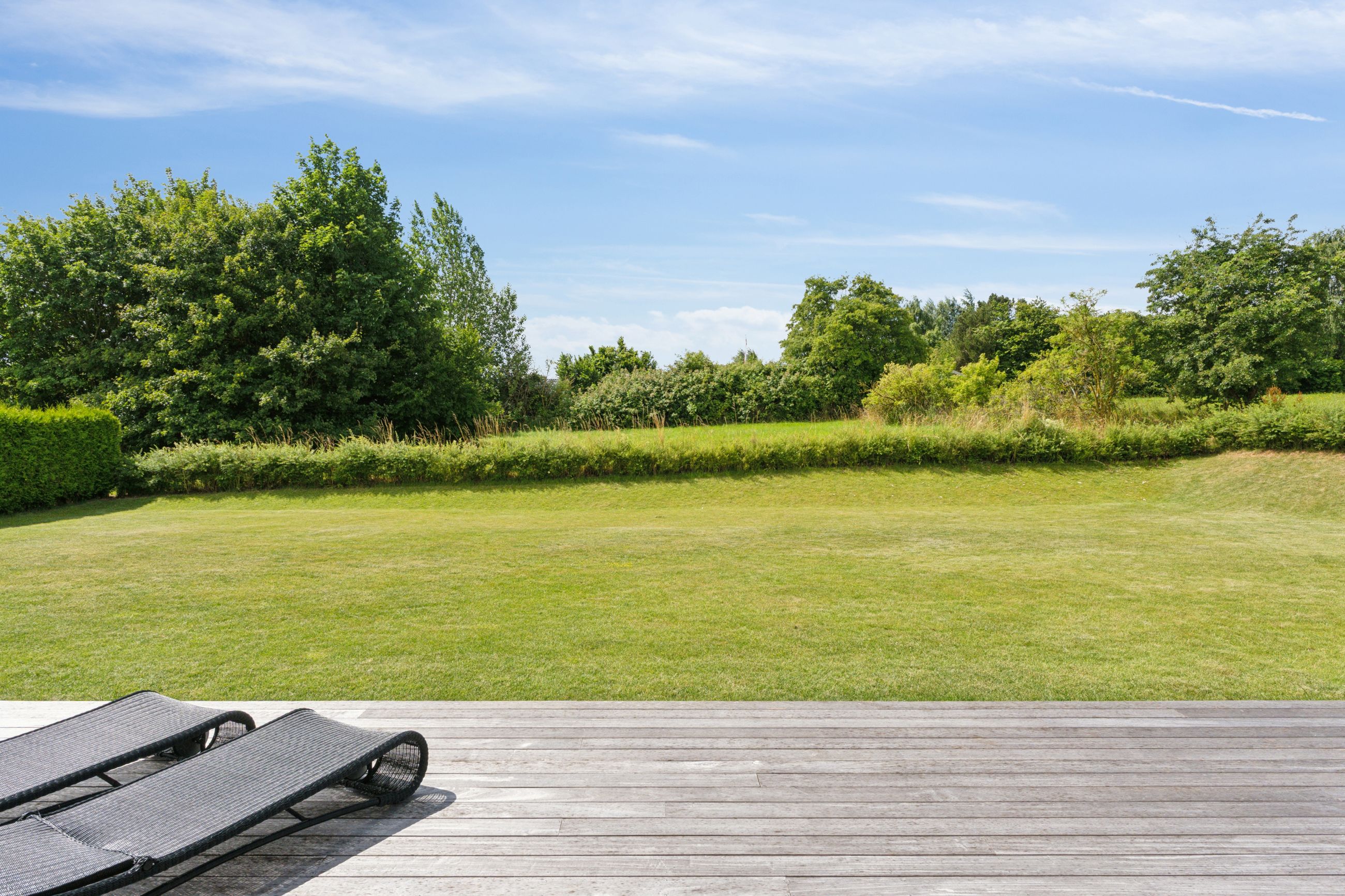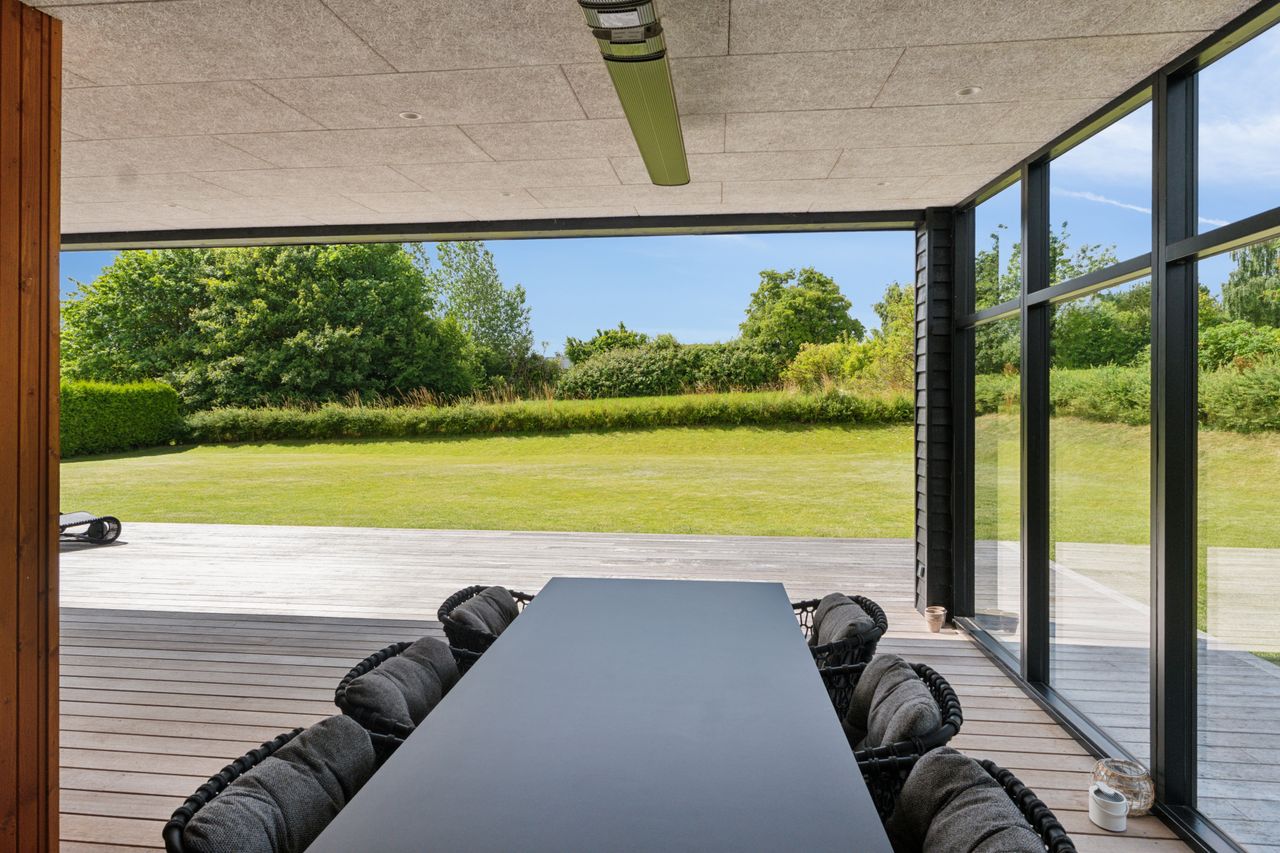 Ejendommen er placeret på en 1.028 m2 stor grund med en solrig have, der vender mod et lukket fællesareal, hvilket skaber et ugeneret uderum. Her vil du særligt nyde at sidde på den overdækkede terrasse, der har flere terrassevarmere, og opleve udsigten til grønne vidder. Herudover er der elbil-lader, etableret robotplæneklipper og et praktisk skur til haveredskaber.