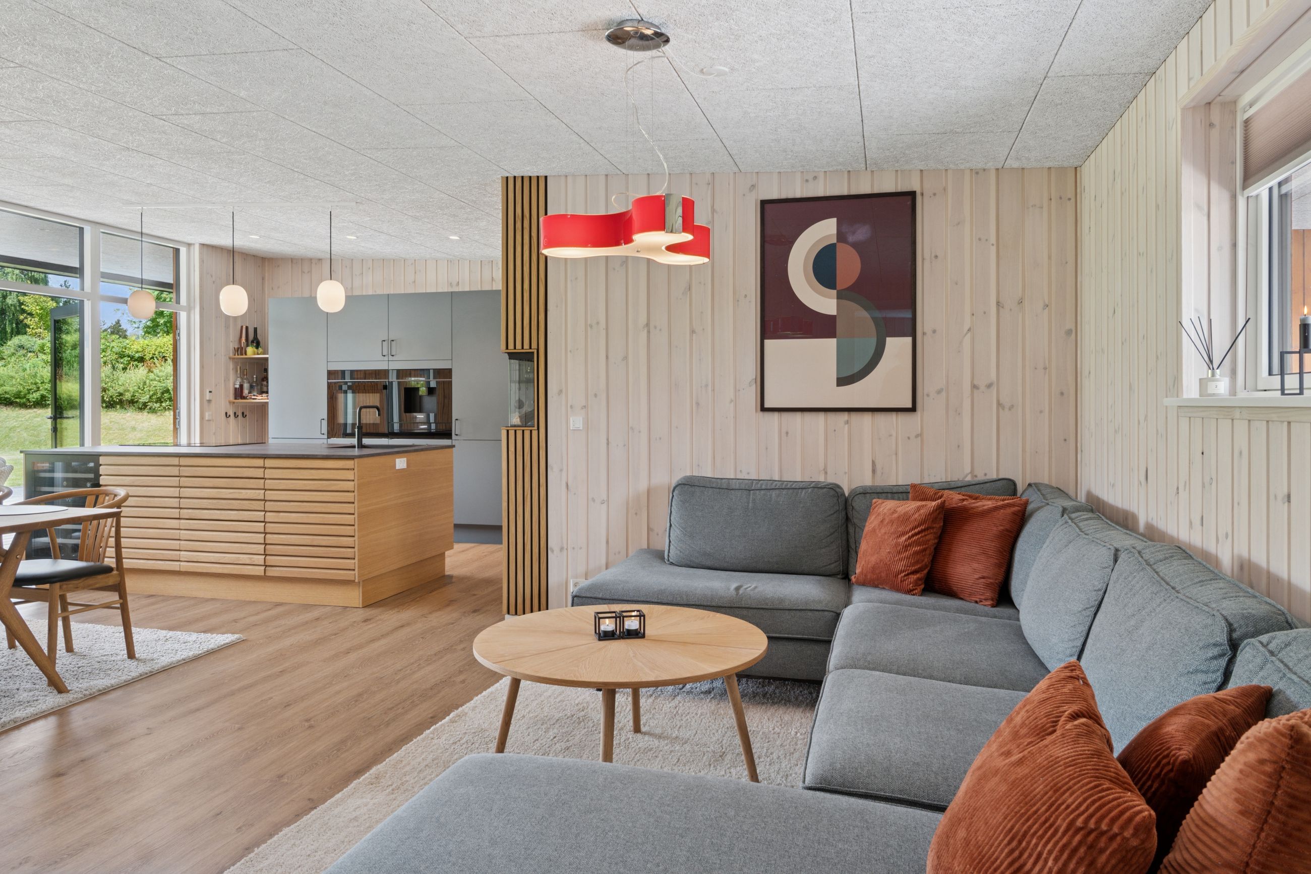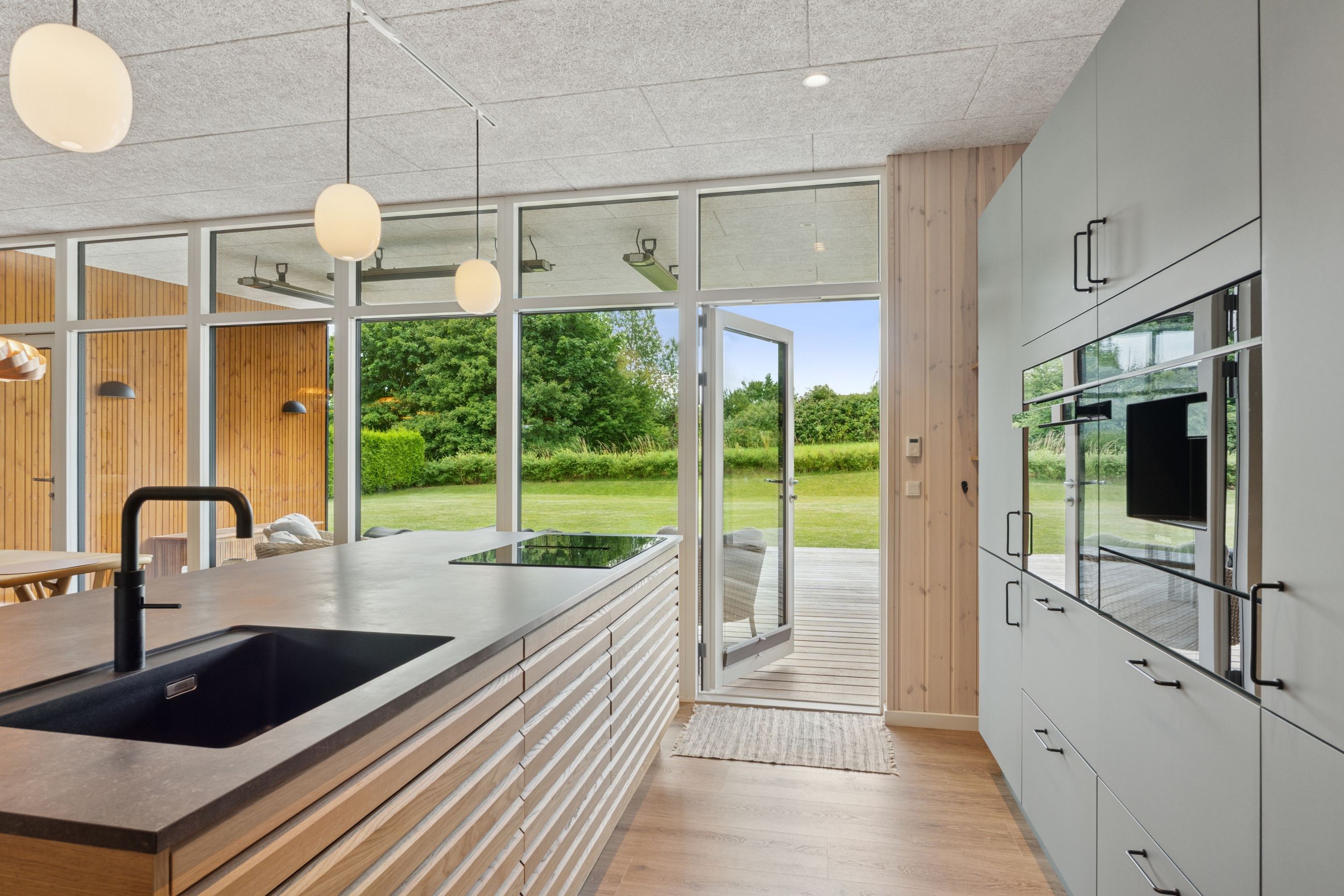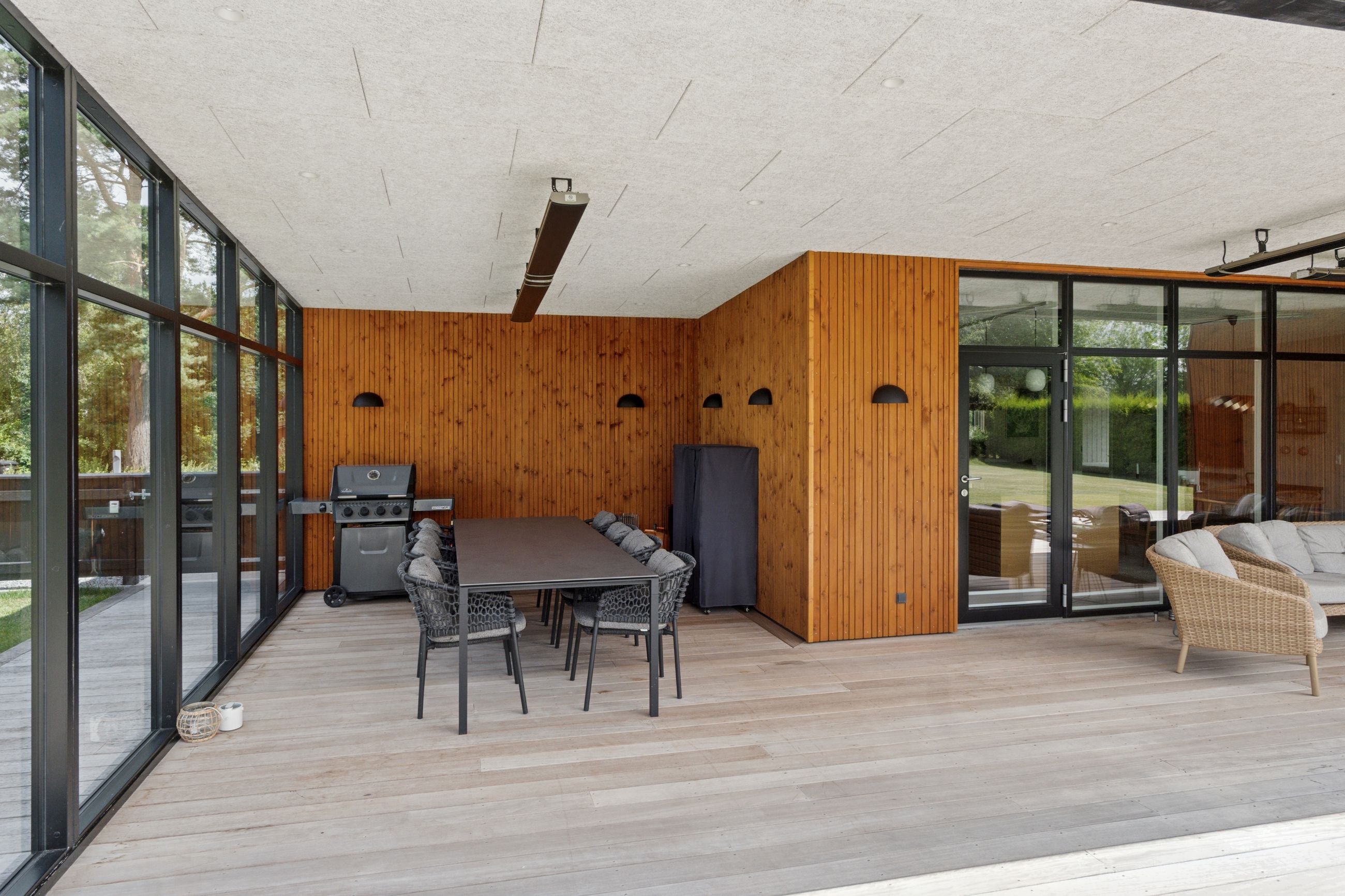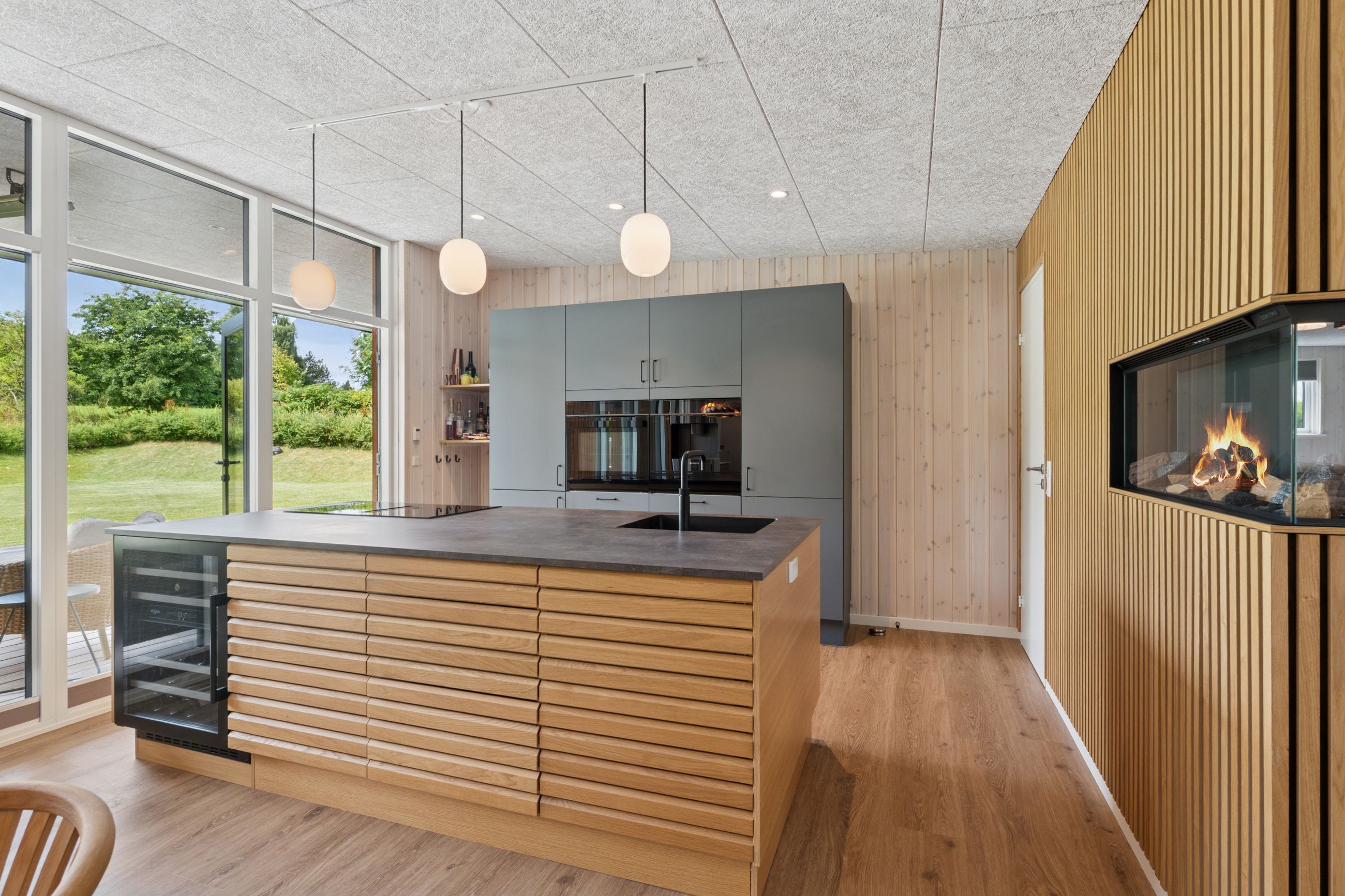Tømrermesteren har kræset for detaljerne både ude og inde. Indenfor får du eksempelvis luft til vand varmepumpe, der skaber gulvvarme overalt, luft til luft varmepumper i værelserne, der skaber aircondition, samt et blødgøringsanlæg til vandet. Planløsningen byder på 120 m2 og rummer et bryggers, to badeværelser med flotte klinker samt fire værelser til store og små. Fritidshusets hjerte er det skønne køkken-alrum, som ligger i åben forbindelse til stuen, hvilket skaber et sammensmeltet opholdsmiljø. Bemærk især de moderne og luksuriøse tilvalg såsom køkkenø, indbygget kaffemaskine, vinkøleskab, Quooker, akustiklofter og elpejs. Om sommeren er det oplagt at åbne dørene til terrassen og forene ude og inde.