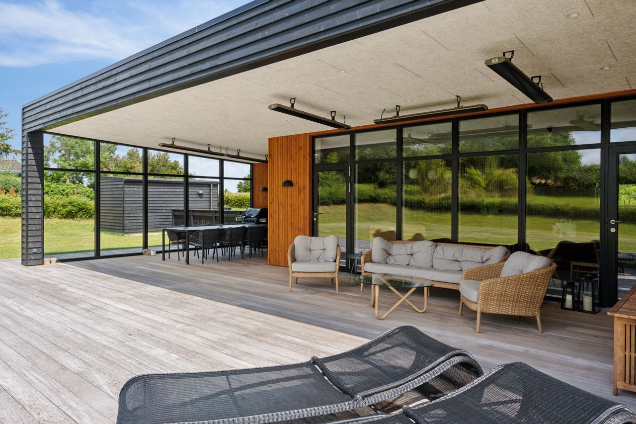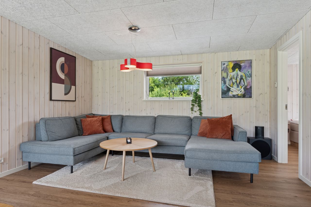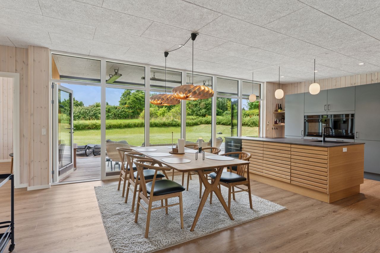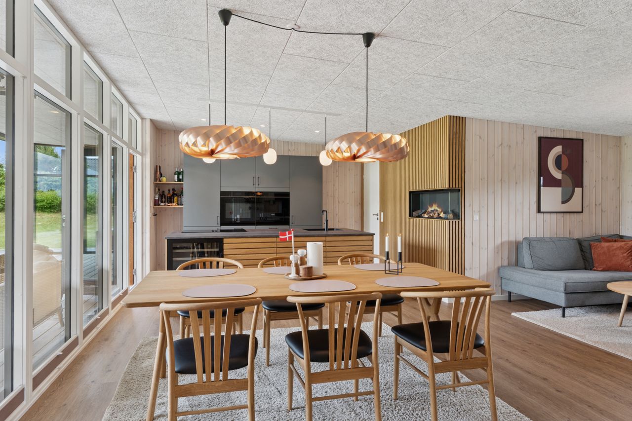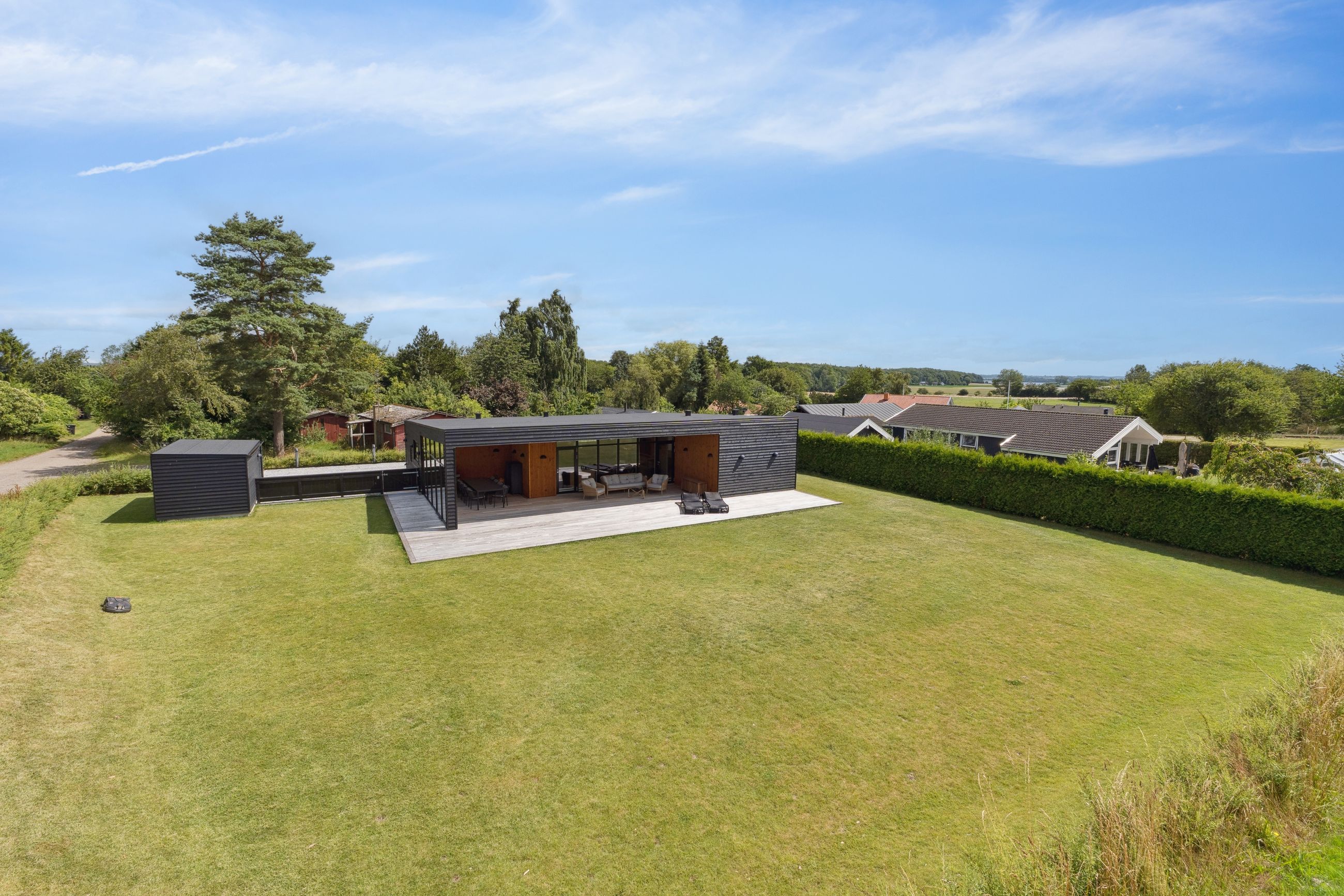 Tømrermesteren har kræset for detaljerne både ude og inde. Indenfor får du eksempelvis luft til vand varmepumpe, der skaber gulvvarme overalt, luft til luft varmepumper i værelserne, der skaber aircondition, samt et blødgøringsanlæg til vandet. Planløsningen byder på 120 m2 og rummer et bryggers, to badeværelser med flotte klinker samt fire værelser til store og små. Fritidshusets hjerte er det skønne køkken-alrum, som ligger i åben forbindelse til stuen, hvilket skaber et sammensmeltet opholdsmiljø. Bemærk især de moderne og luksuriøse tilvalg såsom køkkenø, indbygget kaffemaskine, vinkøleskab, Quooker, akustiklofter og elpejs. Om sommeren er det oplagt at åbne dørene til terrassen og forene ude og inde.