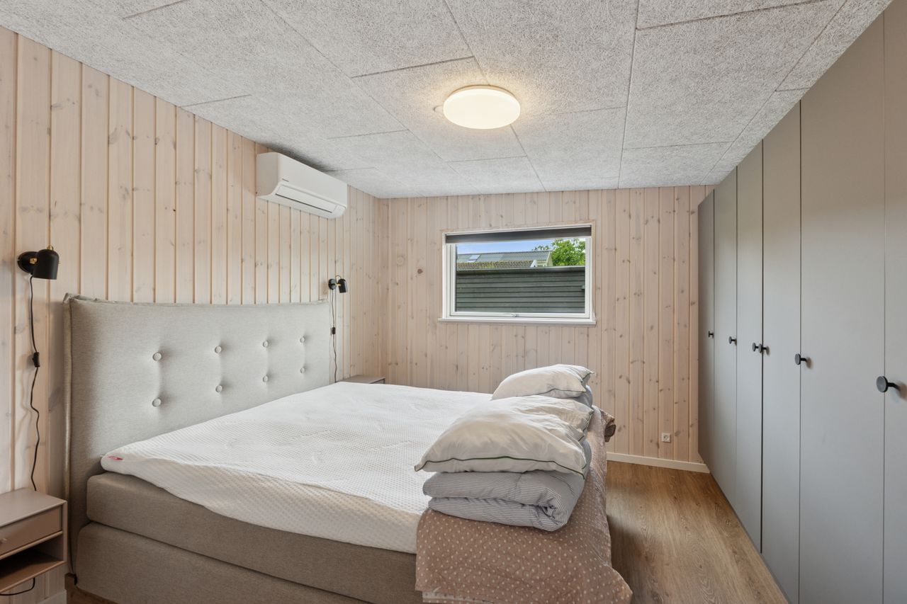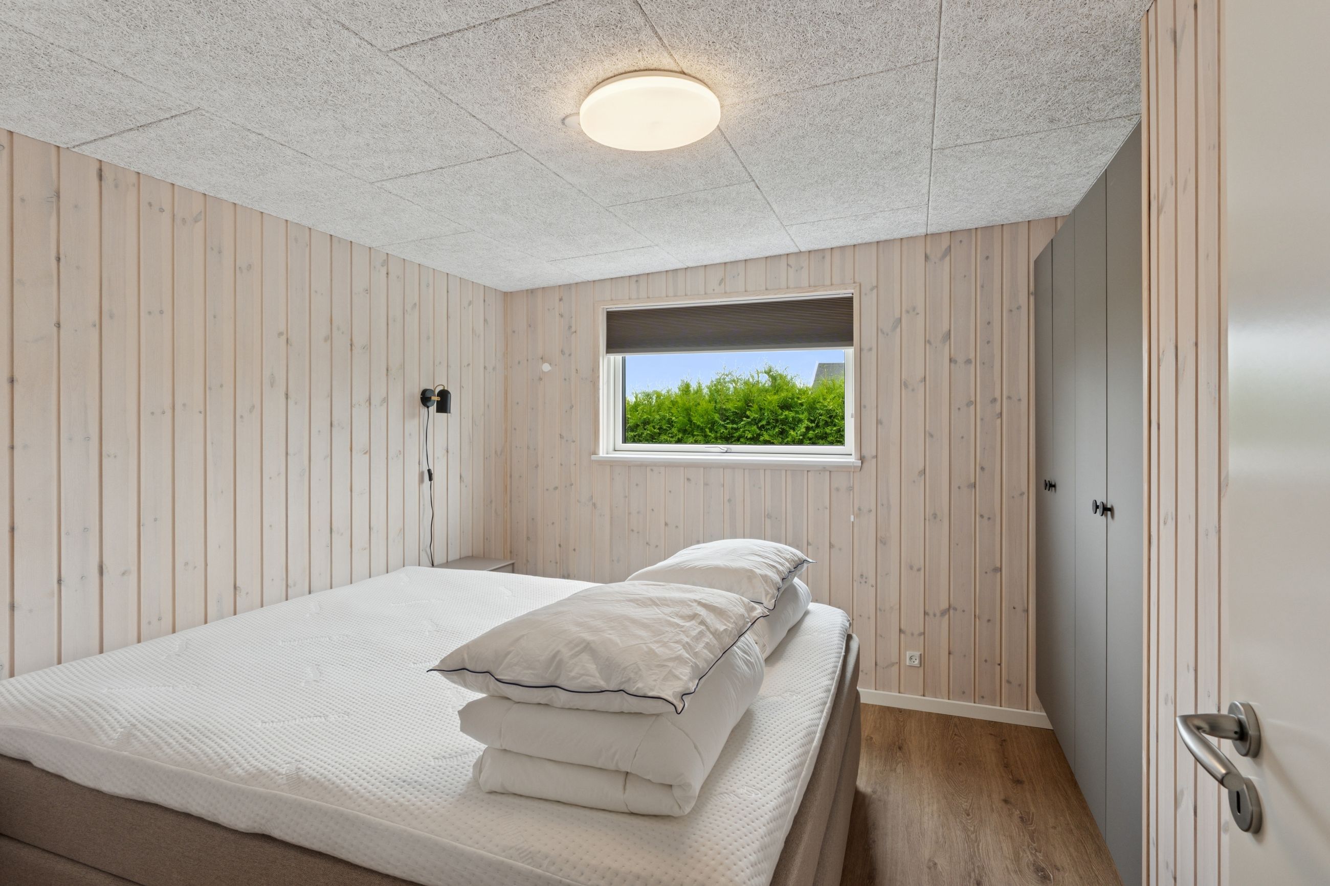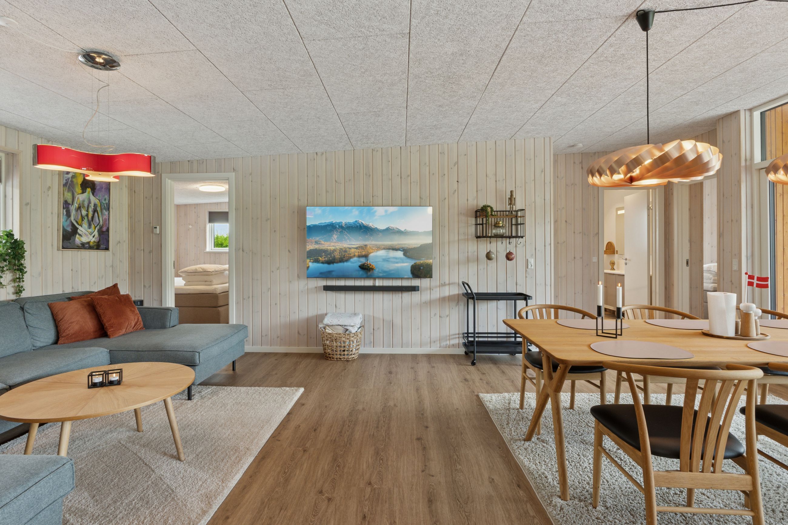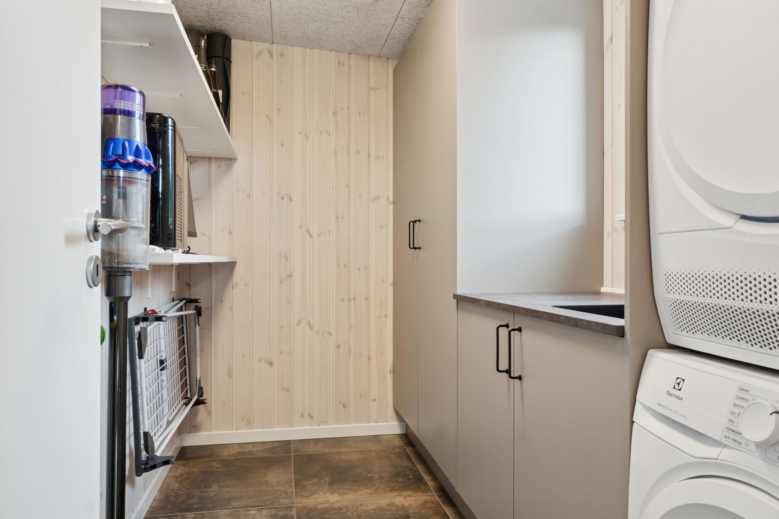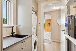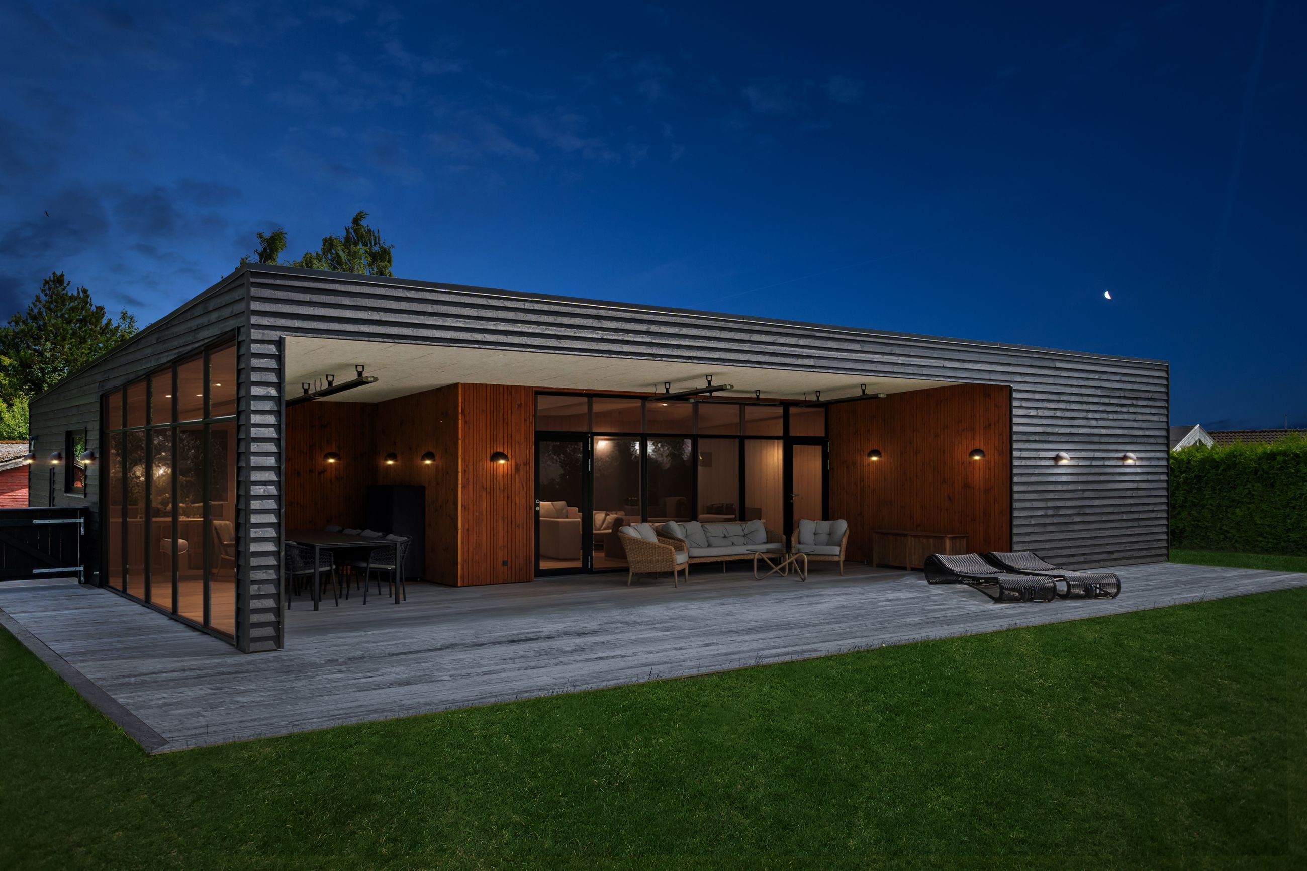 Tømrermesteren har kræset for detaljerne både ude og inde. Indenfor får du eksempelvis luft til vand varmepumpe, der skaber gulvvarme overalt, luft til luft varmepumper i værelserne, der skaber aircondition, samt et blødgøringsanlæg til vandet. Planløsningen byder på 120 m2 og rummer et bryggers, to badeværelser med flotte klinker samt fire værelser til store og små. Fritidshusets hjerte er det skønne køkken-alrum, som ligger i åben forbindelse til stuen, hvilket skaber et sammensmeltet opholdsmiljø. Bemærk især de moderne og luksuriøse tilvalg såsom køkkenø, indbygget kaffemaskine, vinkøleskab, Quooker, akustiklofter og elpejs. Om sommeren er det oplagt at åbne dørene til terrassen og forene ude og inde.