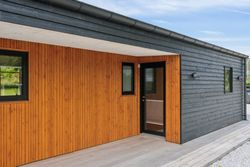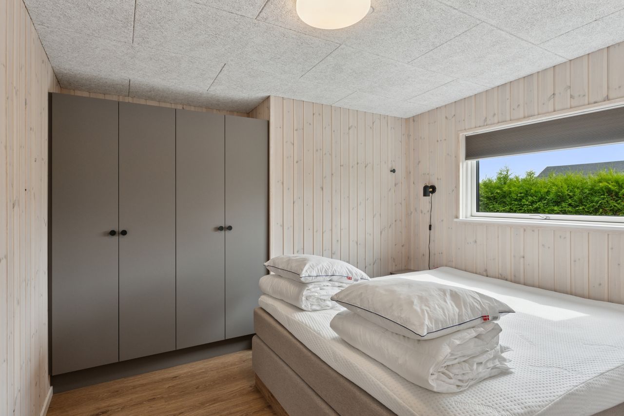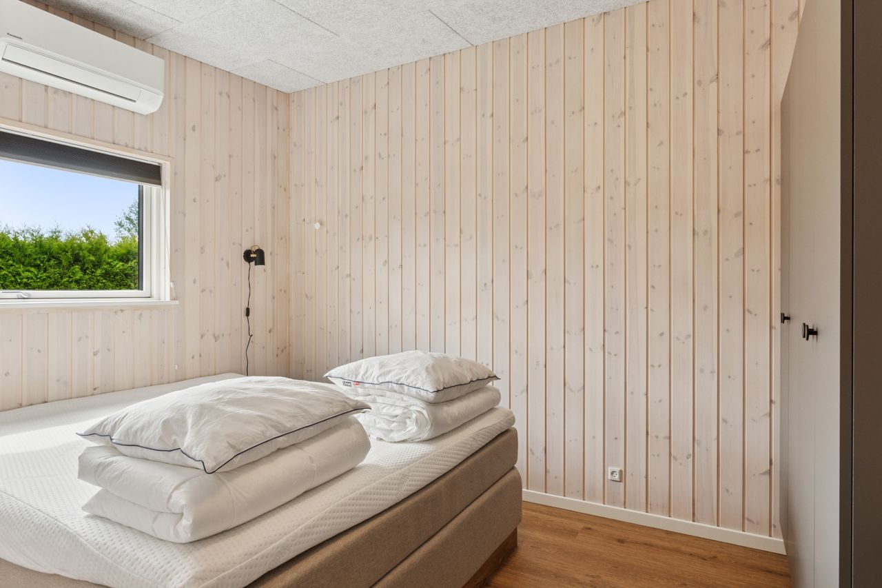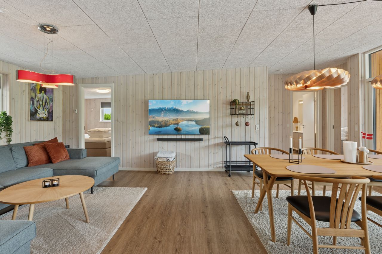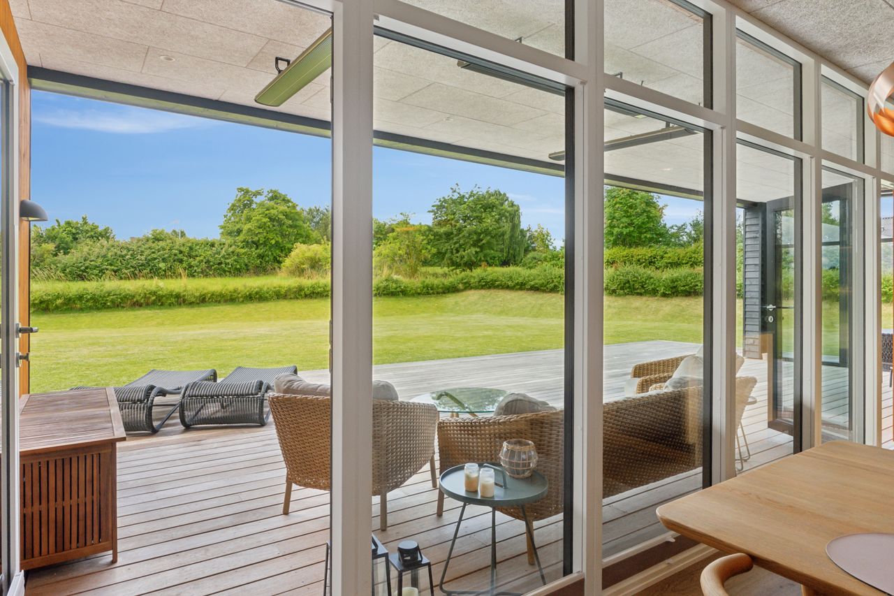 Tømrermesteren har kræset for detaljerne både ude og inde. Indenfor får du eksempelvis luft til vand varmepumpe, der skaber gulvvarme overalt, luft til luft varmepumper i værelserne, der skaber aircondition, samt et blødgøringsanlæg til vandet. Planløsningen byder på 120 m2 og rummer et bryggers, to badeværelser med flotte klinker samt fire værelser til store og små. Fritidshusets hjerte er det skønne køkken-alrum, som ligger i åben forbindelse til stuen, hvilket skaber et sammensmeltet opholdsmiljø. Bemærk især de moderne og luksuriøse tilvalg såsom køkkenø, indbygget kaffemaskine, vinkøleskab, Quooker, akustiklofter og elpejs. Om sommeren er det oplagt at åbne dørene til terrassen og forene ude og inde.