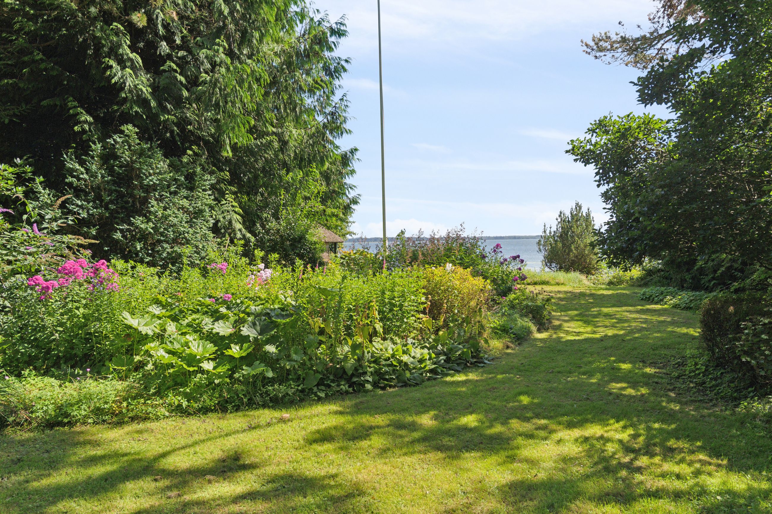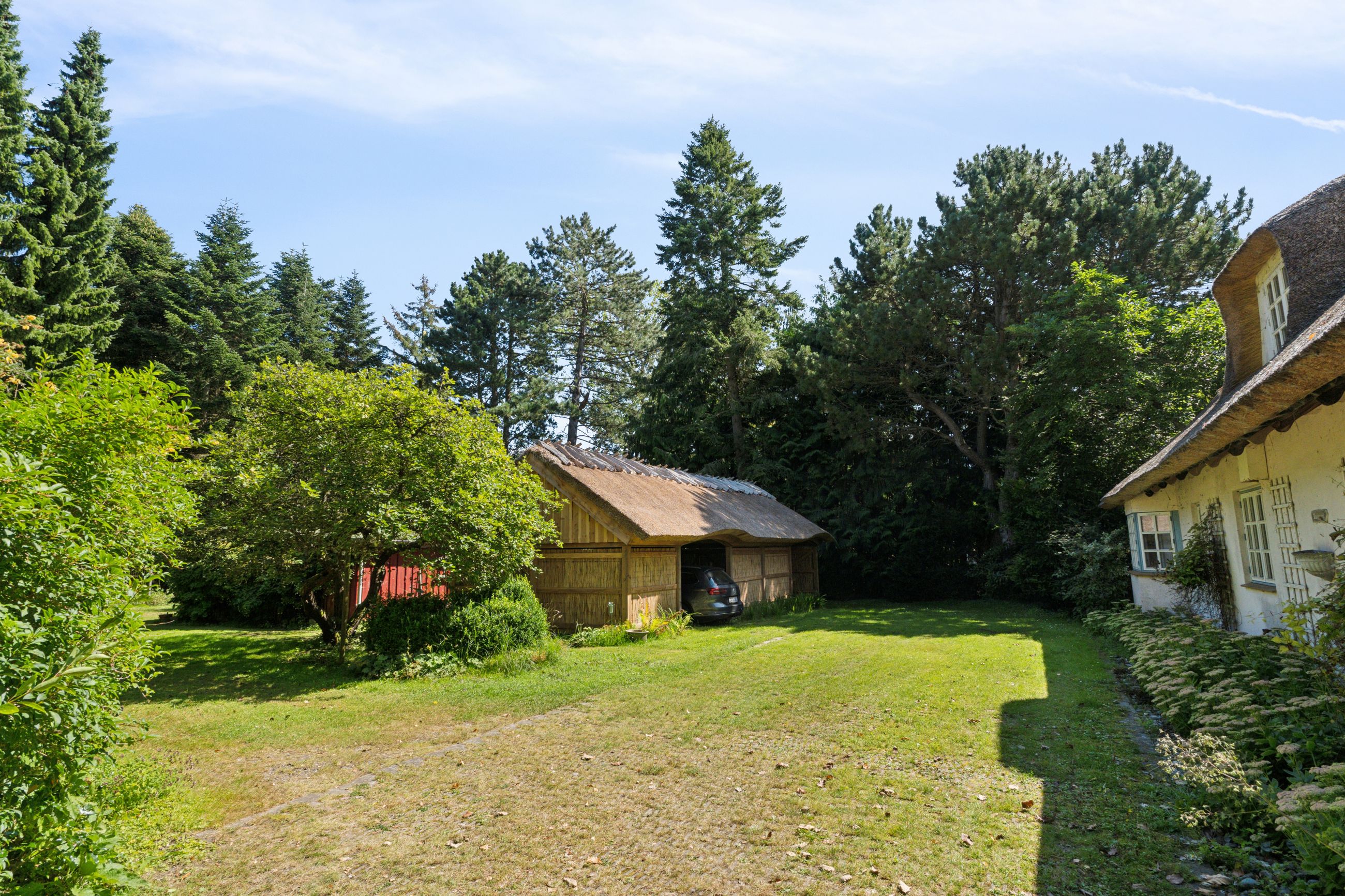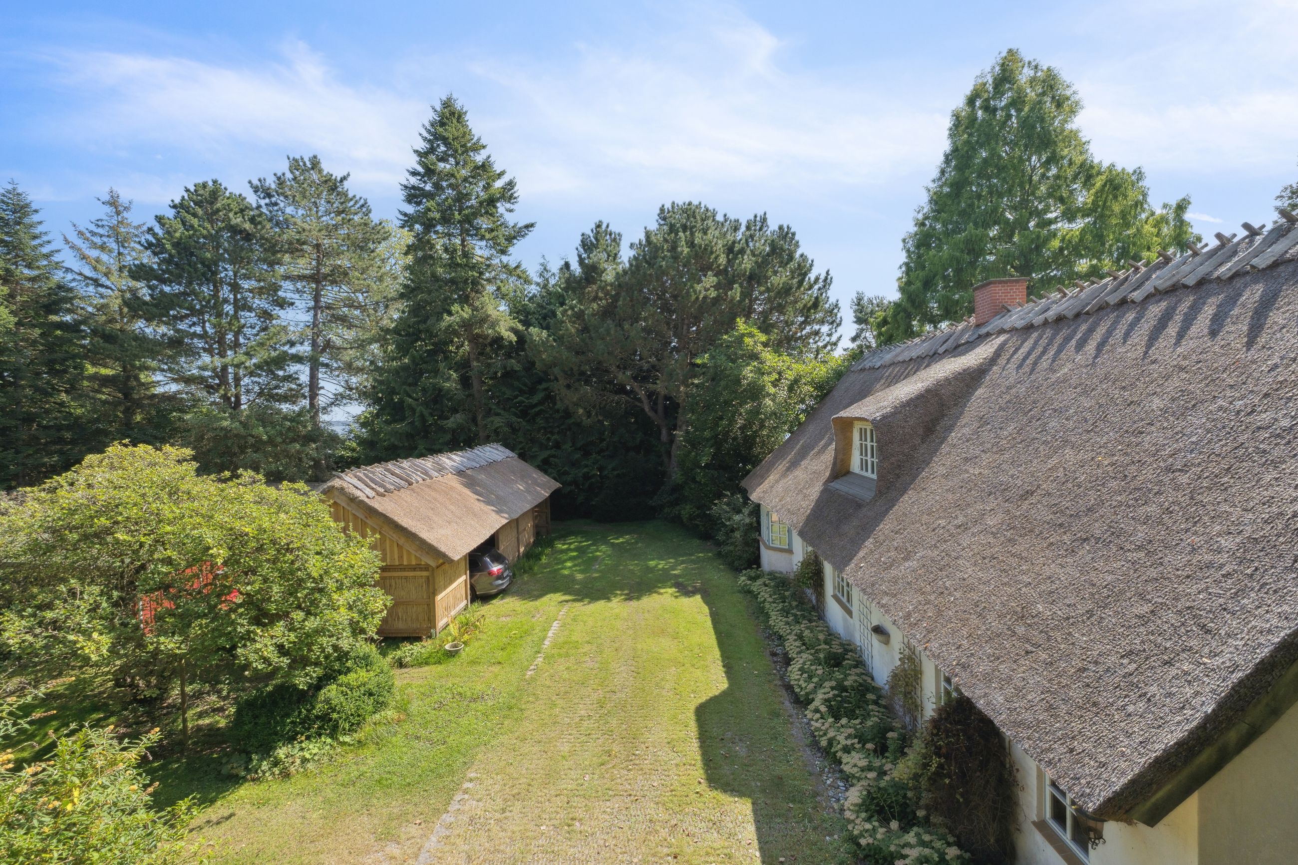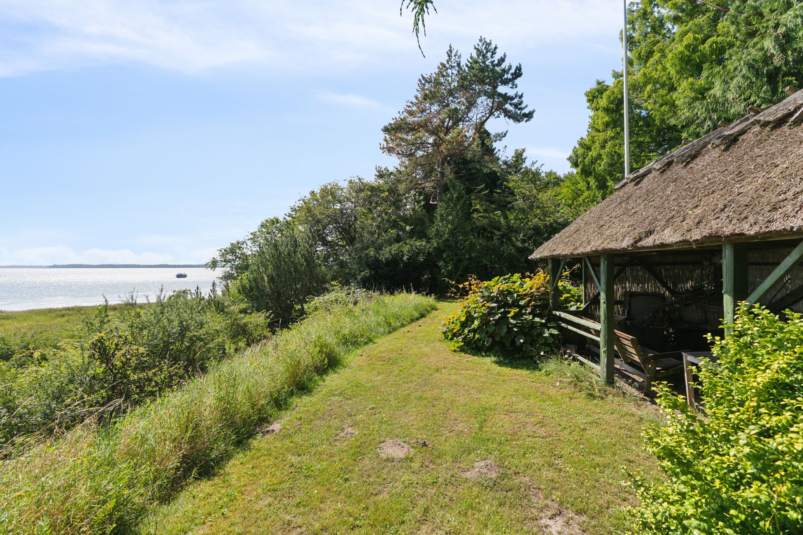 Udearealerne vælter kegler. Ikke nok med, at I kommer til at råde over en stråtækt carport, som blev totalrenoveret i 2024 og en tredobbelt garage, I kommer også til at nyde godt af den anseelige terrasse med overdækning, og mulighed for siddepladser med vue over vandet. Grunden ligger højt, og I skal gennem prydhaven ad stien på strandengen, før I befinder jer med fødderne i vandet fra fjorden.