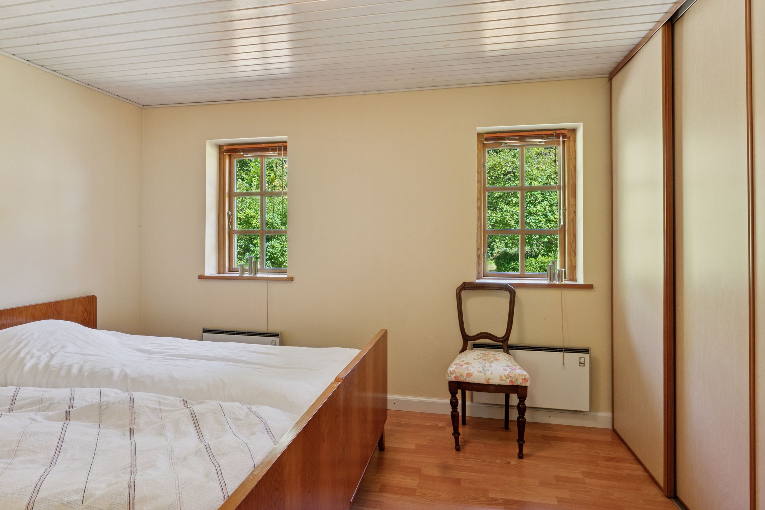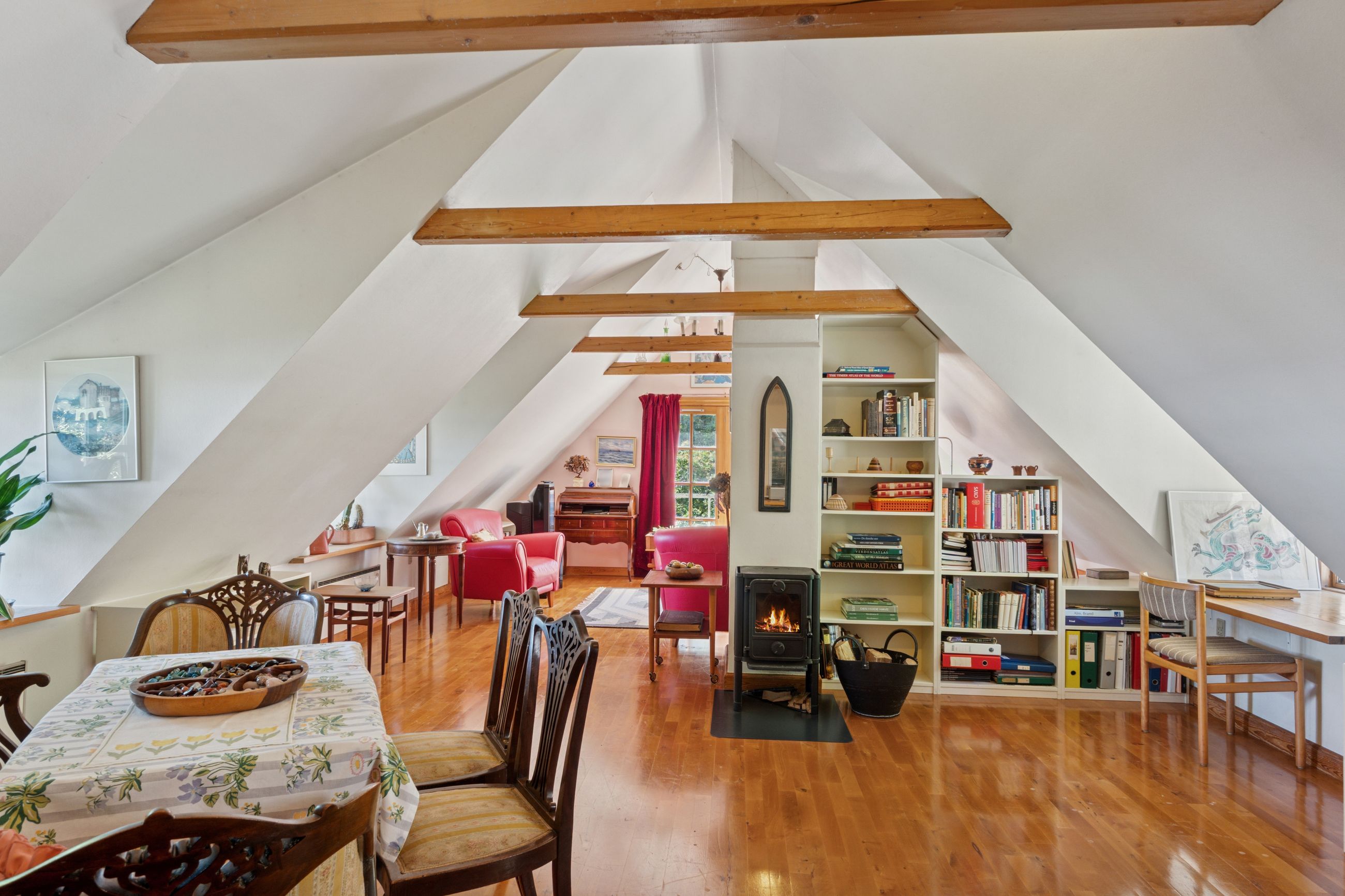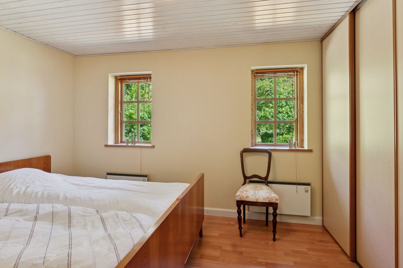 Den primære boligenhed centrerer sig omkring et skønt køkken-alrum med viktualierum og rigelig plads til madlavning og bespisning. Hertil hører også en todelt stue på førstesalen, og endelig er der fire værelser, to badeværelser og et bryggers. Der er flot bøgeparket i store dele af hjemmet samt fritlagte spær på førstesalen.