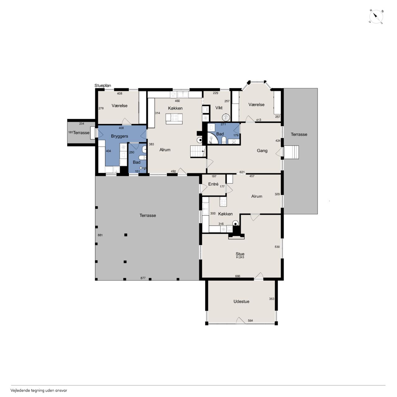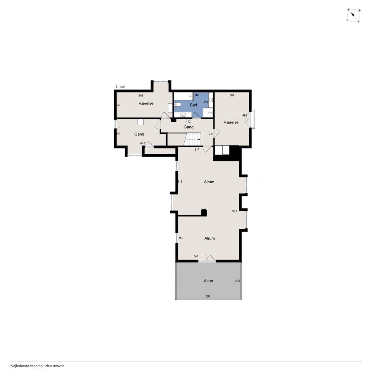Den sekundære boligenhed består af et køkken-alrum, en stue, en udestue, et soveværelse, et badeværelse og en stor gang, hvor der kan etableres bryggers, kontor eller noget helt tredje.