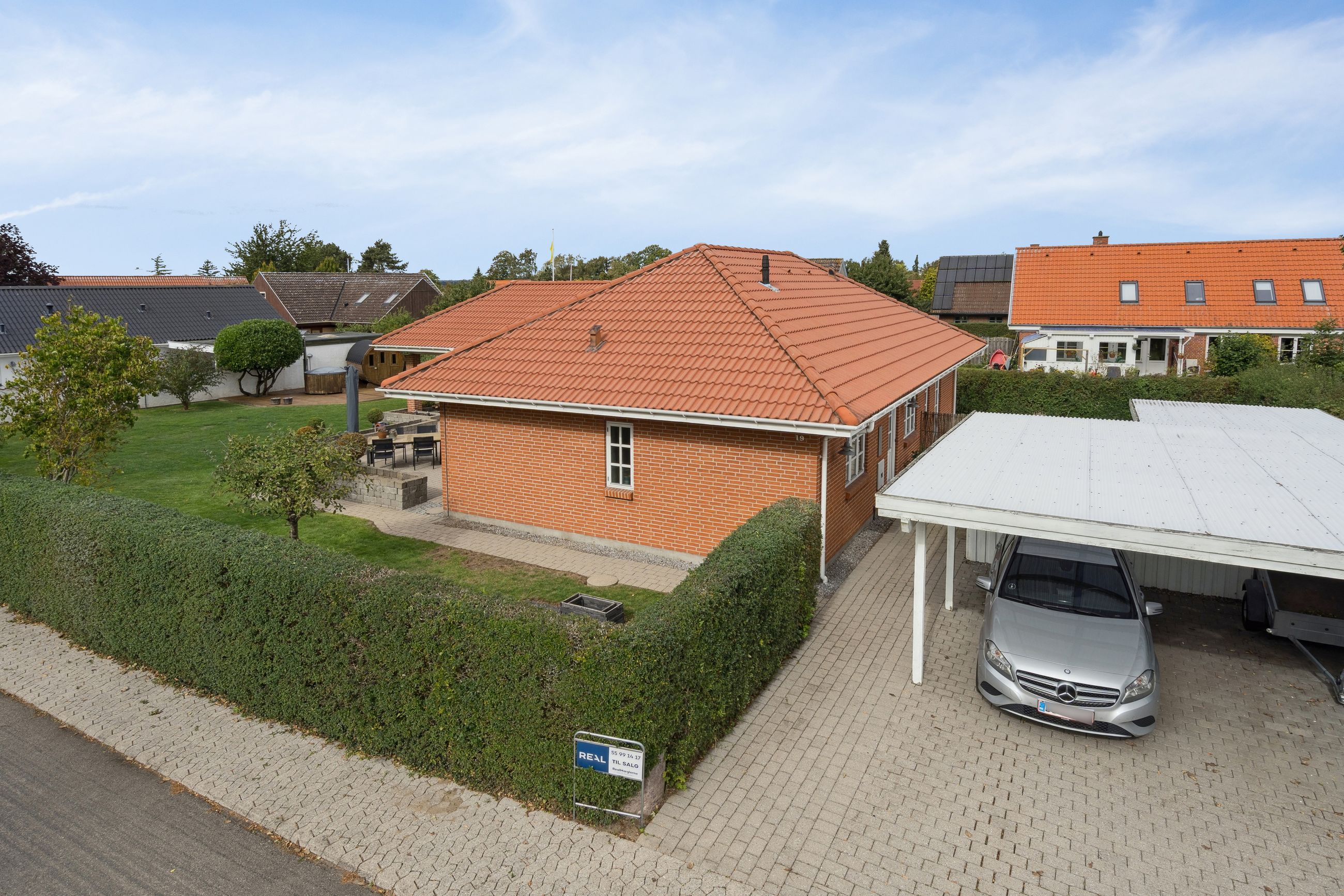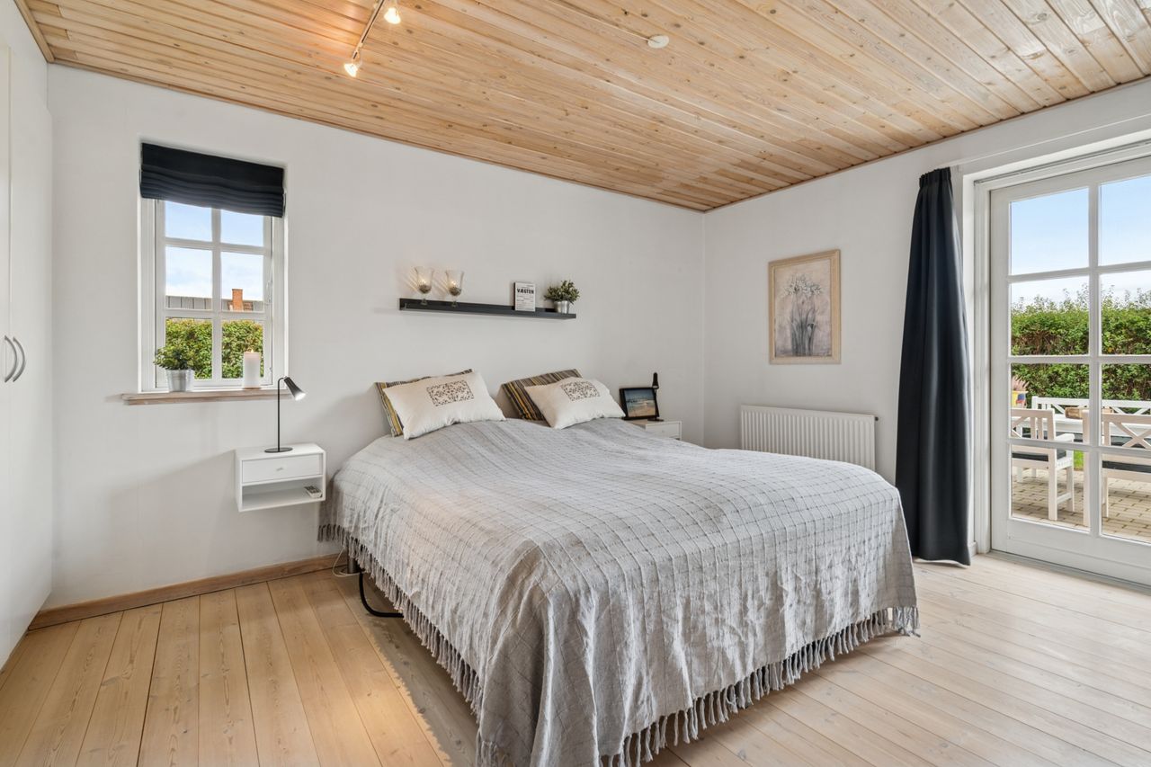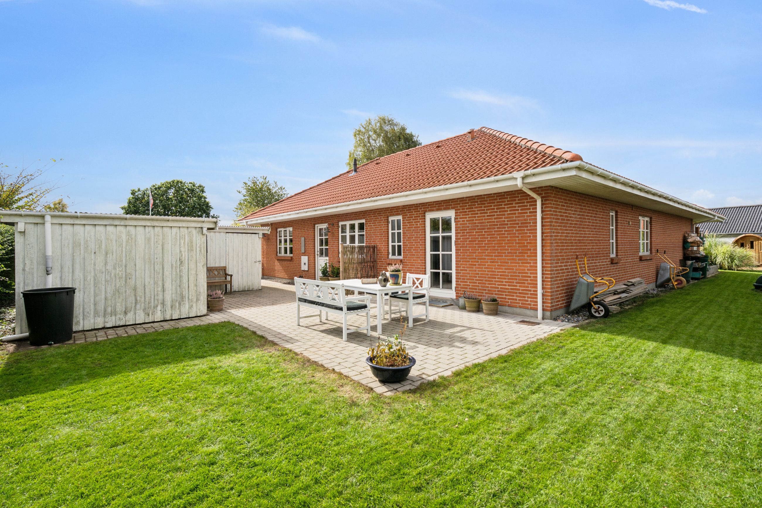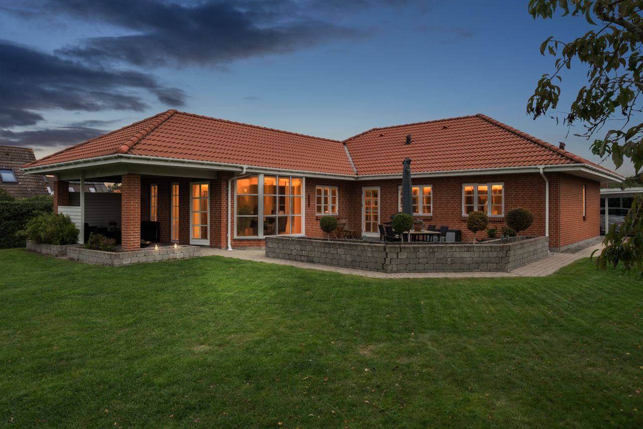 Udelivet er også i fokus med flere solrige terrasser, hvor du kan nyde både morgenkaffen og aftensmaden under åben himmel. Den nemme, vedligeholdelsesfrie have er helt lukket og ideel til både børn og kæledyr. Dobbelt carport og gode skure er allerede på plads – og det er investeringer, du ikke behøver tænke på.
