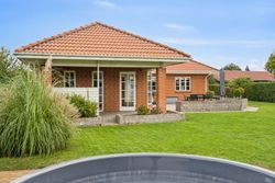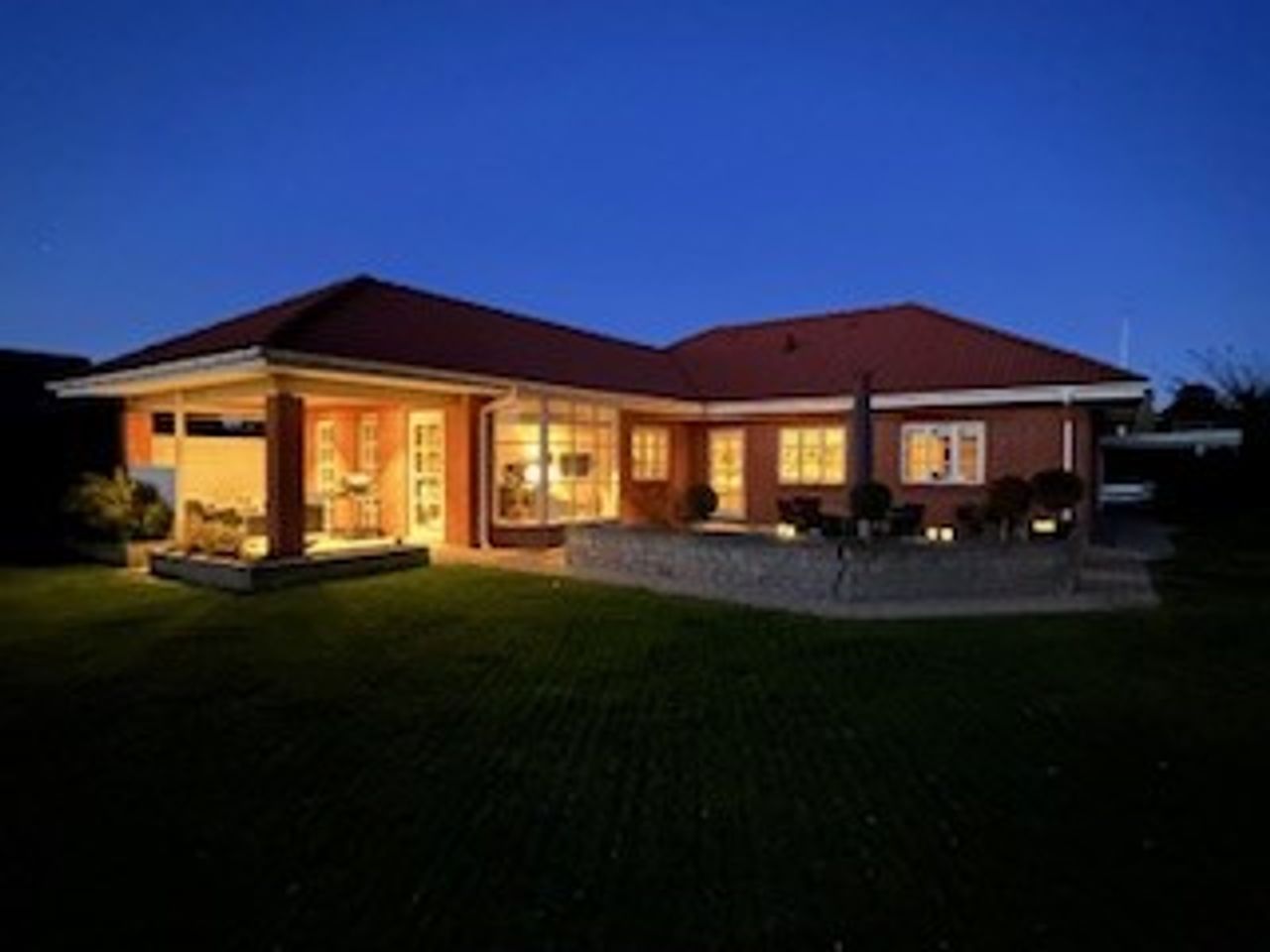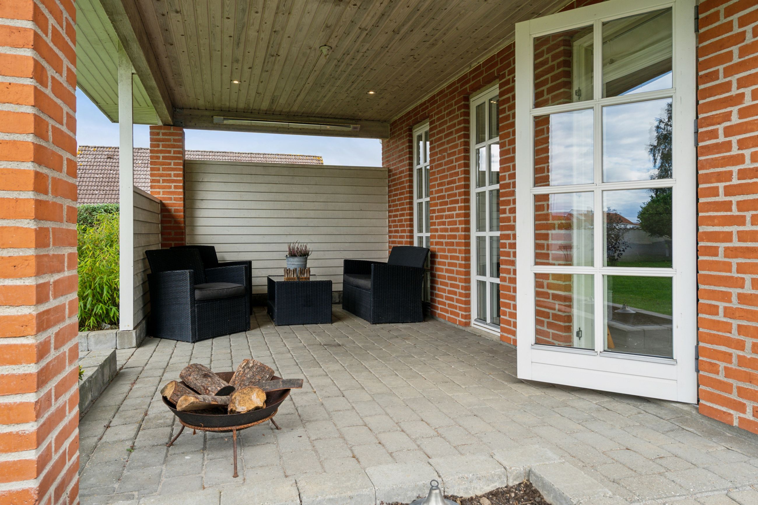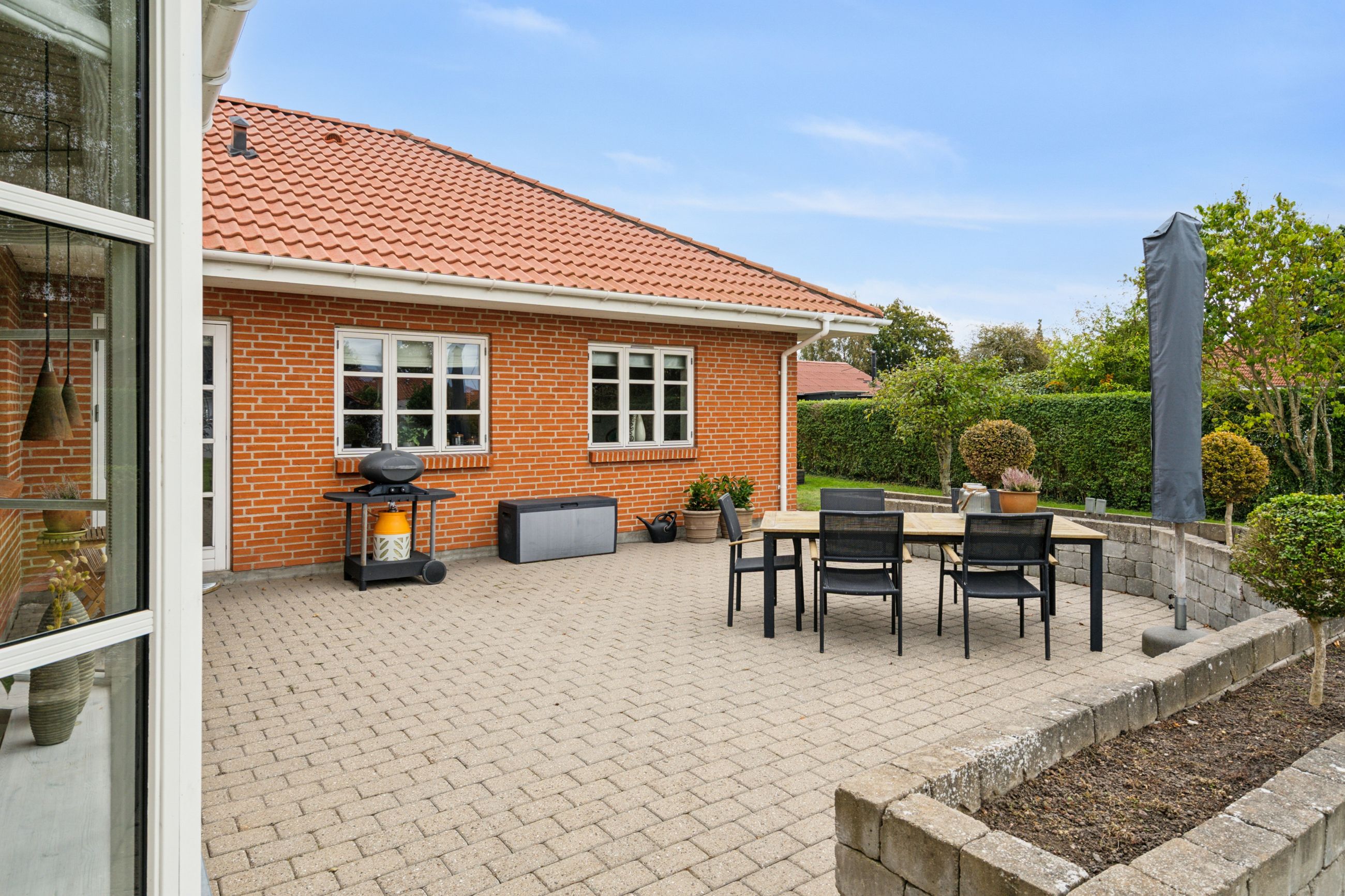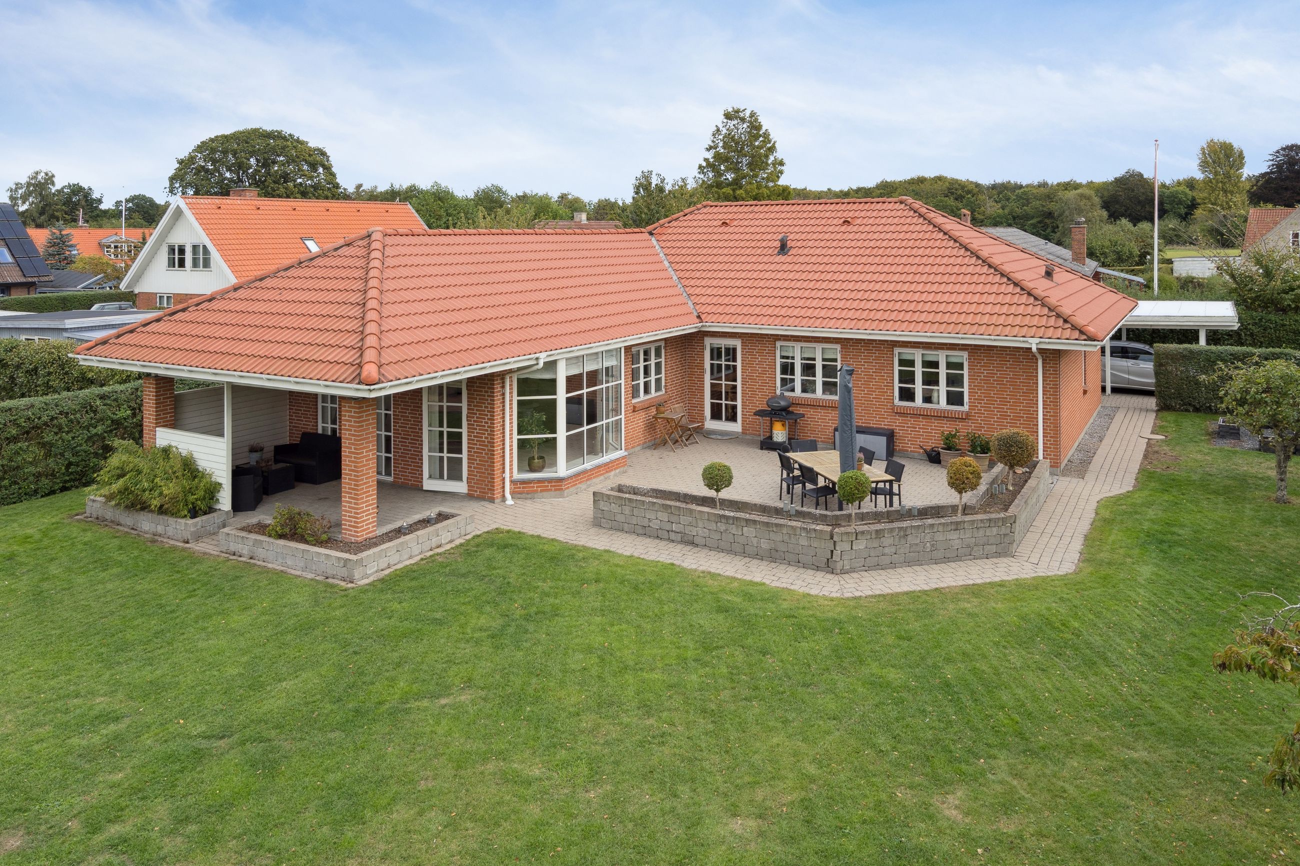 Udelivet er også i fokus med flere solrige terrasser, hvor du kan nyde både morgenkaffen og aftensmaden under åben himmel. Den nemme, vedligeholdelsesfrie have er helt lukket og ideel til både børn og kæledyr. Dobbelt carport og gode skure er allerede på plads – og det er investeringer, du ikke behøver tænke på.