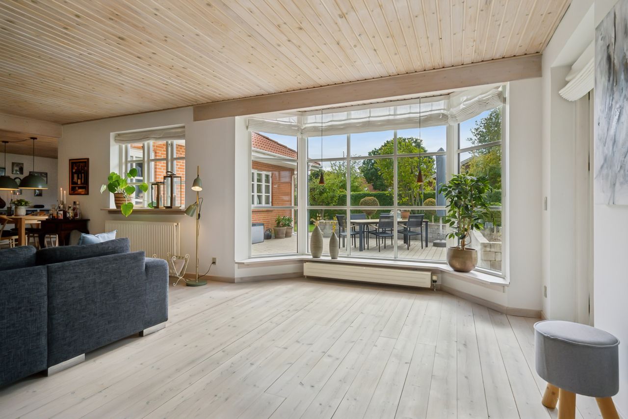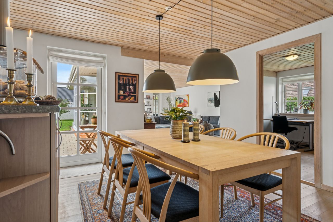 Velkommen til en lys og indbydende bolig, hvor køkken, alrum og stue smelter sammen og skaber de perfekte rammer for samvær – uanset hvor i hjemmet man opholder sig. Det flotte lysindfald og den gennemtænkte planløsning giver en varm og behagelig atmosfære året rundt. Huset er desuden særdeles energieffektivt og billigt at opvarme.
