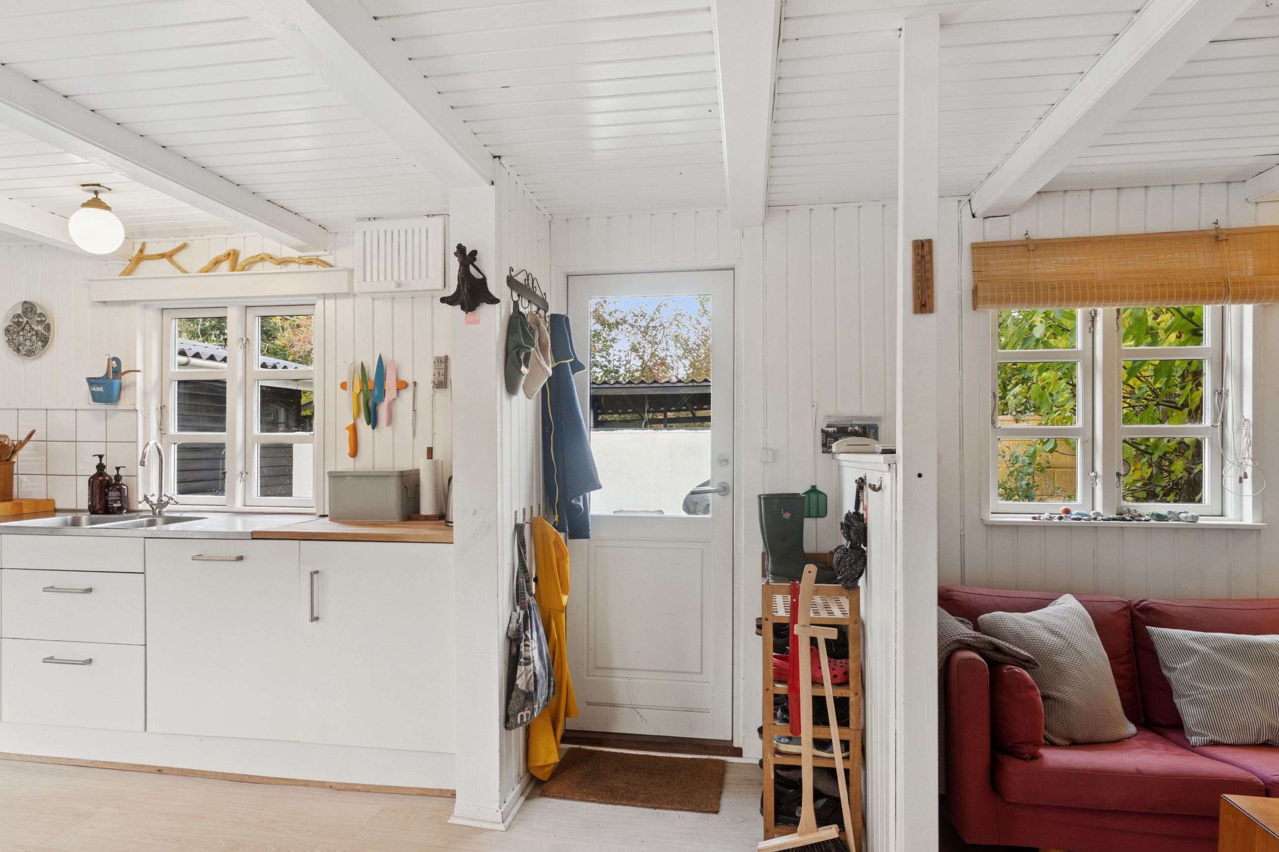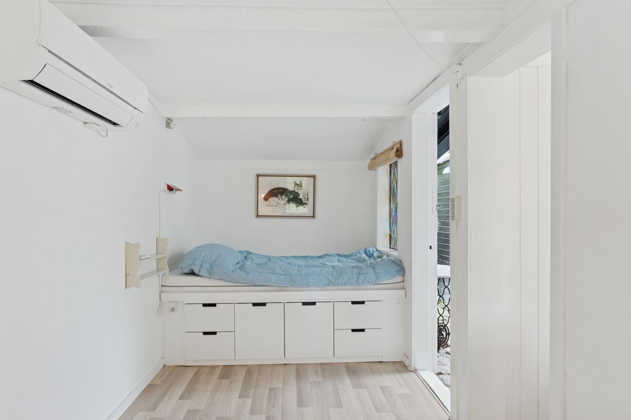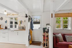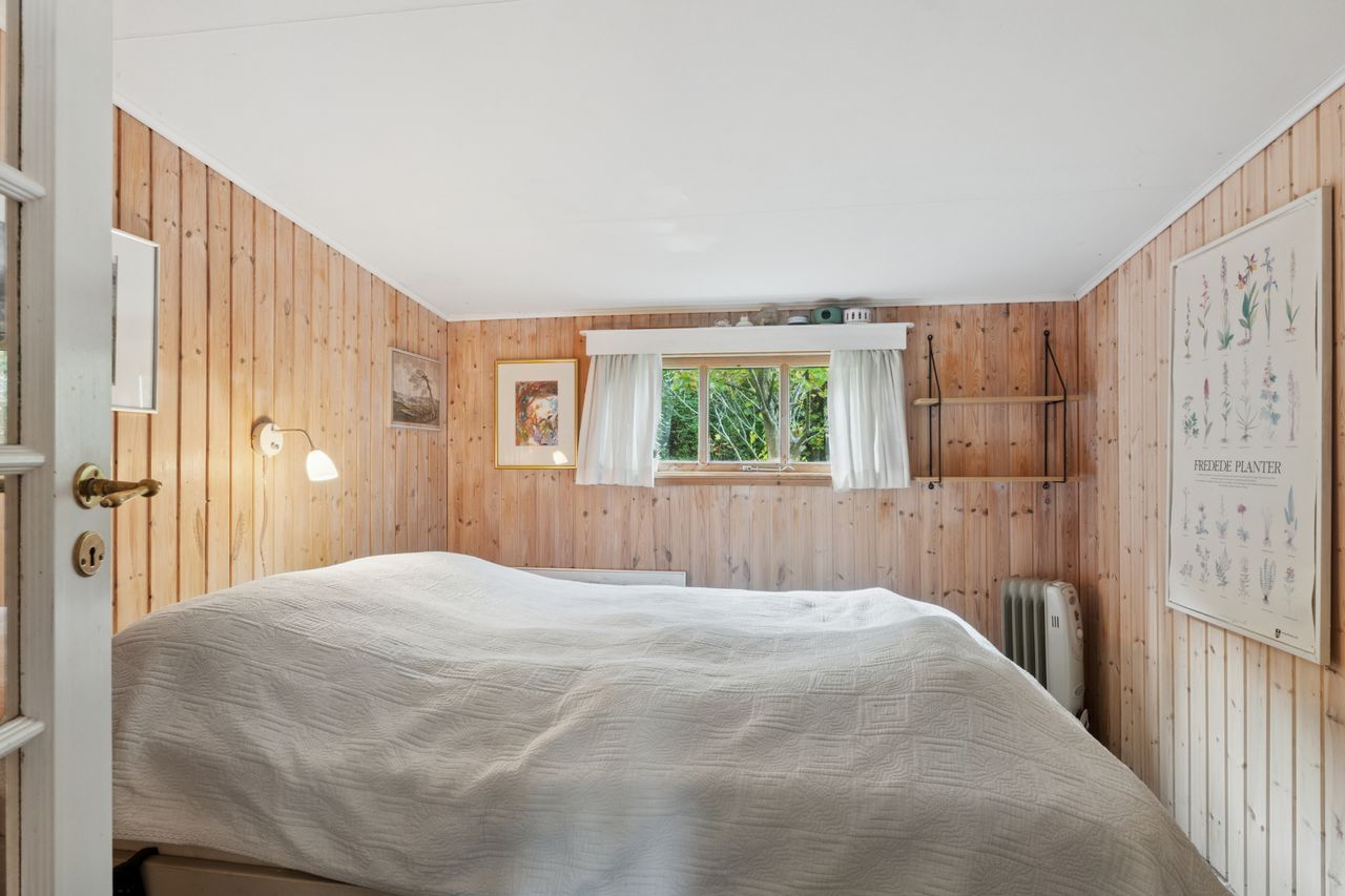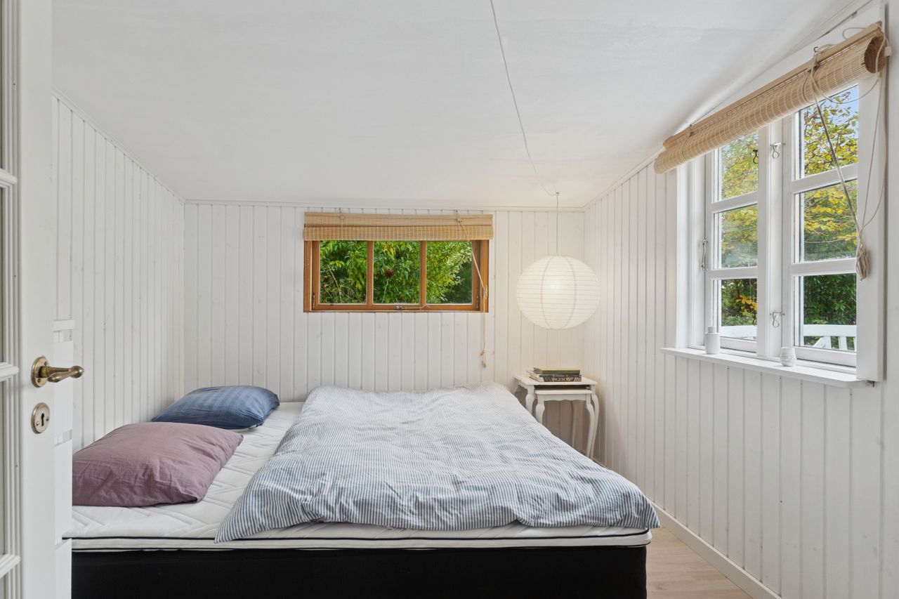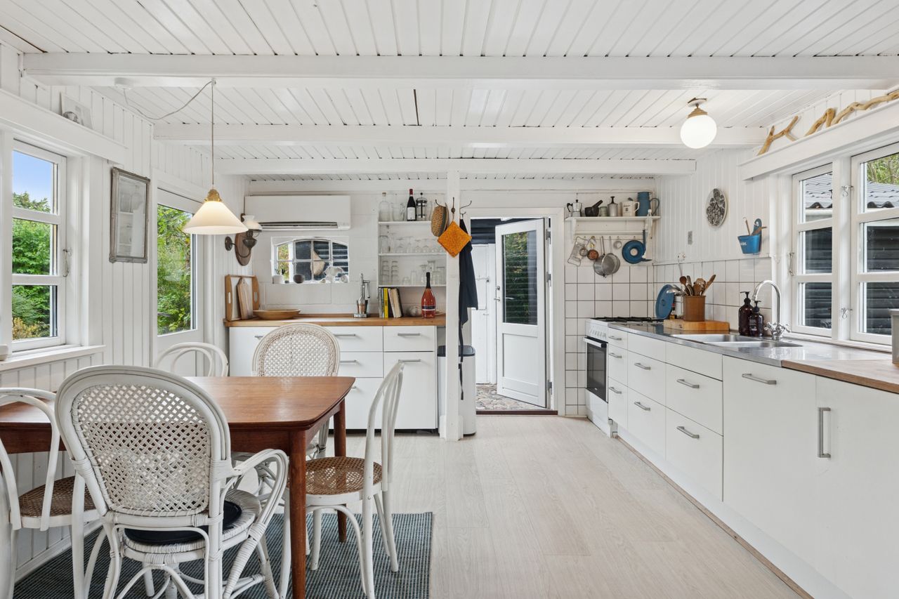 Inden døre mærker I straks stemningen af et komfortabelt sommerhus med loftsbjælkerne, og den hvide maling lysner det hele ekstra. Køkkenet er udvidet med ekstra elementer, så der er gode forhold, og rummet er åbent mod stuen. Miljøet byder på to terrassedøre. Huset har også fået skiftet gulve, og så er der etableret et ekstra soveværelse, så der nu er to værelser i hovedhuset. I annekset finder I to værelser samt et bryggers og et badeværelse.