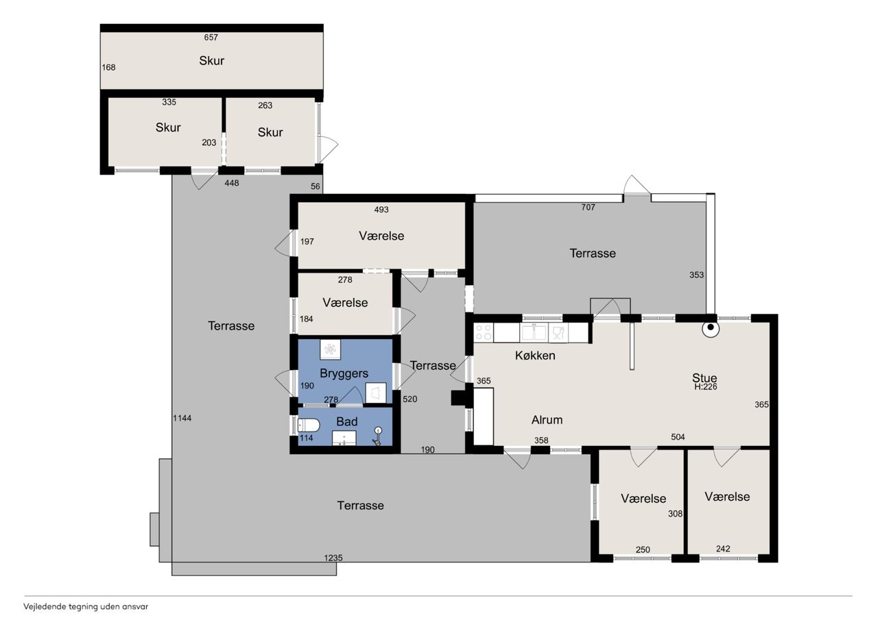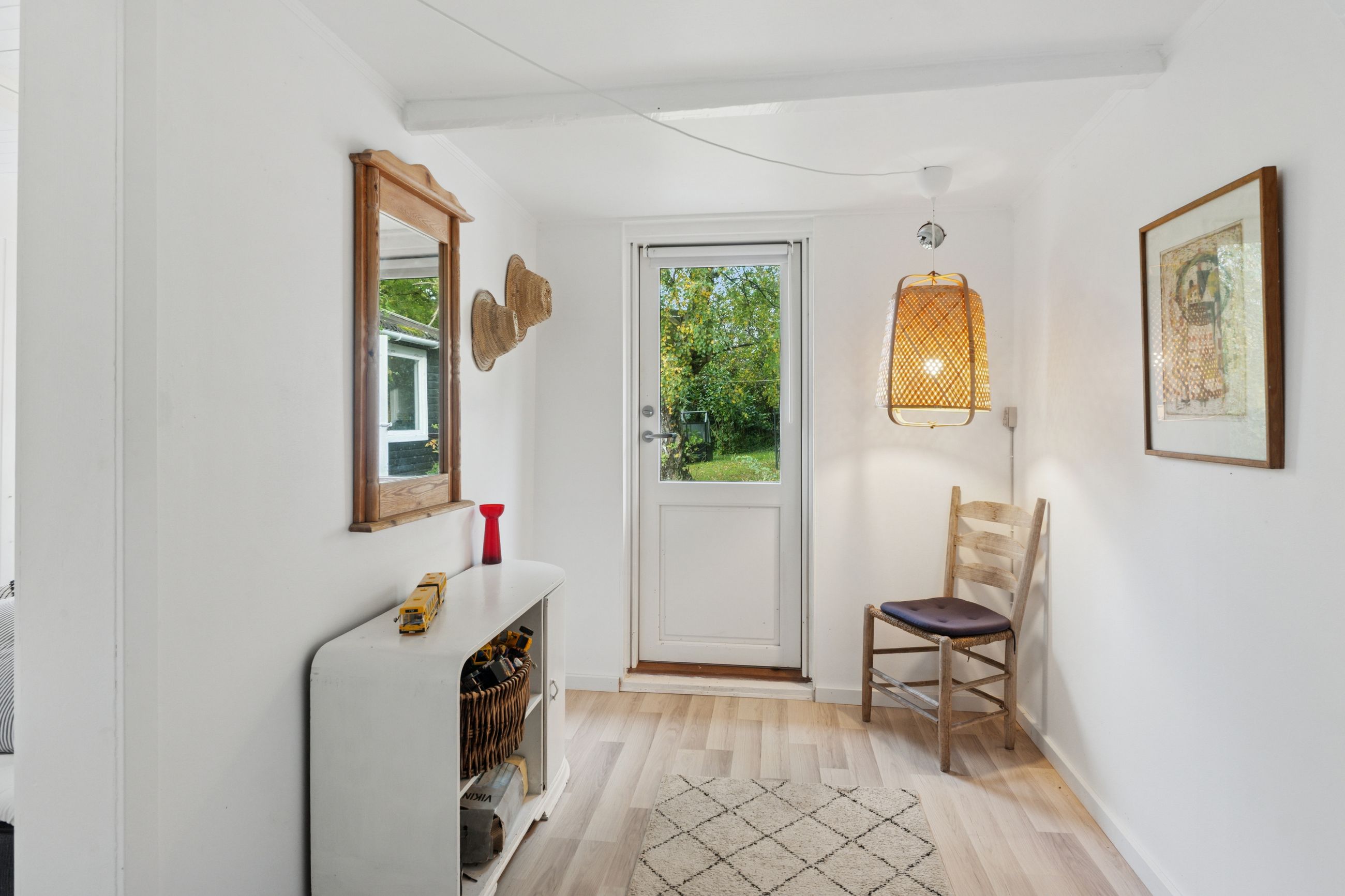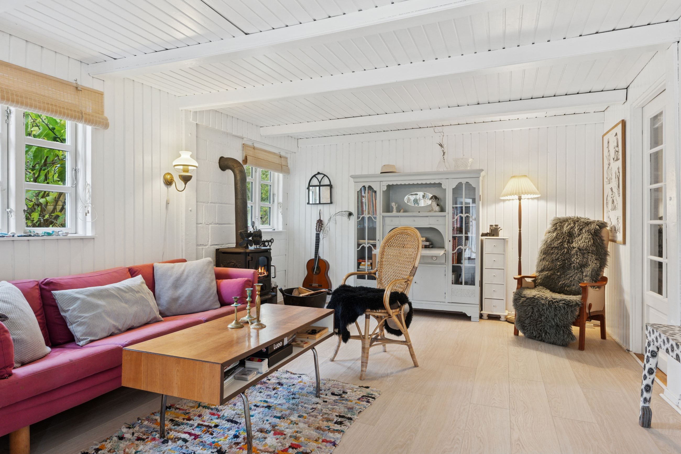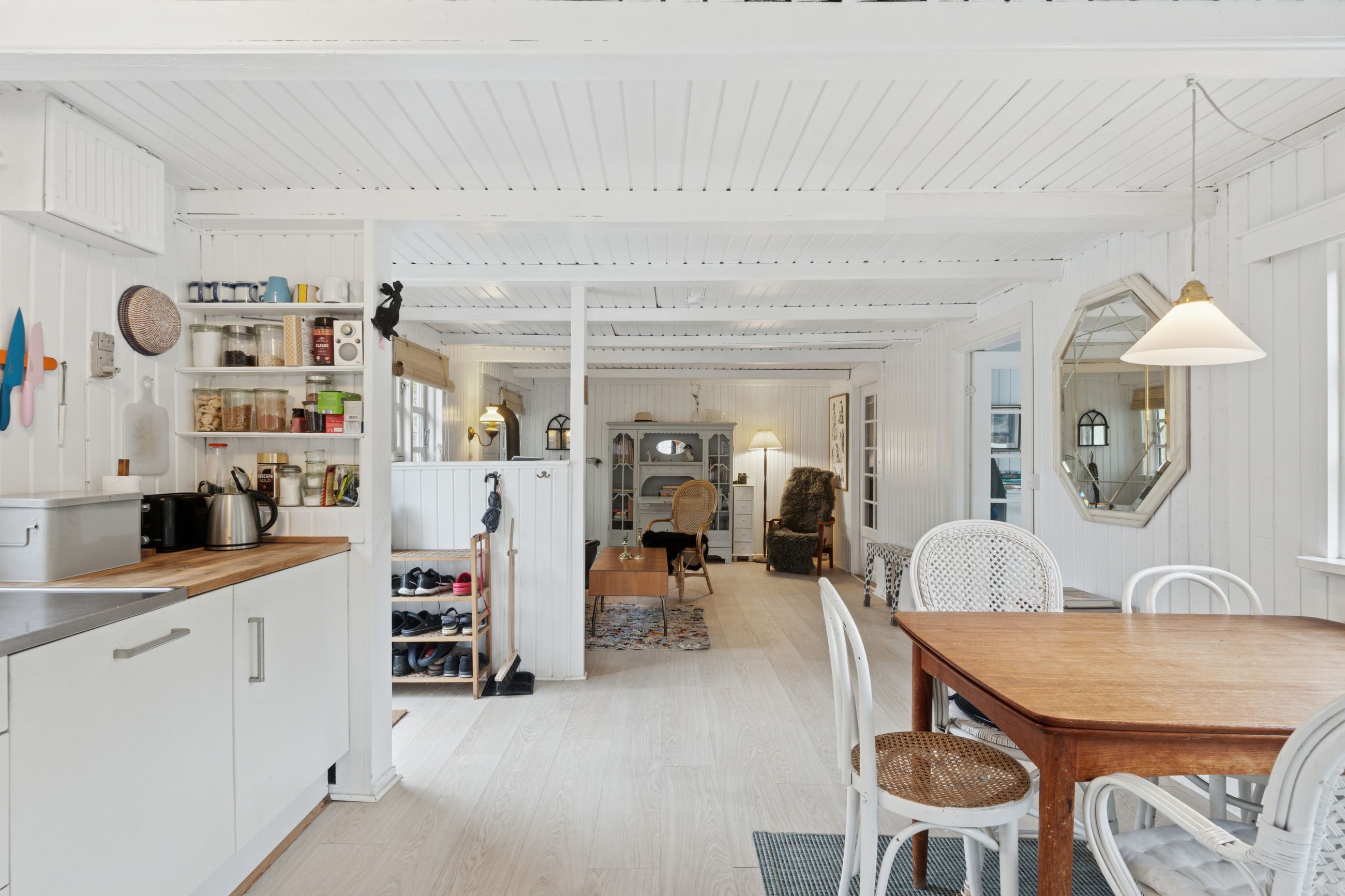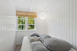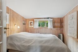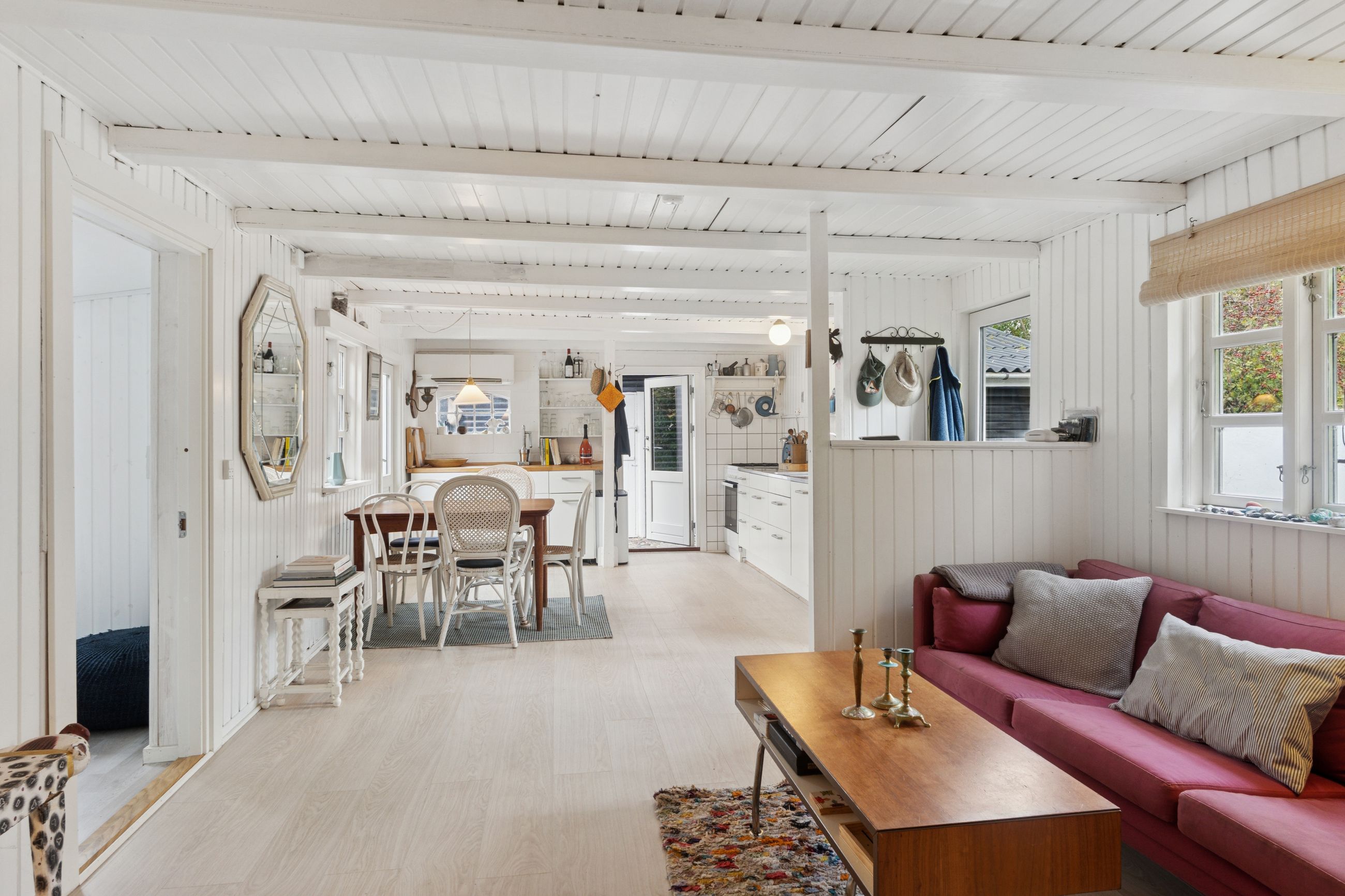 Inden døre mærker I straks stemningen af et komfortabelt sommerhus med loftsbjælkerne, og den hvide maling lysner det hele ekstra. Køkkenet er udvidet med ekstra elementer, så der er gode forhold, og rummet er åbent mod stuen. Miljøet byder på to terrassedøre. Huset har også fået skiftet gulve, og så er der etableret et ekstra soveværelse, så der nu er to værelser i hovedhuset. I annekset finder I to værelser samt et bryggers og et badeværelse.