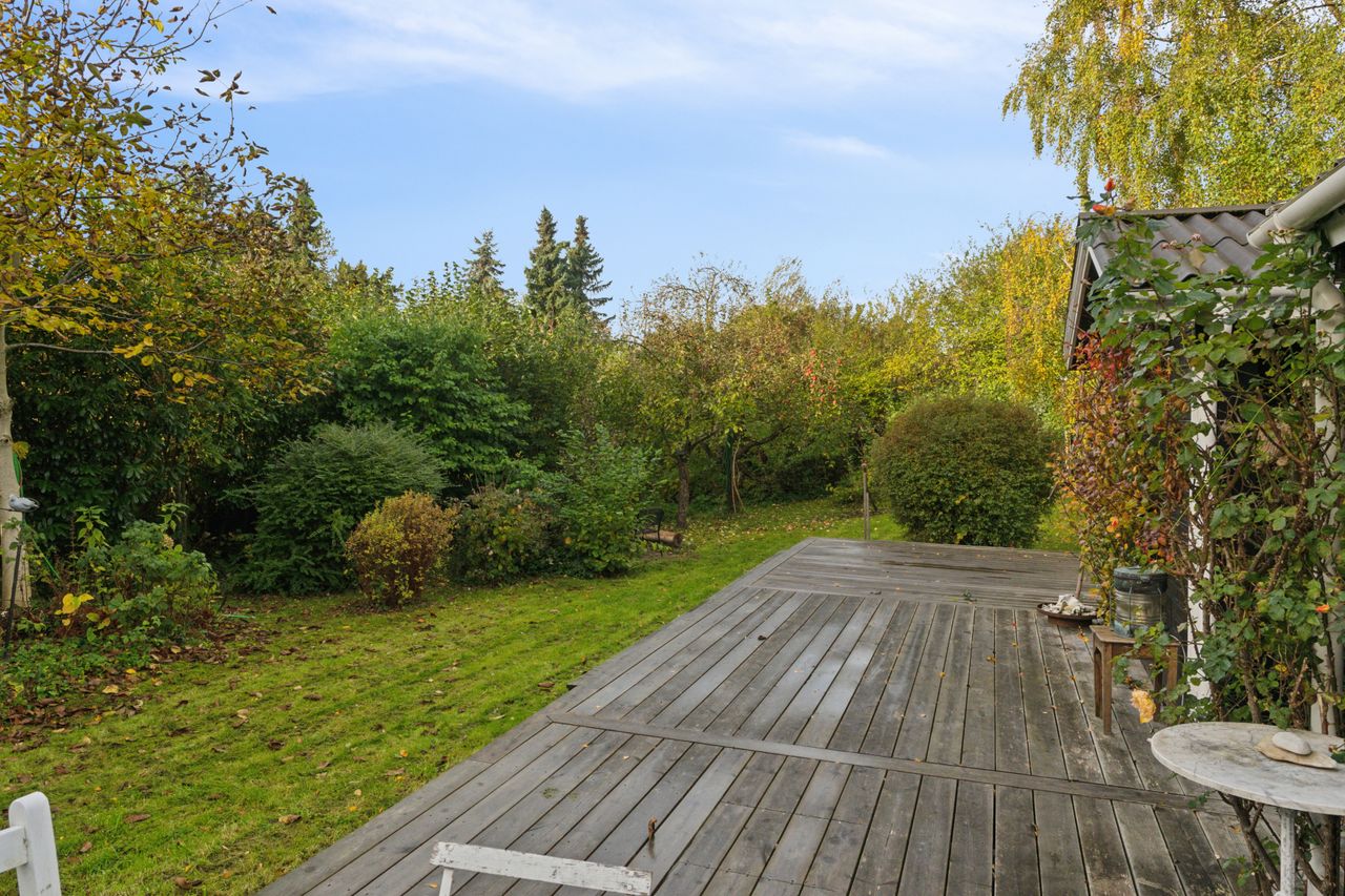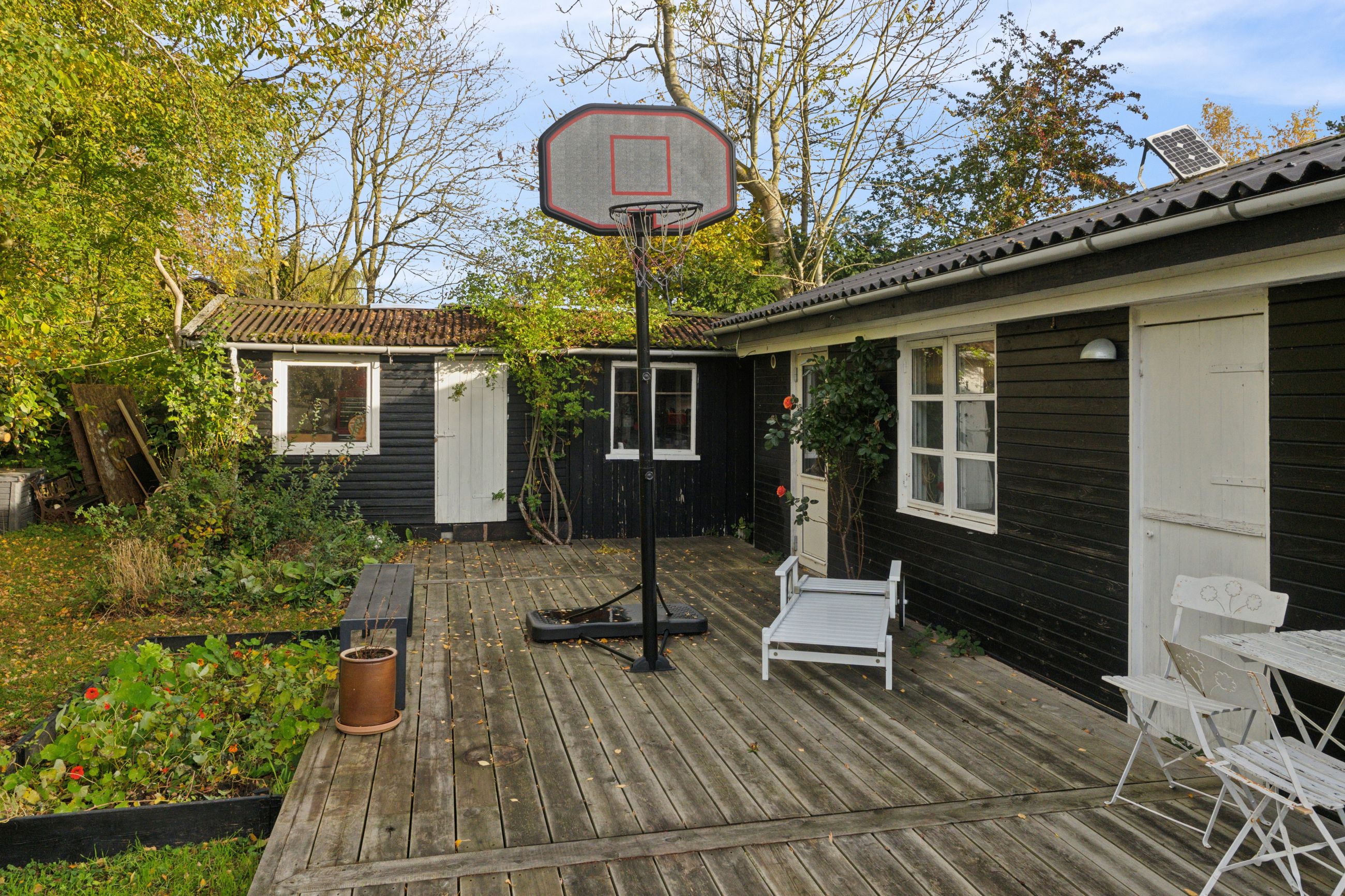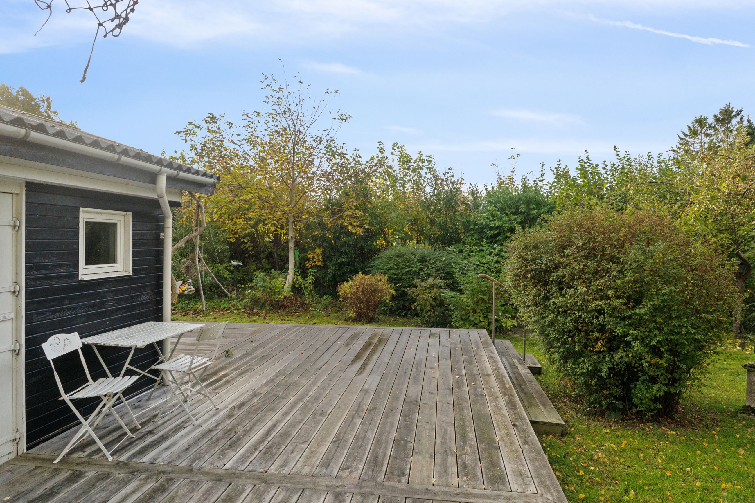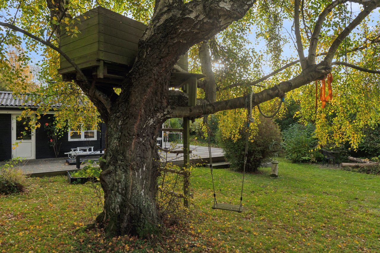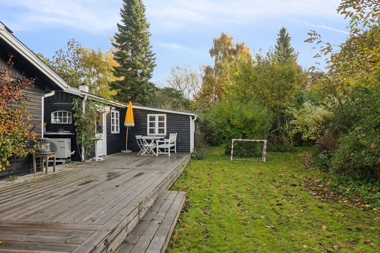 Tilbage på adressen troner sommerhuset med en sort facade med hvide sprossevinduer, og boligen ligger på en 1.142 kvm stor grund, der er helt særlig. Haven er i sig selv omkranset af natur, og det giver en privat og fredelig oase, der changerer smukt i takt med årstidernes gang. Idyllen bliver højnet lidt ekstra af legehytten i træet og det faktum, at den vilde påfugl kan finde på at besøge haven. Man har renoveret stedet løbende siden 2020, og en af forbedringerne er den store, markante træterrasse, som strækker sig til flere sider og forbinder huset og annekset.