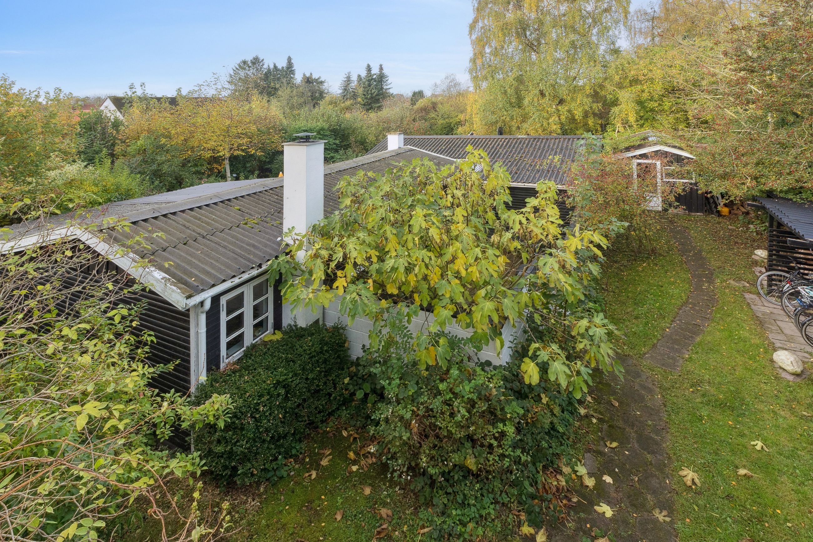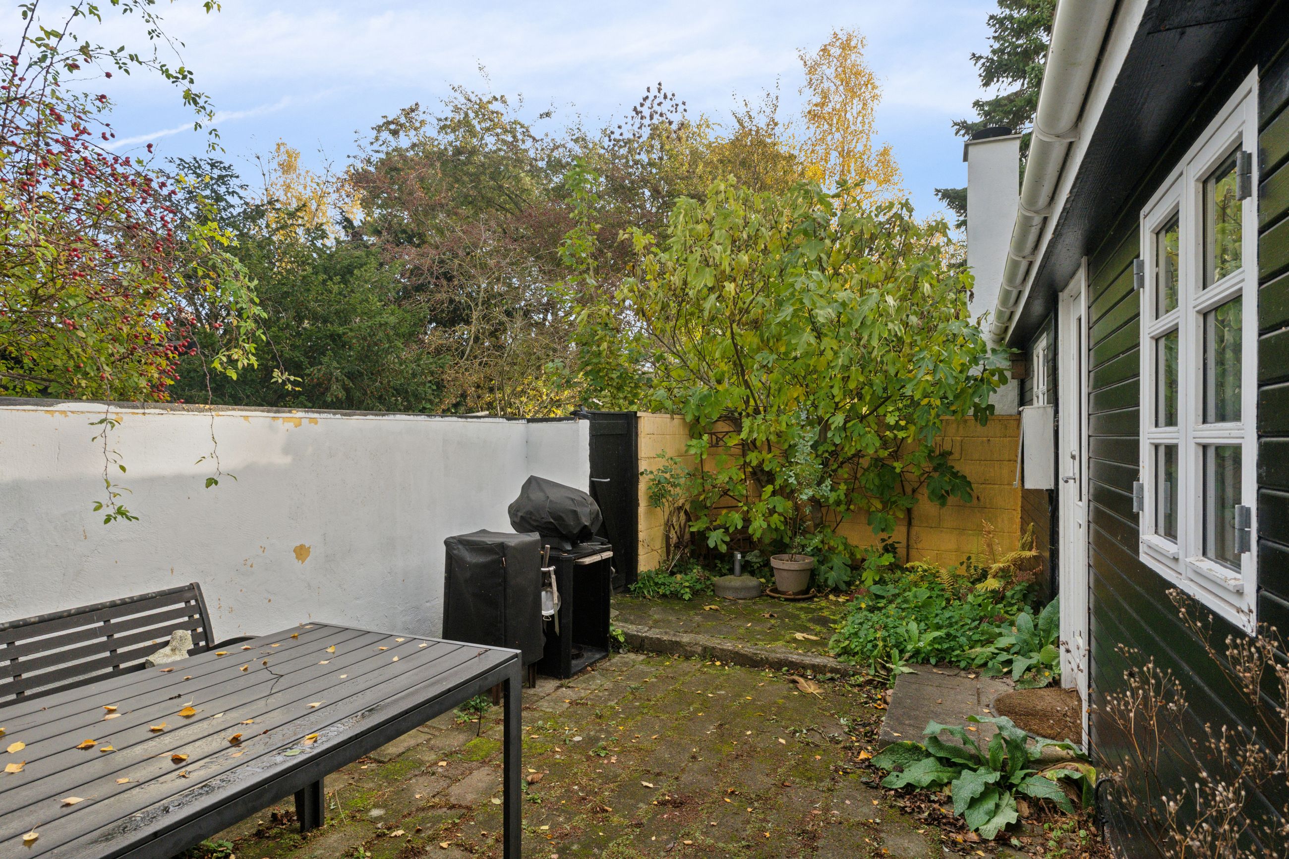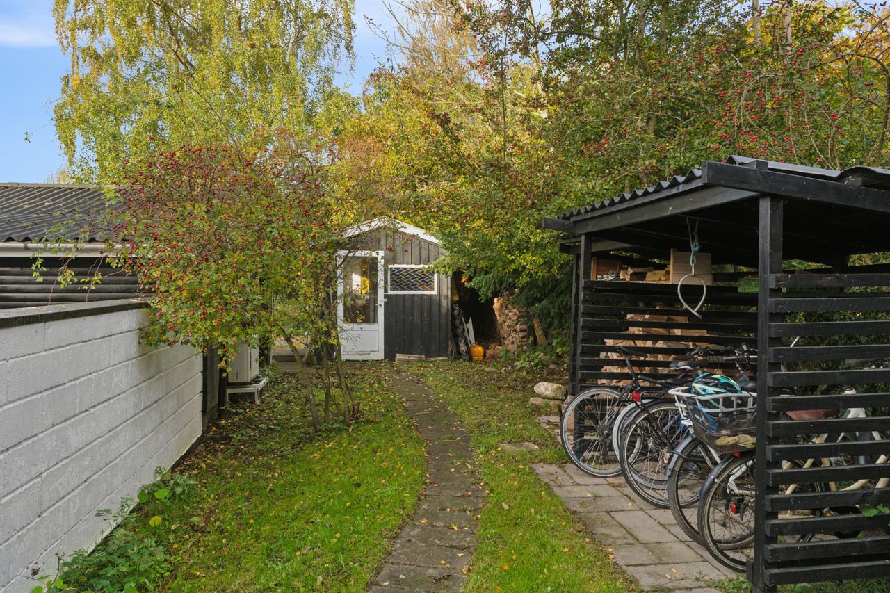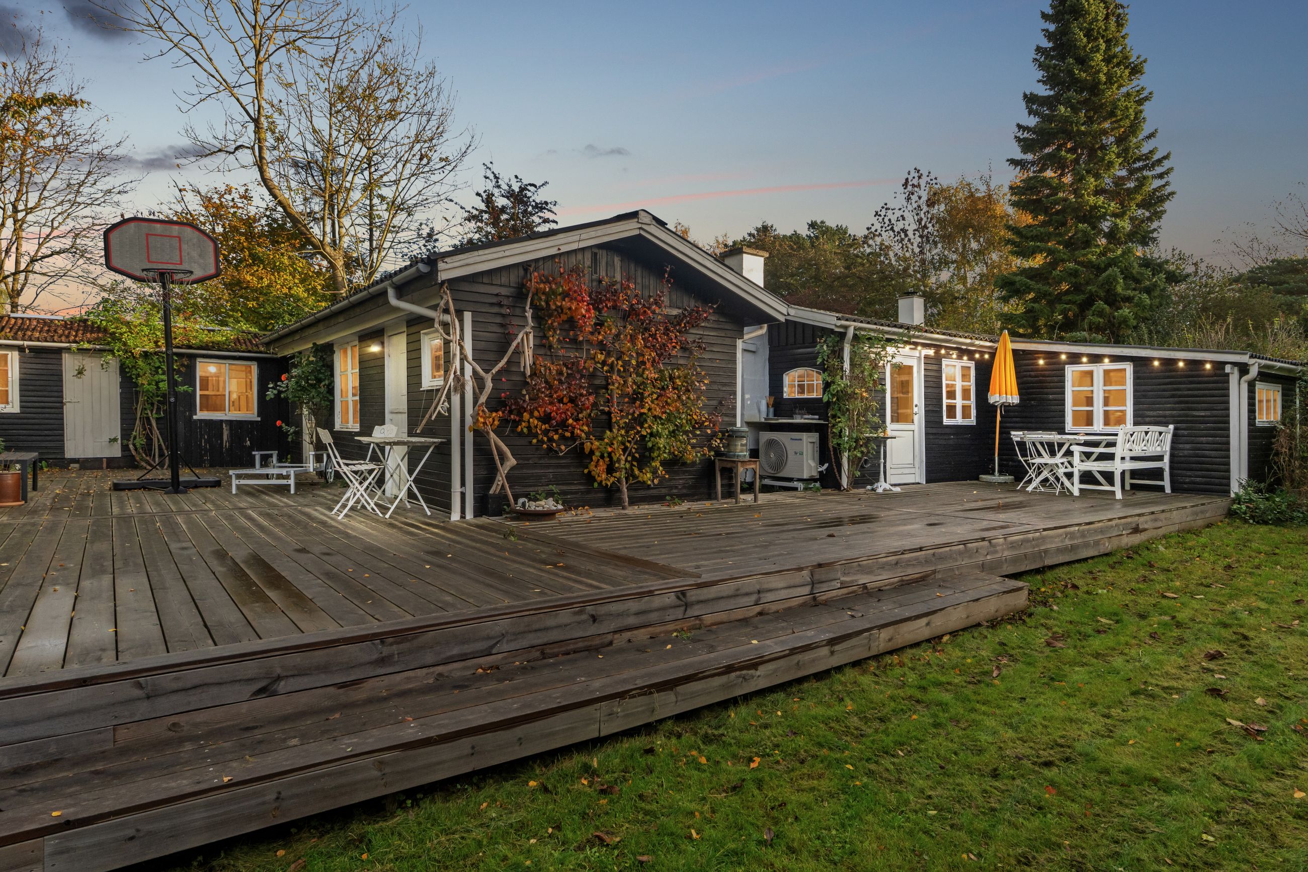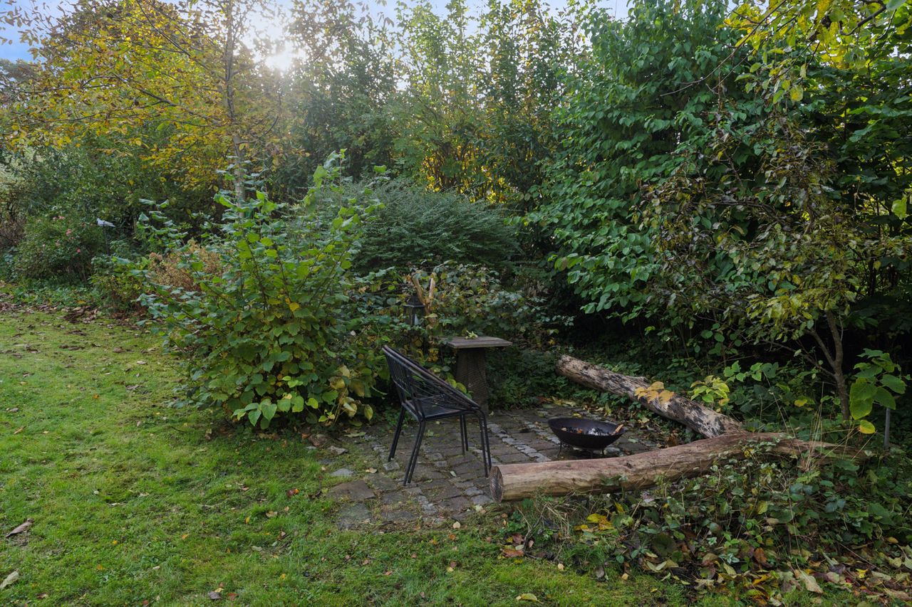 Tilbage på adressen troner sommerhuset med en sort facade med hvide sprossevinduer, og boligen ligger på en 1.142 kvm stor grund, der er helt særlig. Haven er i sig selv omkranset af natur, og det giver en privat og fredelig oase, der changerer smukt i takt med årstidernes gang. Idyllen bliver højnet lidt ekstra af legehytten i træet og det faktum, at den vilde påfugl kan finde på at besøge haven. Man har renoveret stedet løbende siden 2020, og en af forbedringerne er den store, markante træterrasse, som strækker sig til flere sider og forbinder huset og annekset.