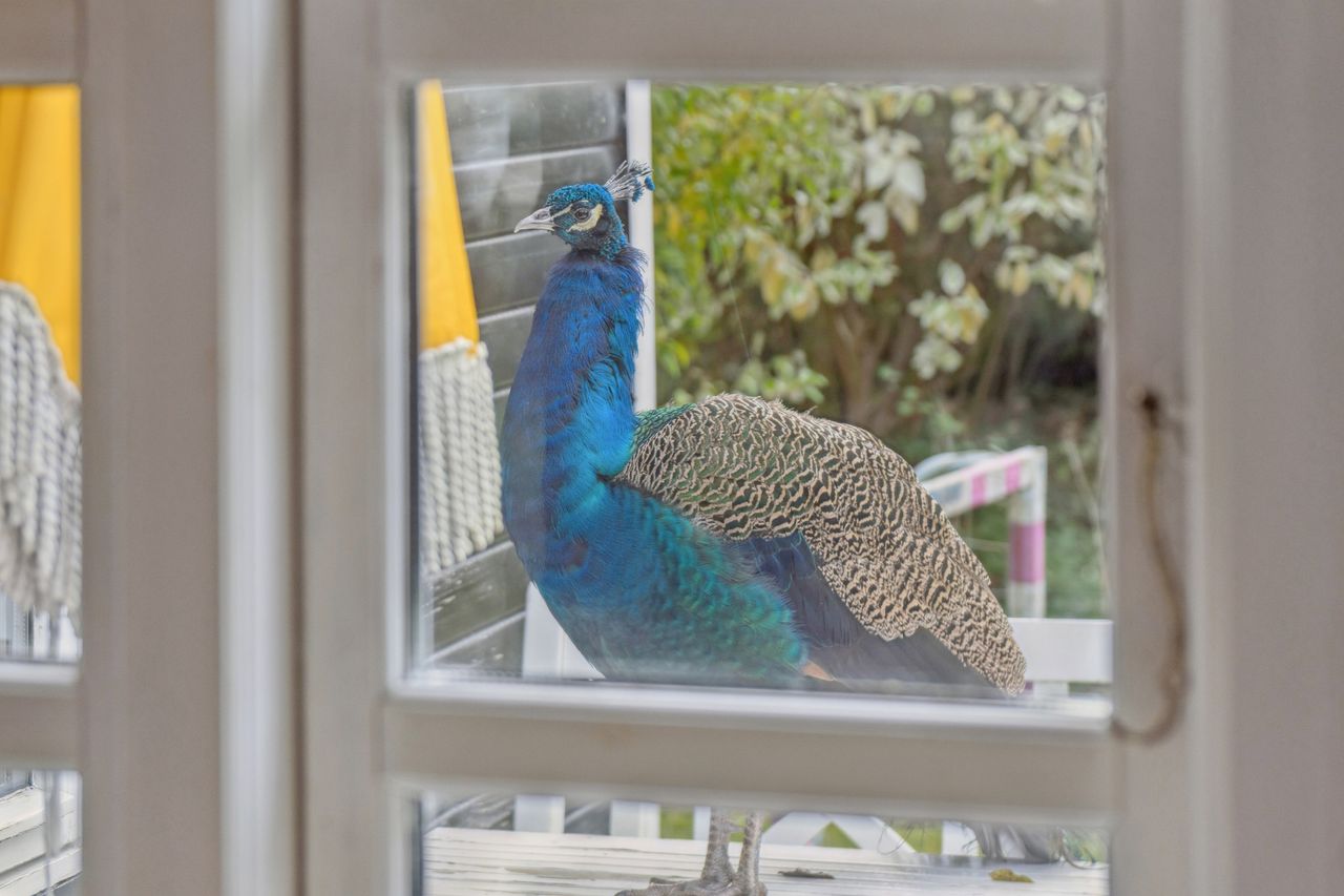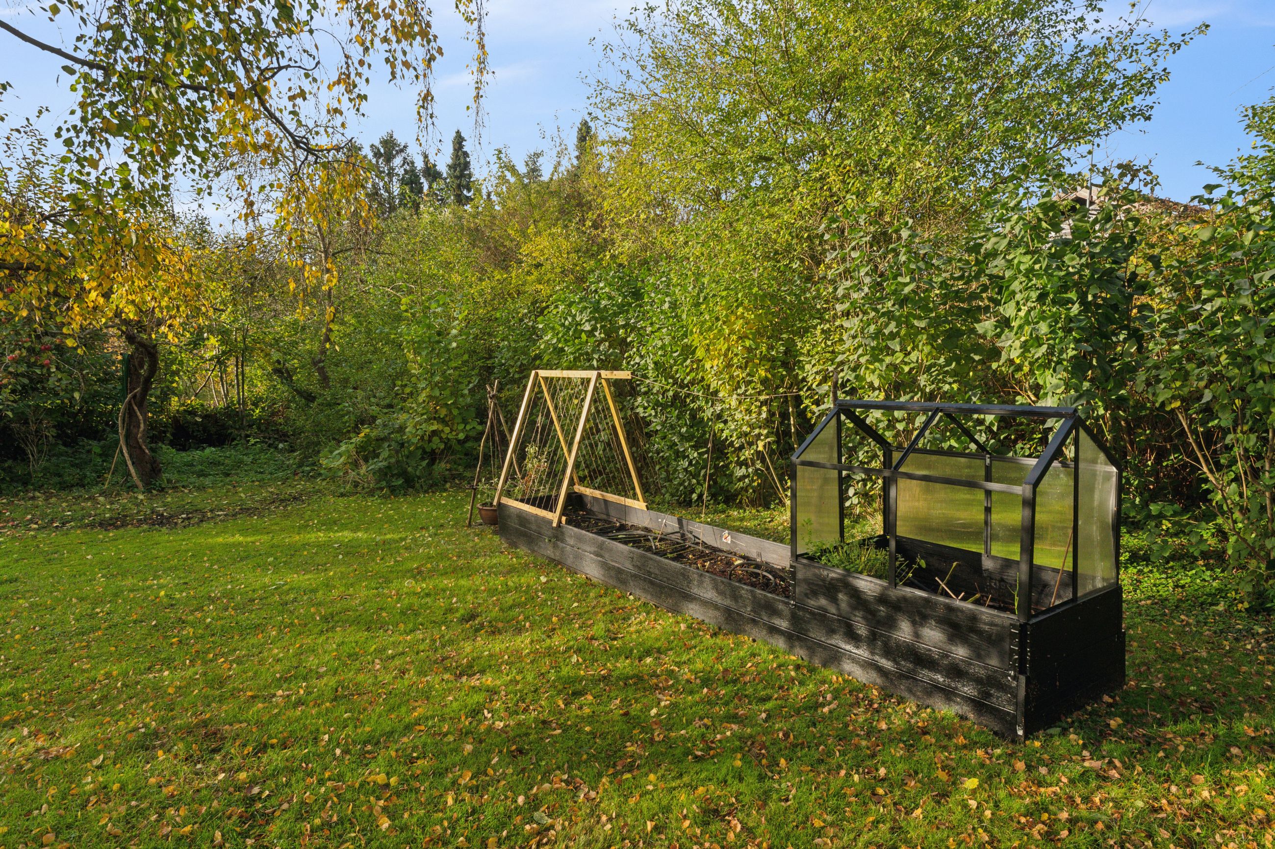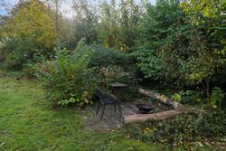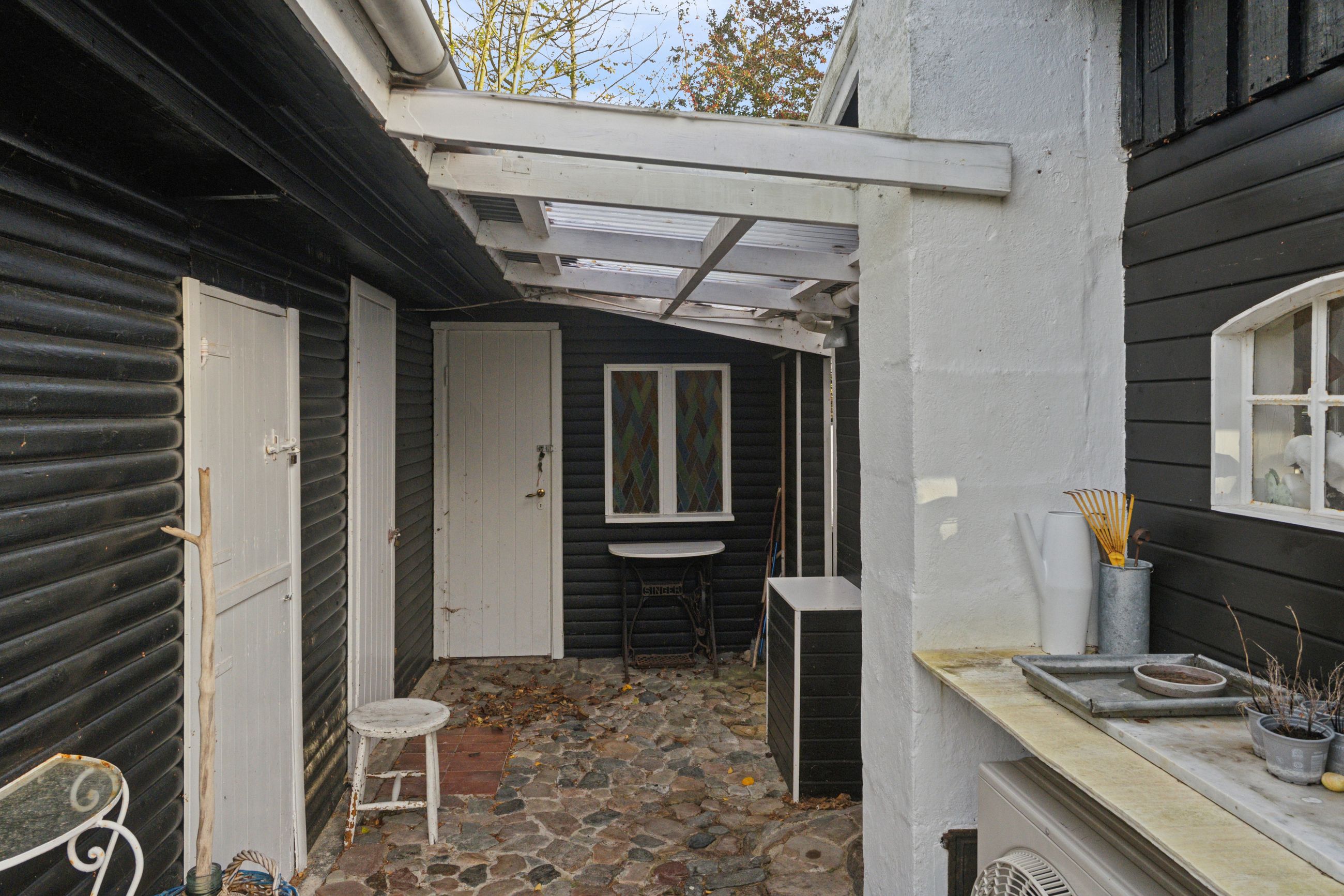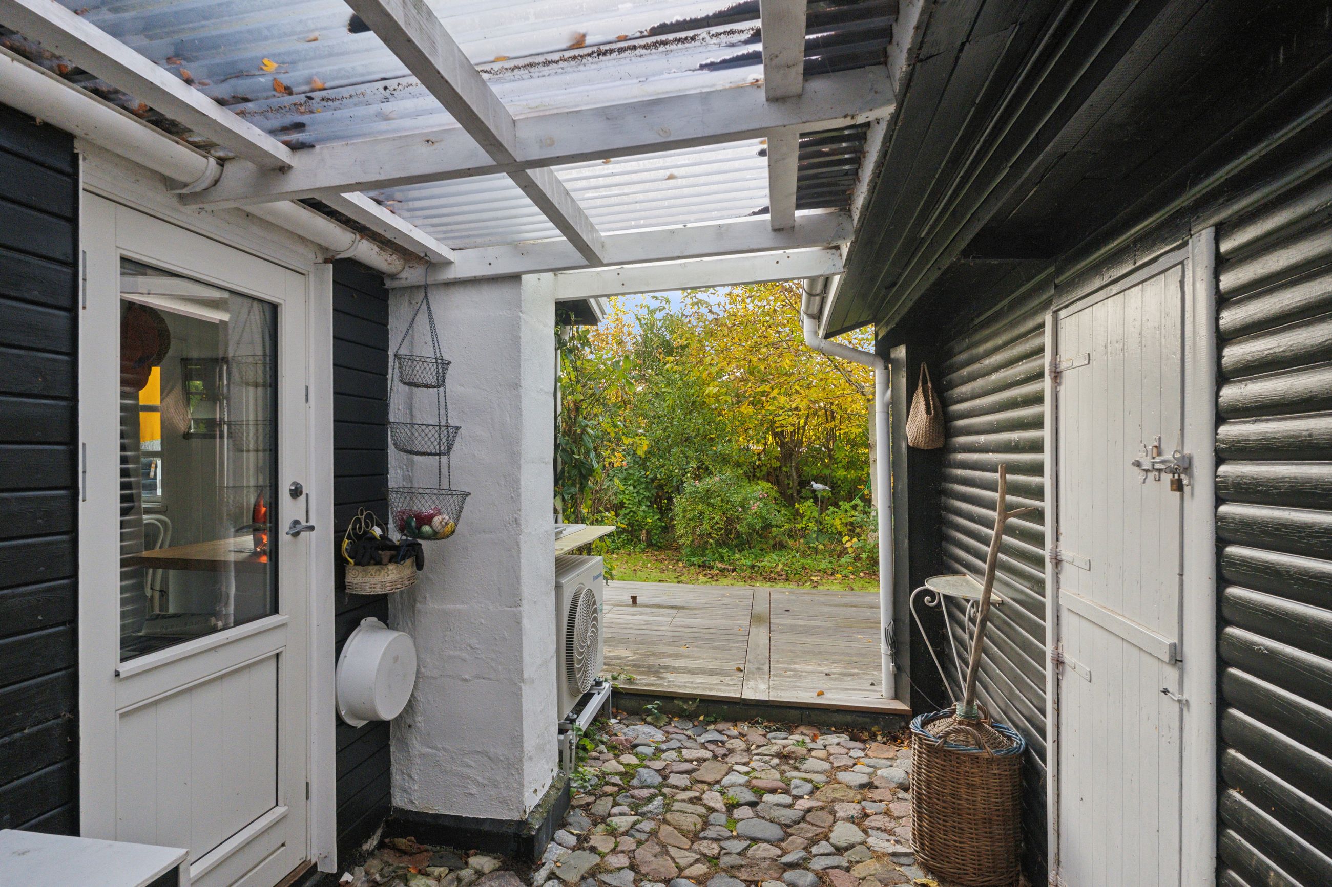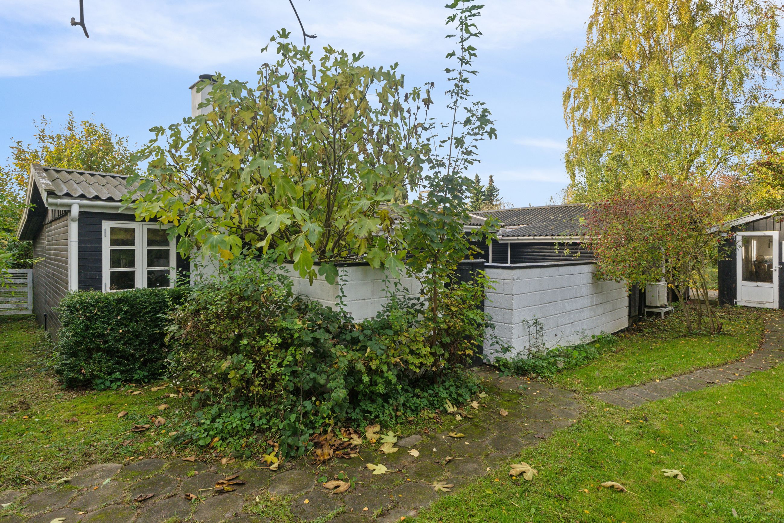 Tilbage på adressen troner sommerhuset med en sort facade med hvide sprossevinduer, og boligen ligger på en 1.142 kvm stor grund, der er helt særlig. Haven er i sig selv omkranset af natur, og det giver en privat og fredelig oase, der changerer smukt i takt med årstidernes gang. Idyllen bliver højnet lidt ekstra af legehytten i træet og det faktum, at den vilde påfugl kan finde på at besøge haven. Man har renoveret stedet løbende siden 2020, og en af forbedringerne er den store, markante træterrasse, som strækker sig til flere sider og forbinder huset og annekset.
