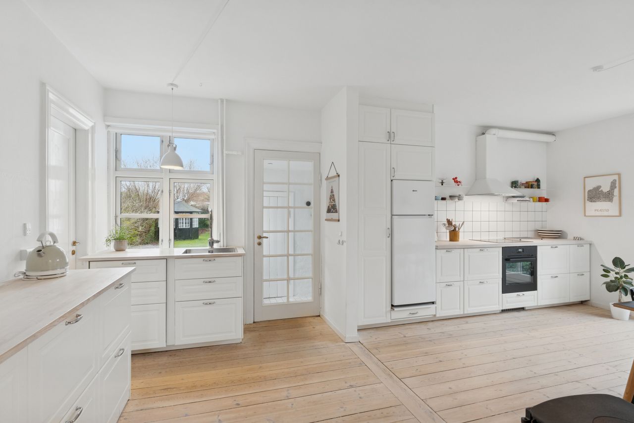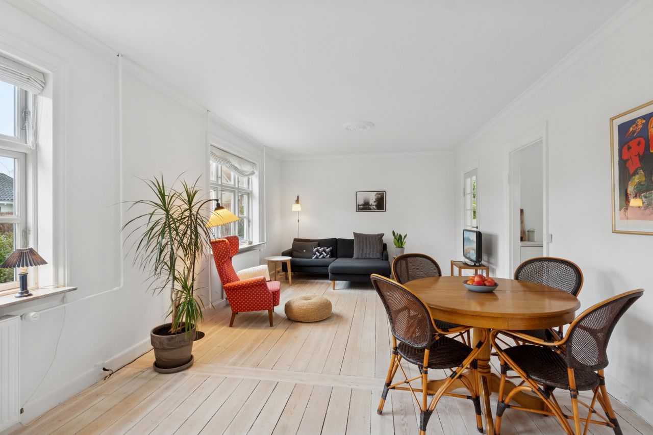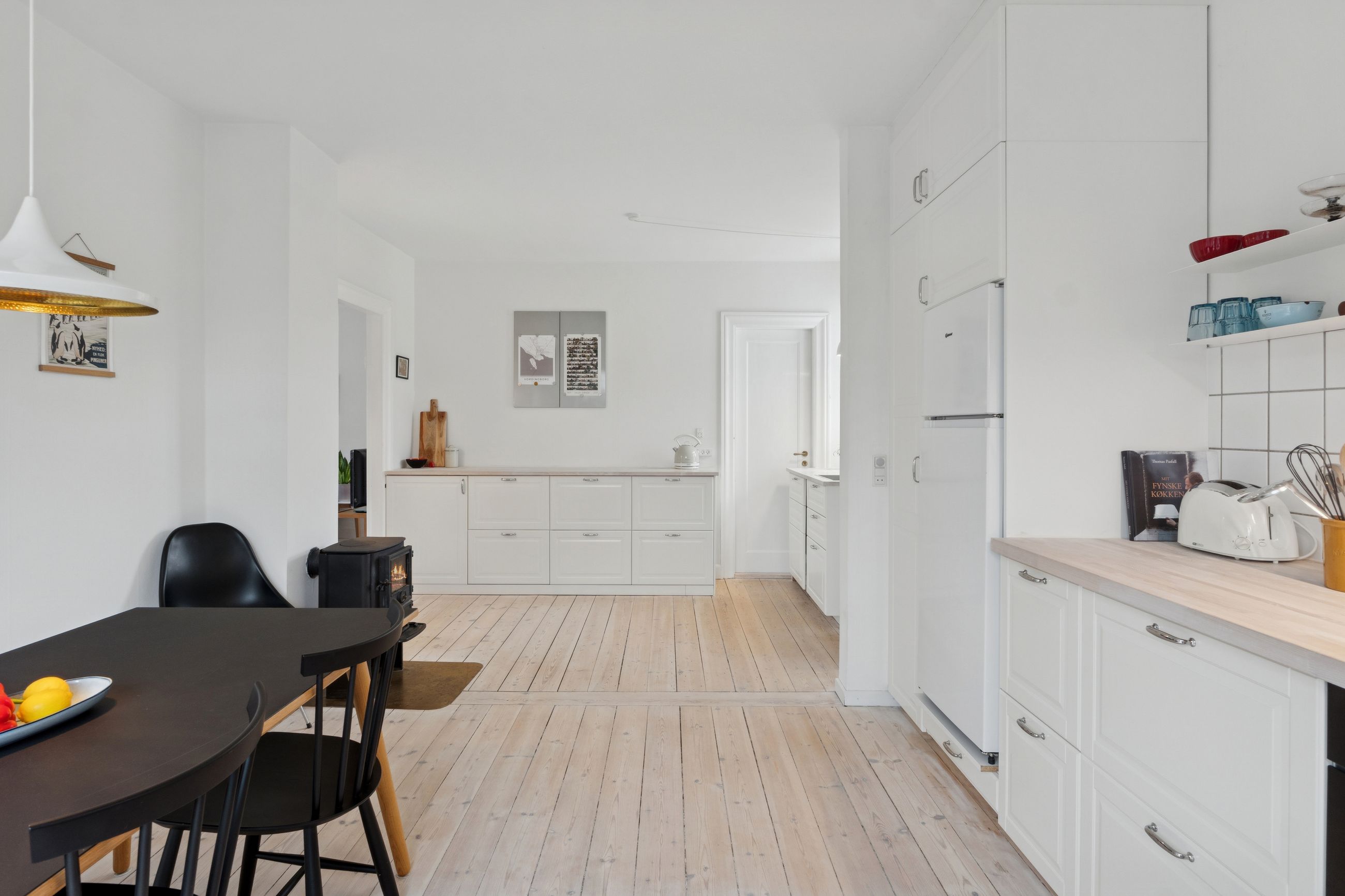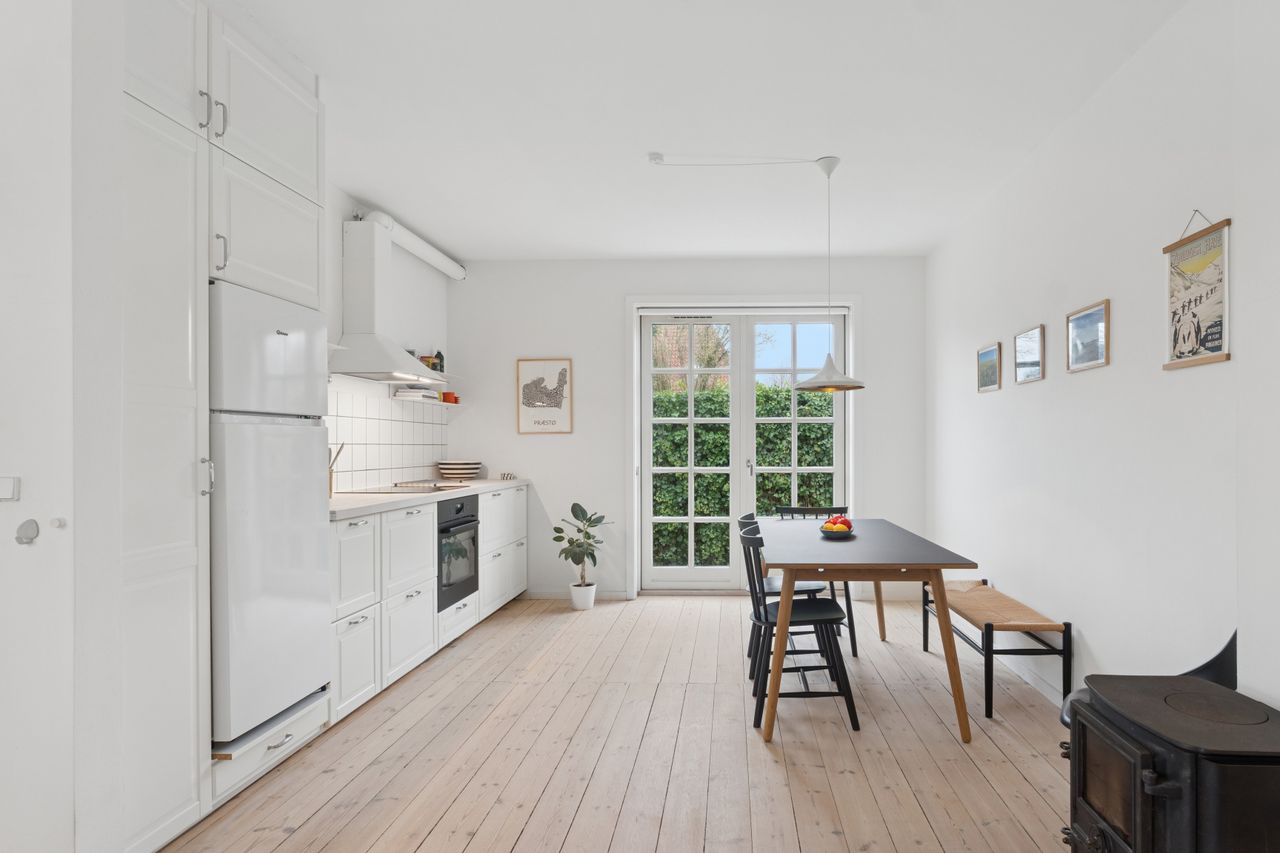 De fantastiske lysindfald er noget, I straks får øje på, når I kommer til denne tiltalende villa. I den store og markante stue fremhæver dagslyset stukkaturen og loftrosetten sammen med det klassiske plankegulv, som i øvrigt går igen i flere rum. Stuen er istandsat i 2020, og samme år blev køkkenet skiftet. Køkkenet fremtræder nydeligt med hvide fyldningsfronter, der skaber en flot stil til hjemmet, og der er adgang til et viktualierum. De sprossede dobbeltdøre åbner til terrassen.