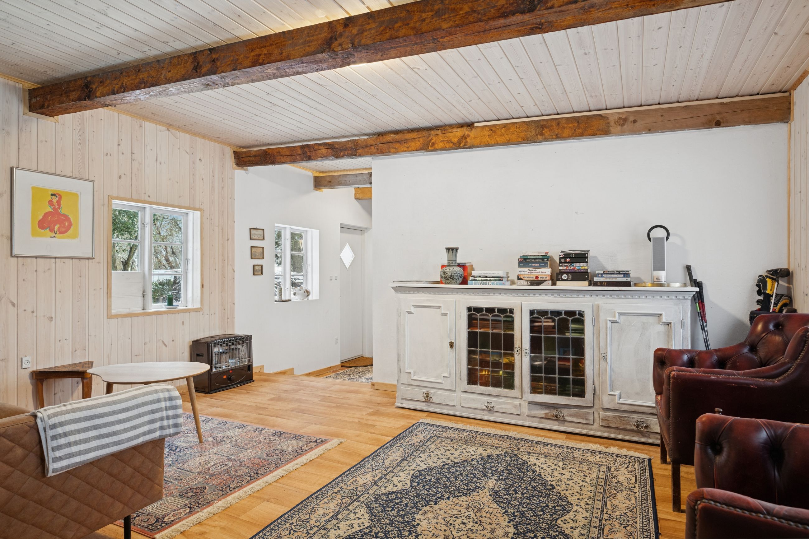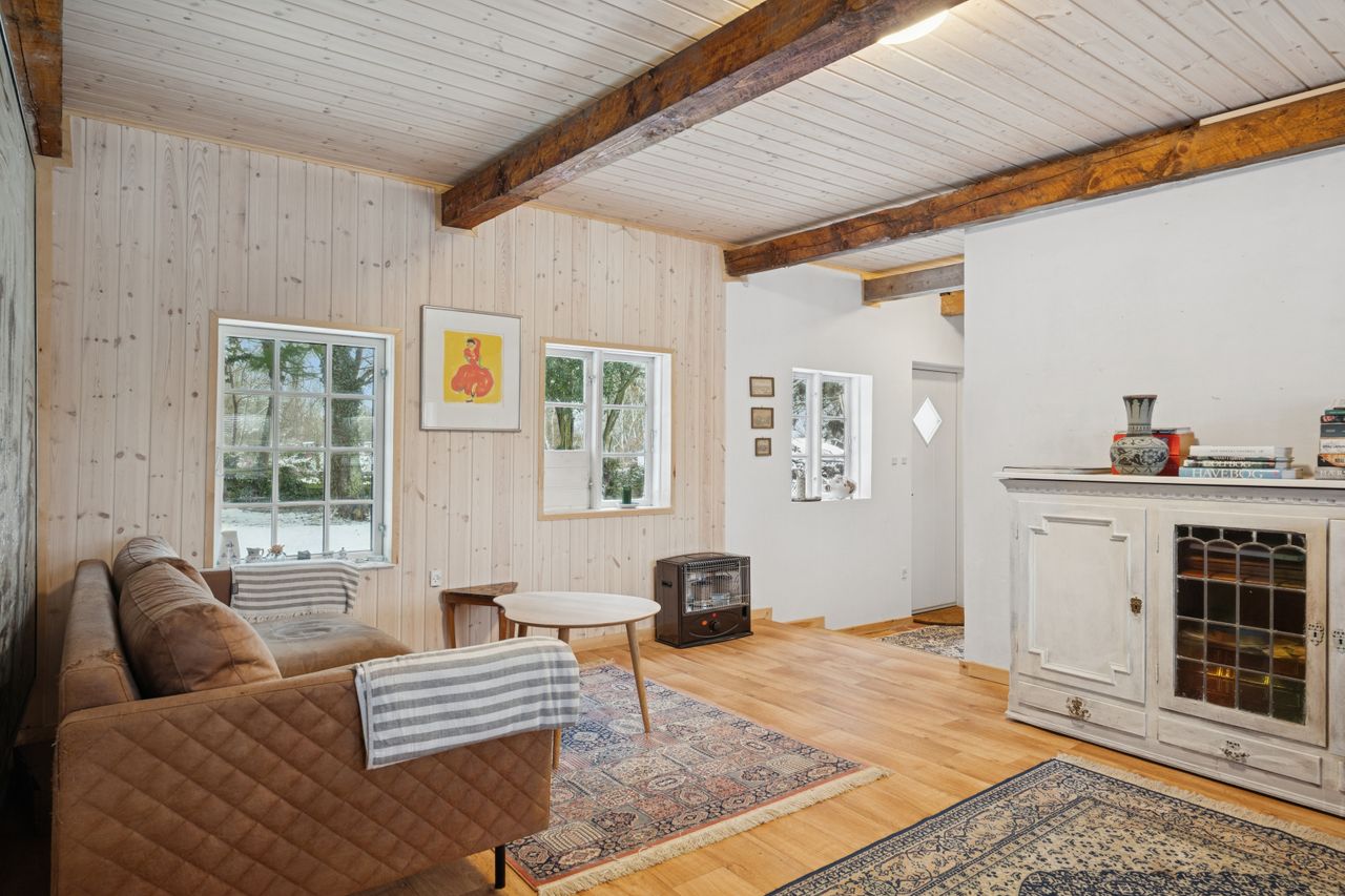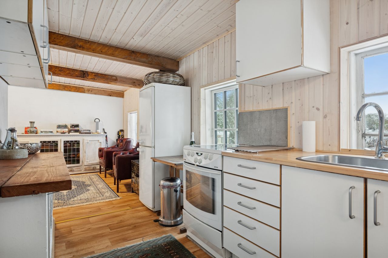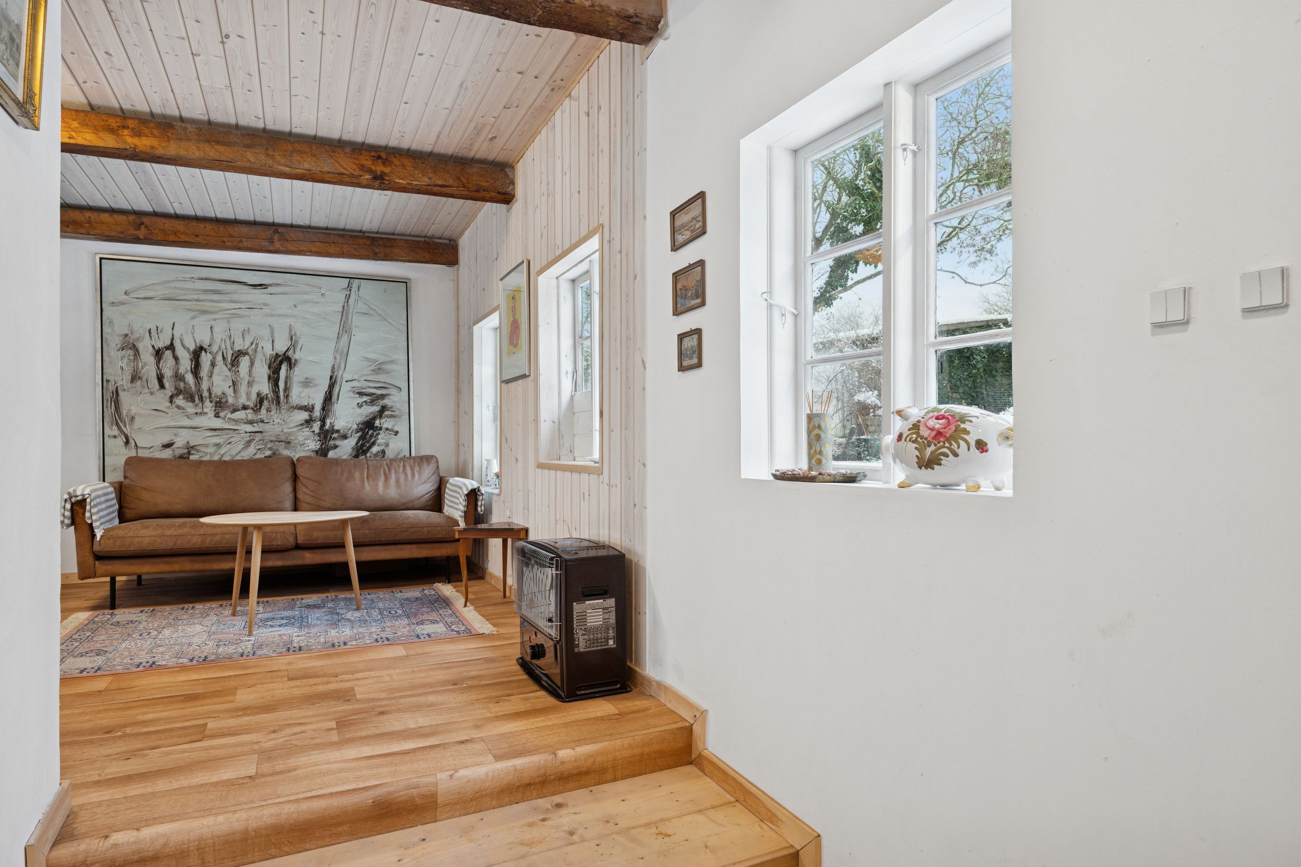 Inden døre er huset centreret omkring køkken-alrummet, der udgør det primære opholdsrum. Køkkenet er funktionelt indrettet, og den åbne forbindelse til stuen forstærker både lysindfaldet og rumfornemmelsen, mens blotlagte loftsbjælker bidrager til den stemningsfulde atmosfære.