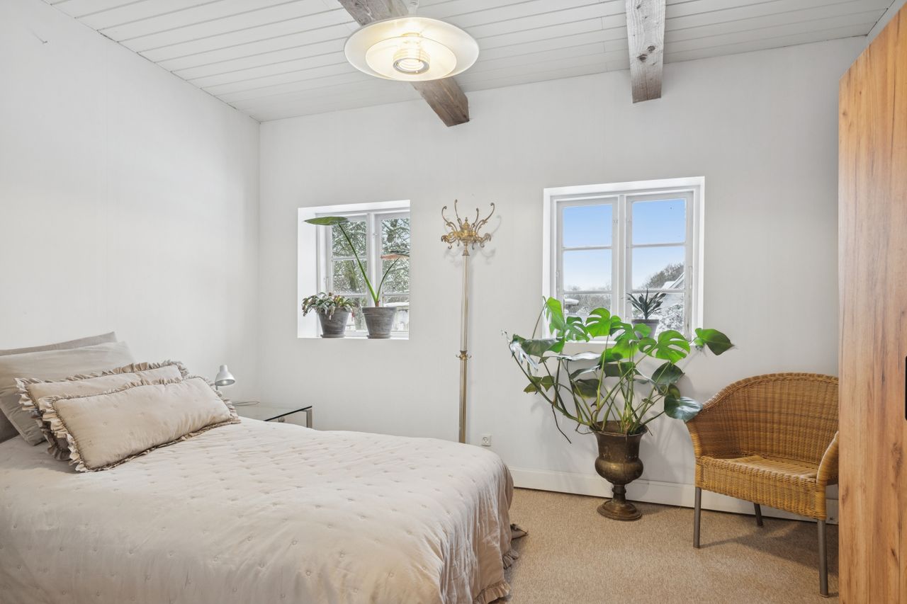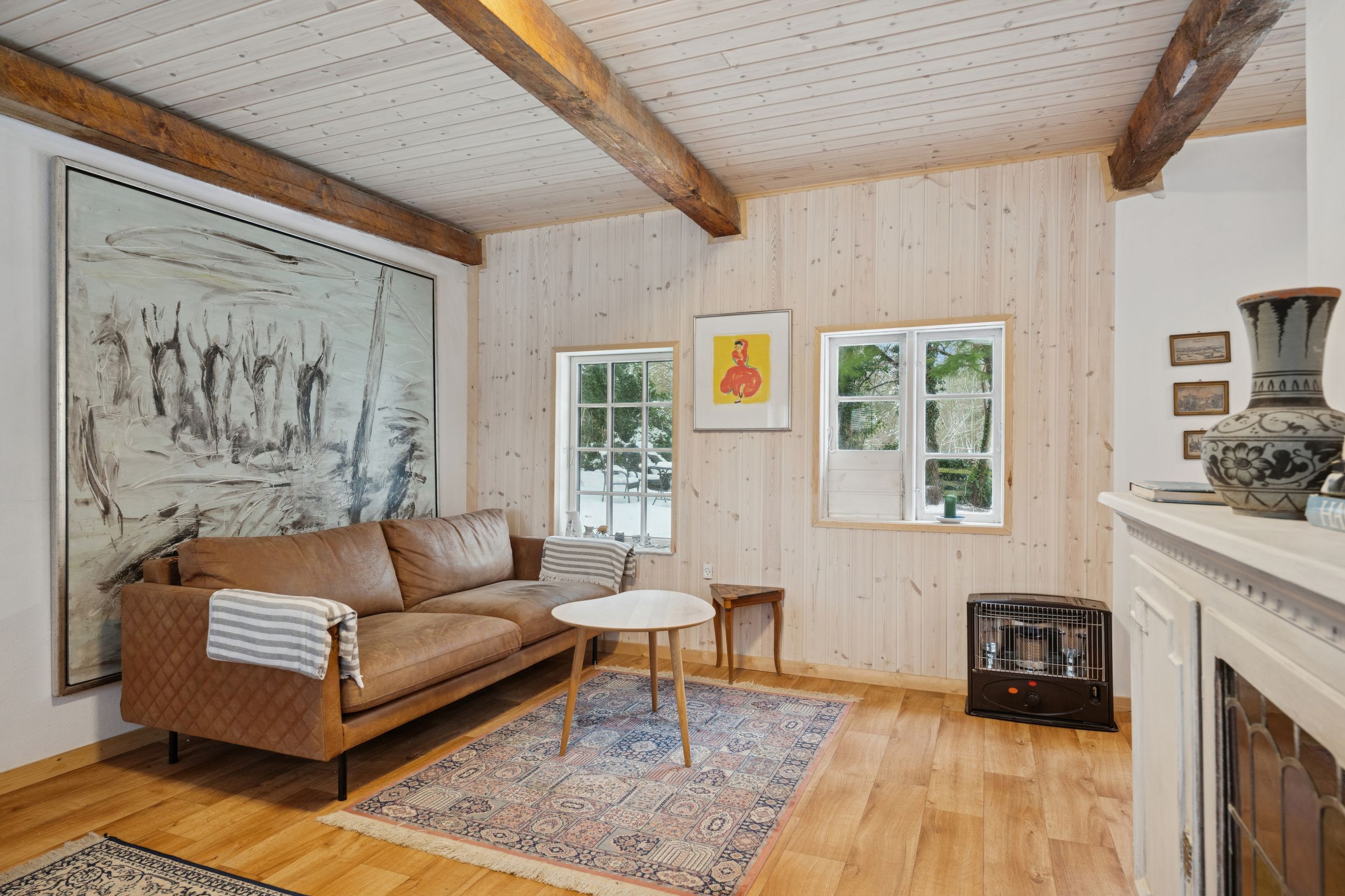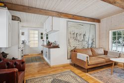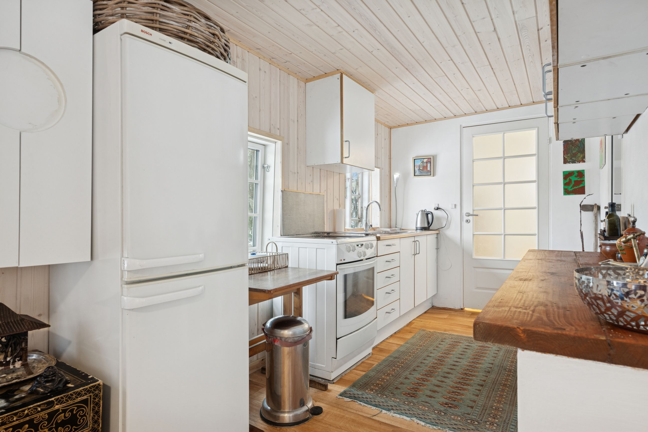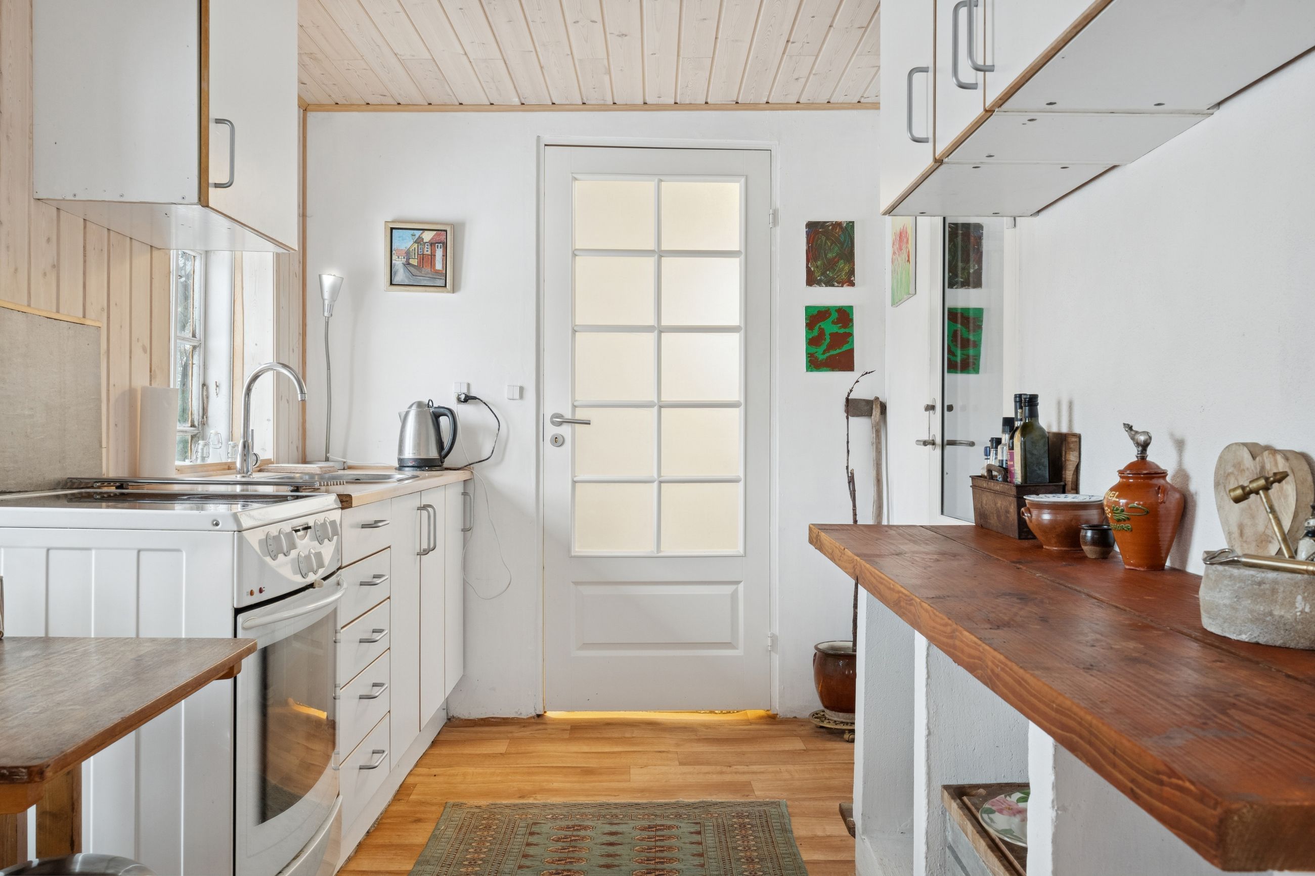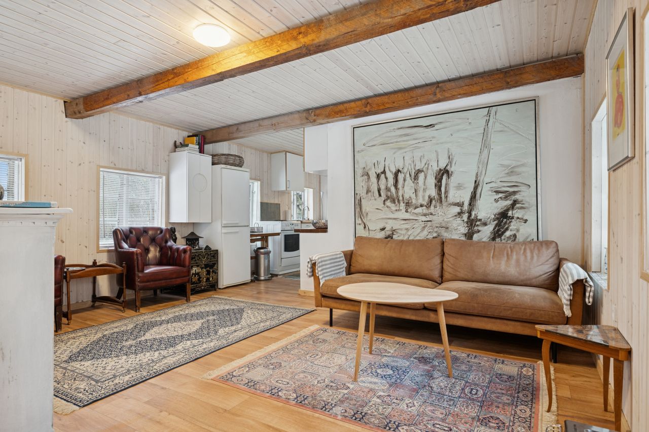 Inden døre er huset centreret omkring køkken-alrummet, der udgør det primære opholdsrum. Køkkenet er funktionelt indrettet, og den åbne forbindelse til stuen forstærker både lysindfaldet og rumfornemmelsen, mens blotlagte loftsbjælker bidrager til den stemningsfulde atmosfære.