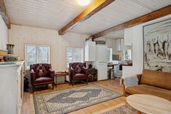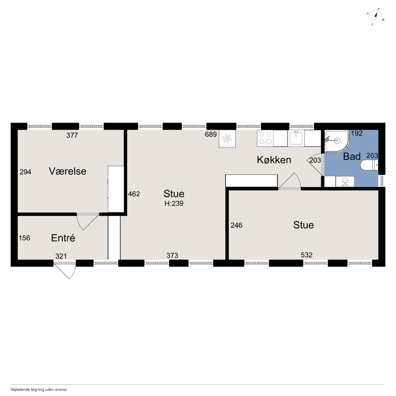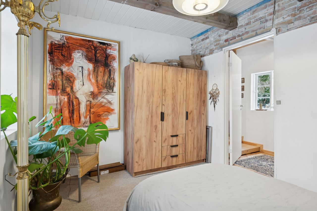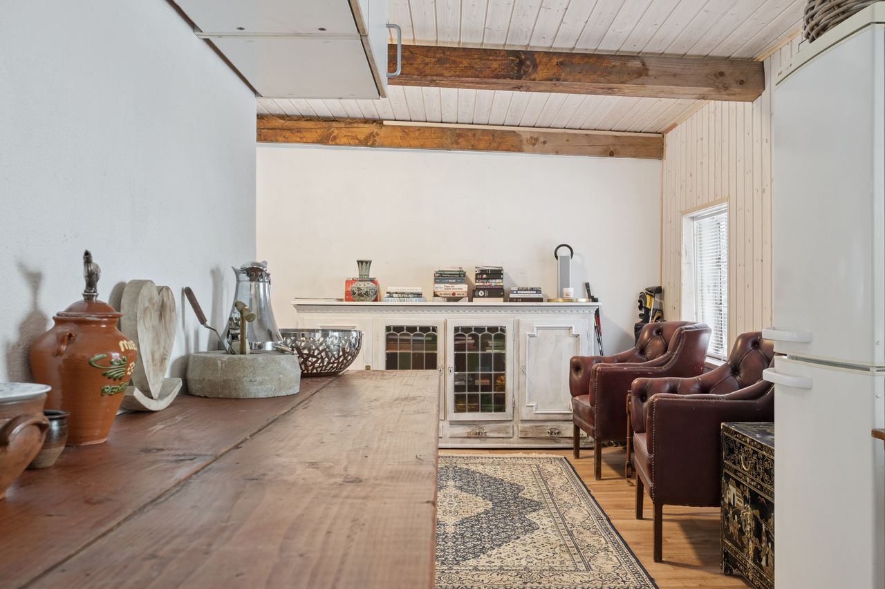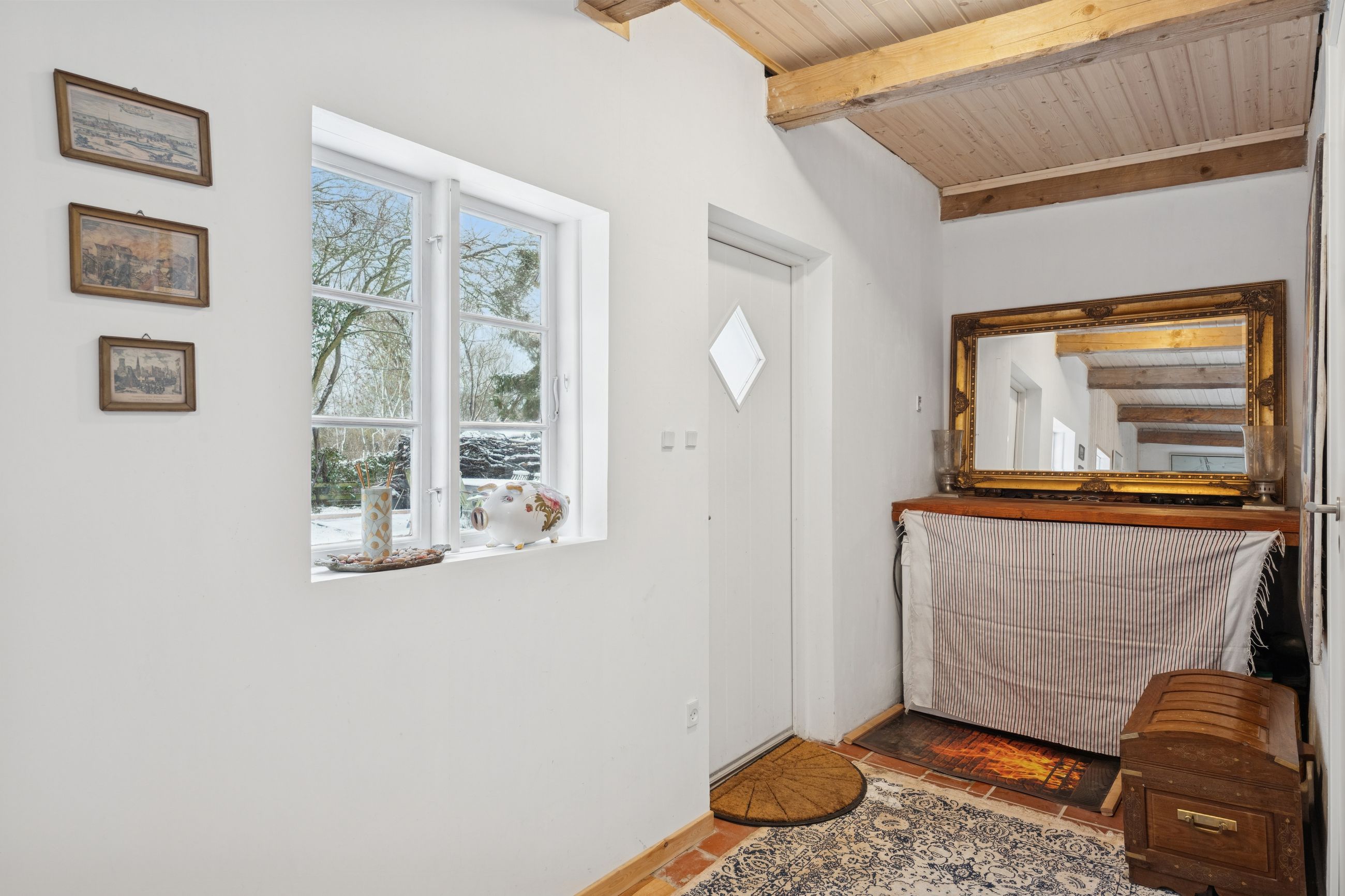 Inden døre er huset centreret omkring køkken-alrummet, der udgør det primære opholdsrum. Køkkenet er funktionelt indrettet, og den åbne forbindelse til stuen forstærker både lysindfaldet og rumfornemmelsen, mens blotlagte loftsbjælker bidrager til den stemningsfulde atmosfære.
