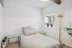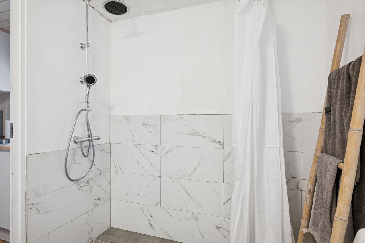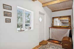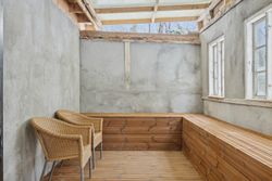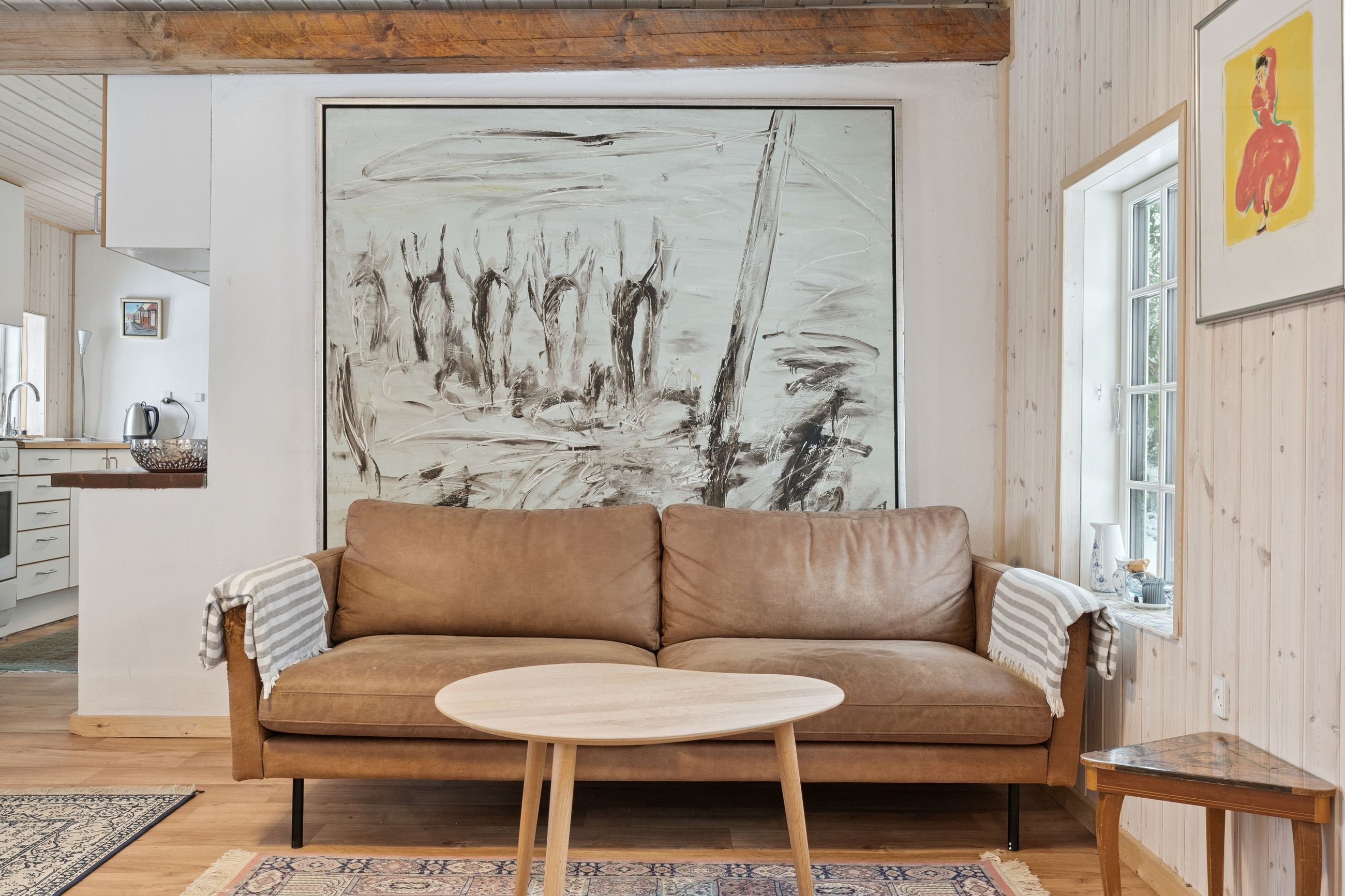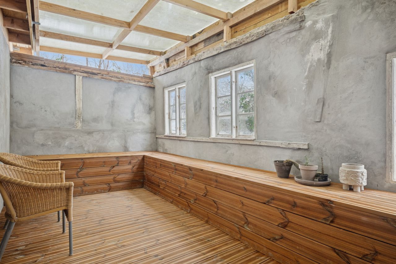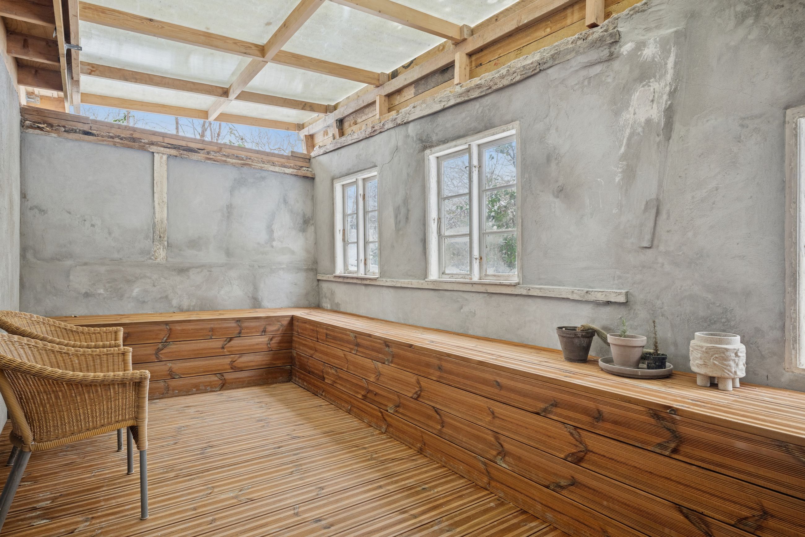 Fra køkken-alrummet er der adgang til de øvrige rum i huset, heriblandt en slags "udestue" med en integreret bænk, hvor du kan indrette endnu et hyggeligt opholdssted. Der er også et pænt badeværelse og et regulært soveværelse.