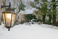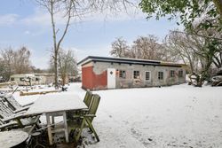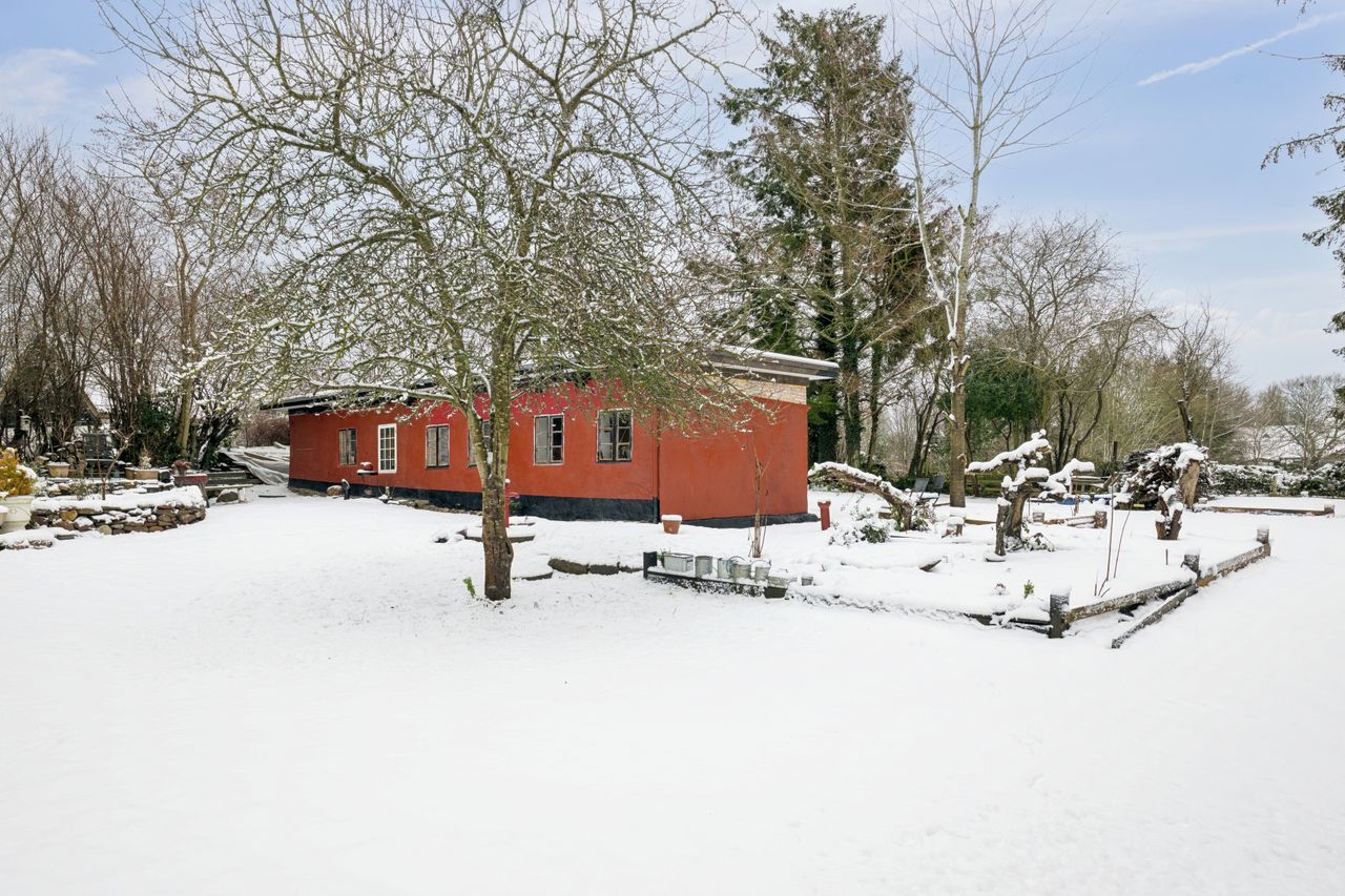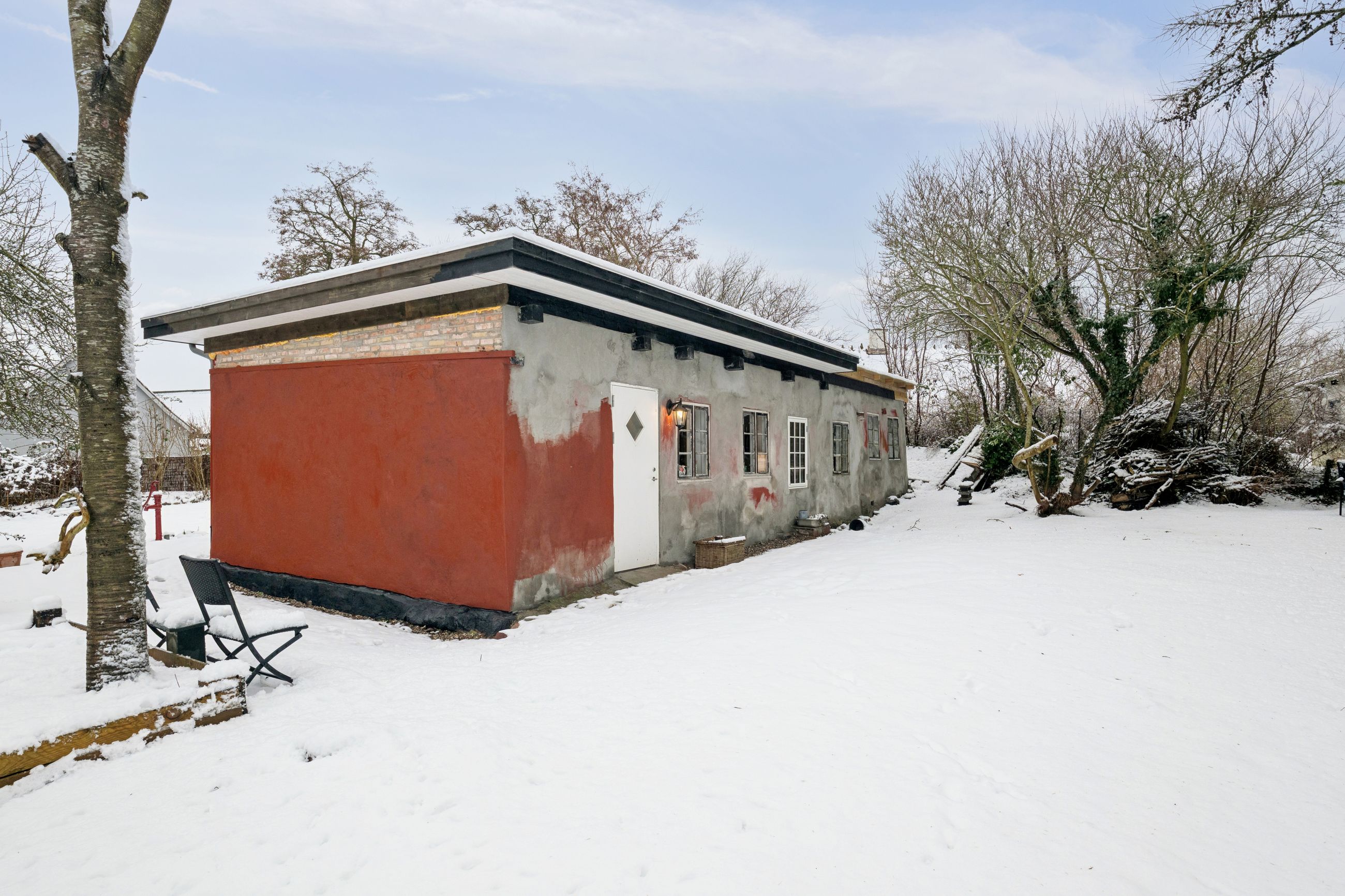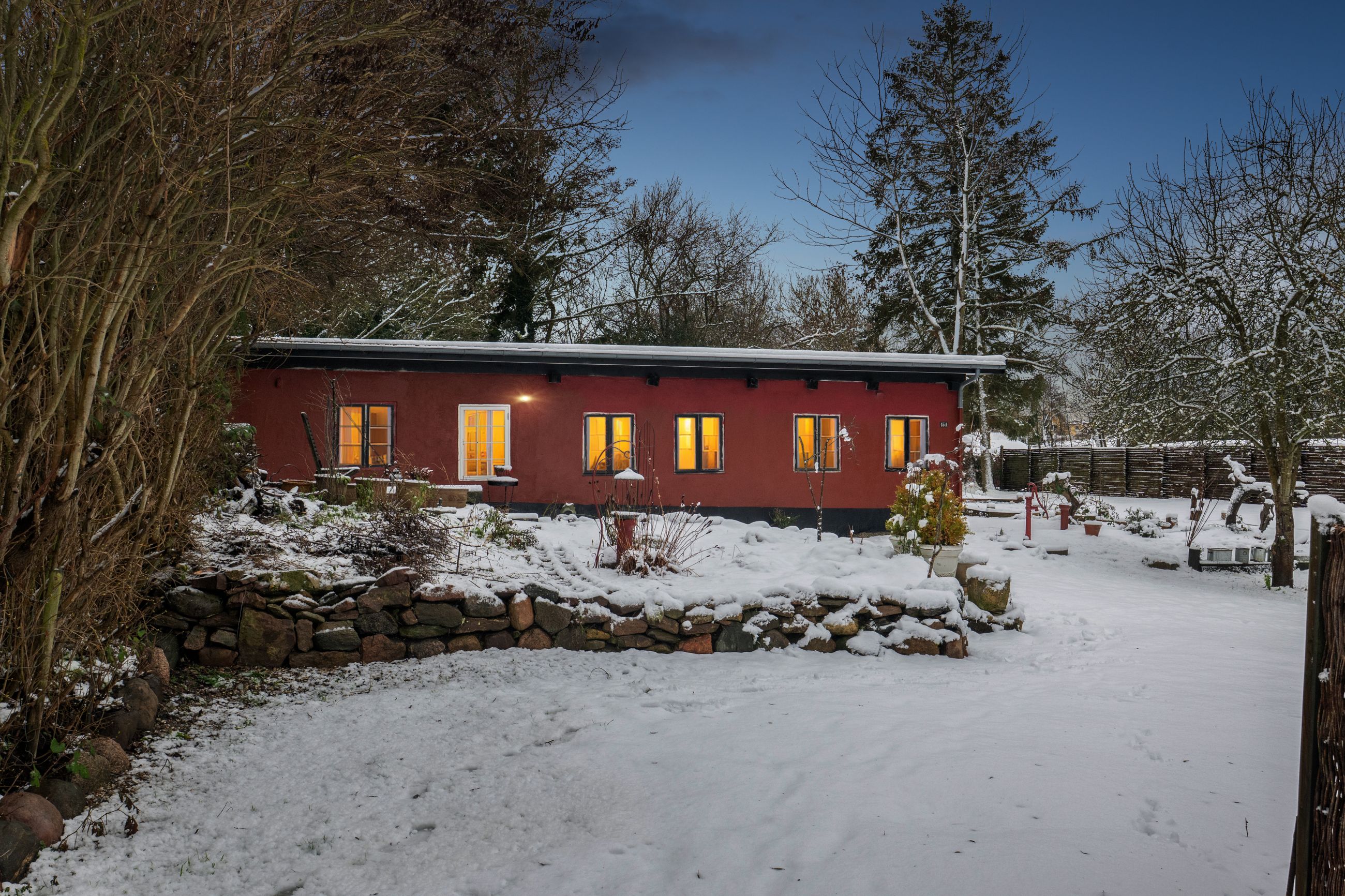 Huset præsenterer sig med en karakteristisk rød facade og en lav tagprofil. Haven omkranser huset på alle sider og byder på en frodig variation af græsarealer, høje træer og bede indrammet af stensætninger. En fritliggende fliseterrasse fungerer som et privat helle, hvor du kan nyde solen og udsigten over haven, der bærer præg af mange års naturlig vækst i en velordnet ramme.