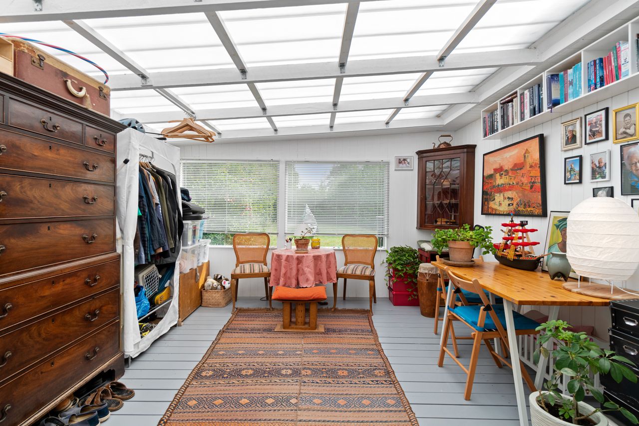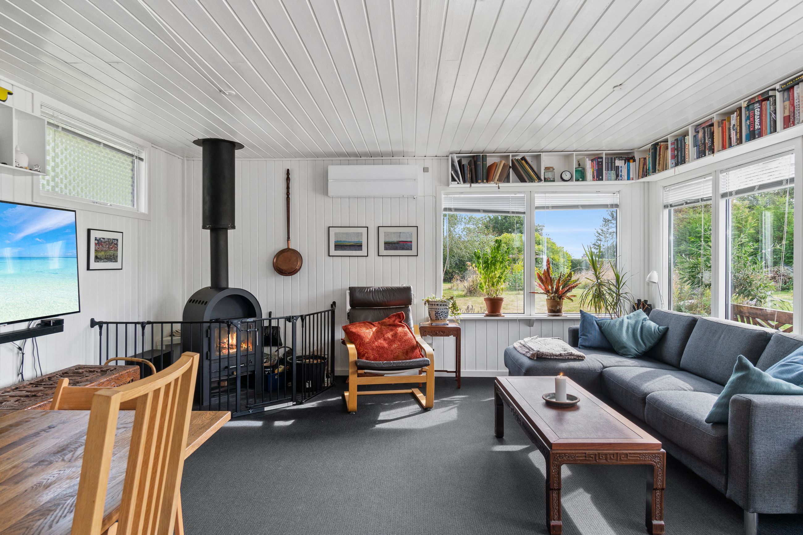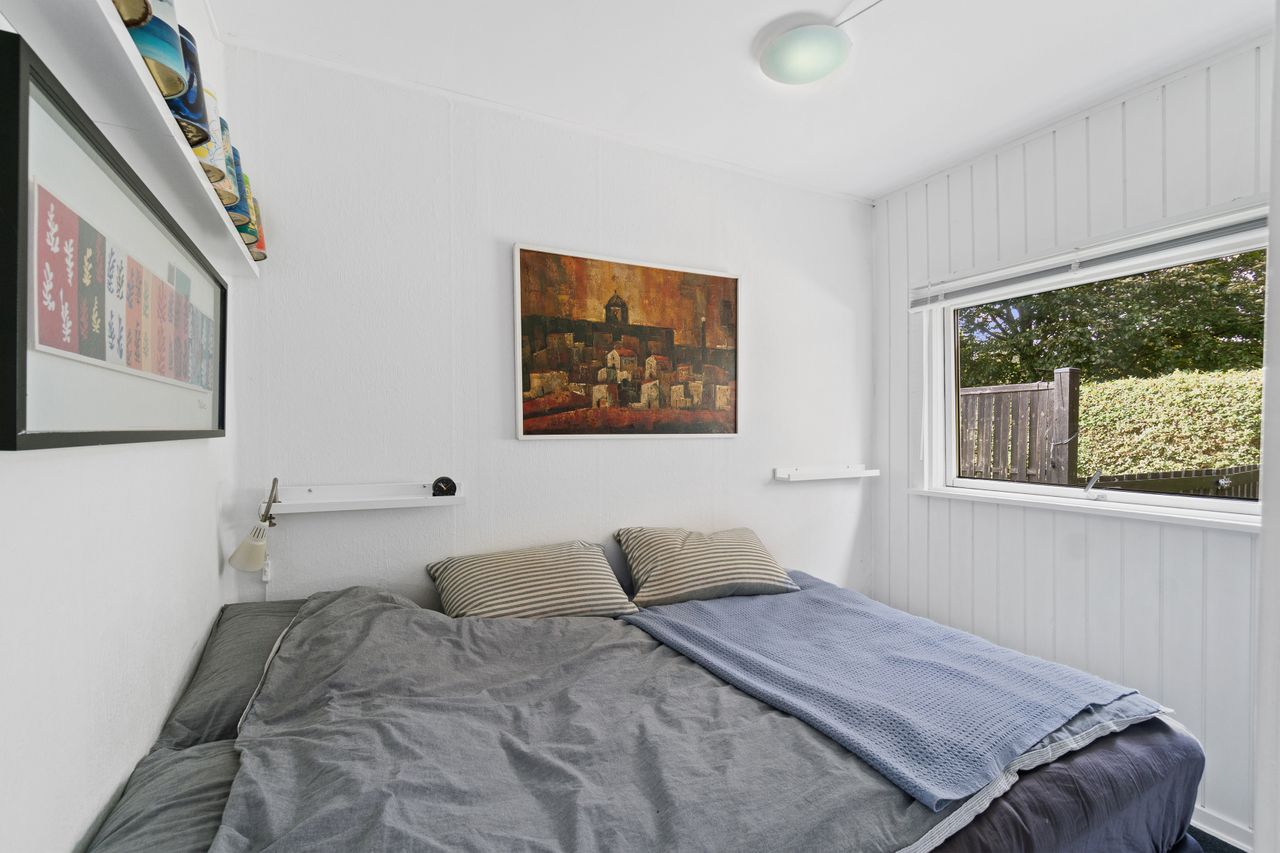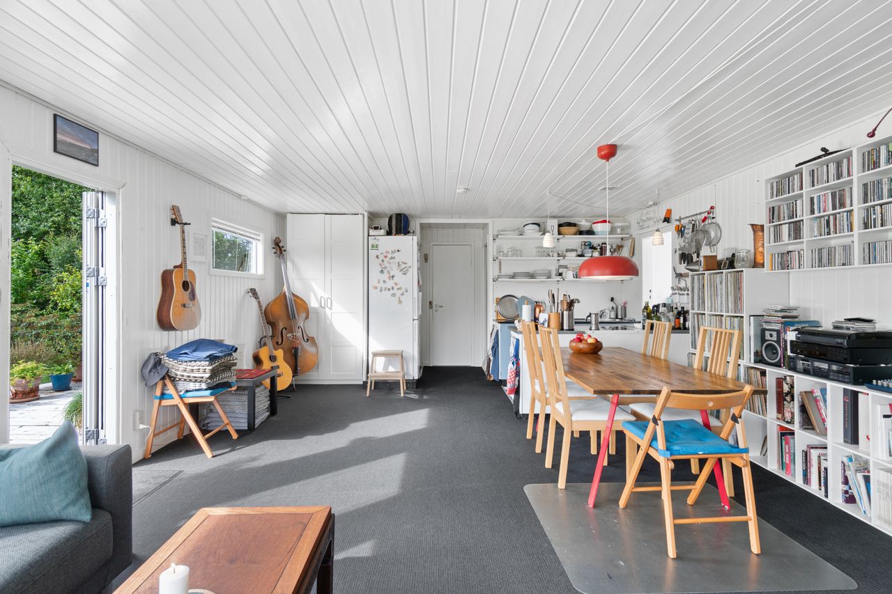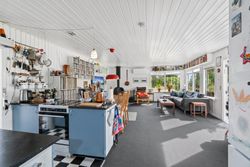 Den klassiske sommerhusstemning fortsætter indenfor, og i det store alrum kan I glæde jer til indendørshygge ved brændeovnen. Der er god plads til både sofasektionen og spiseafdelingen, og så er der også fine rammer om madlavningen i køkkenet. Hertil supplerer den overdækkede terrasse/"udestuen", og endelig får I to værelser, et toilet og et bryggers med en brusekabine fra 2021.
