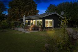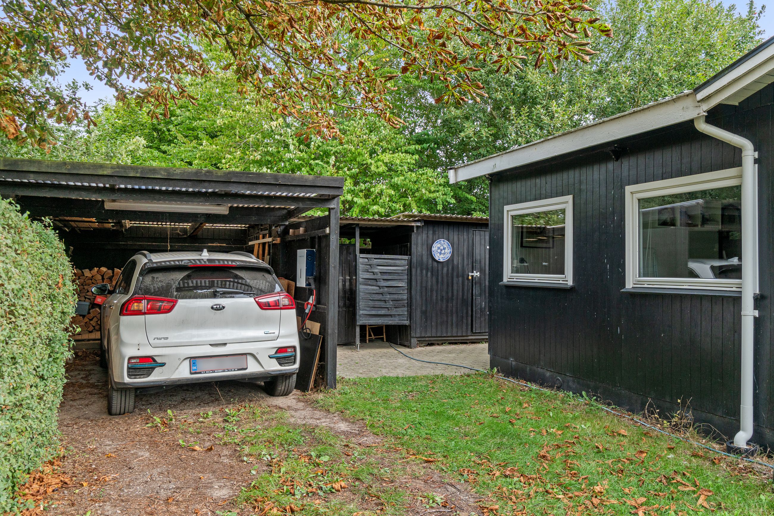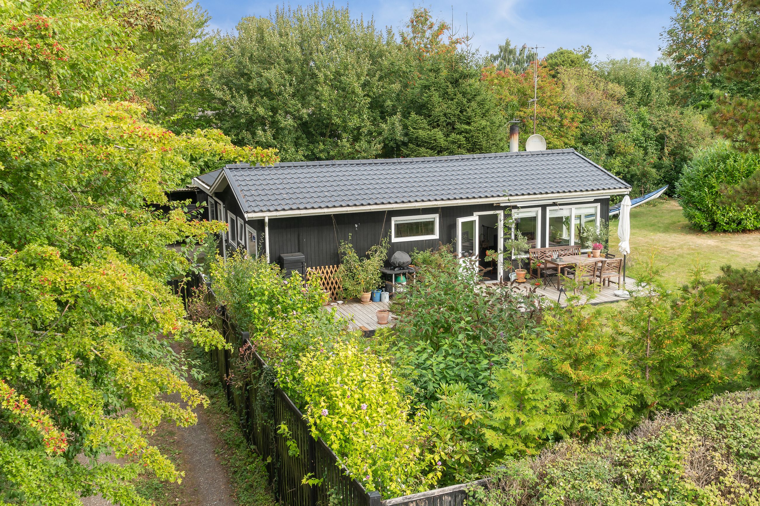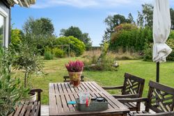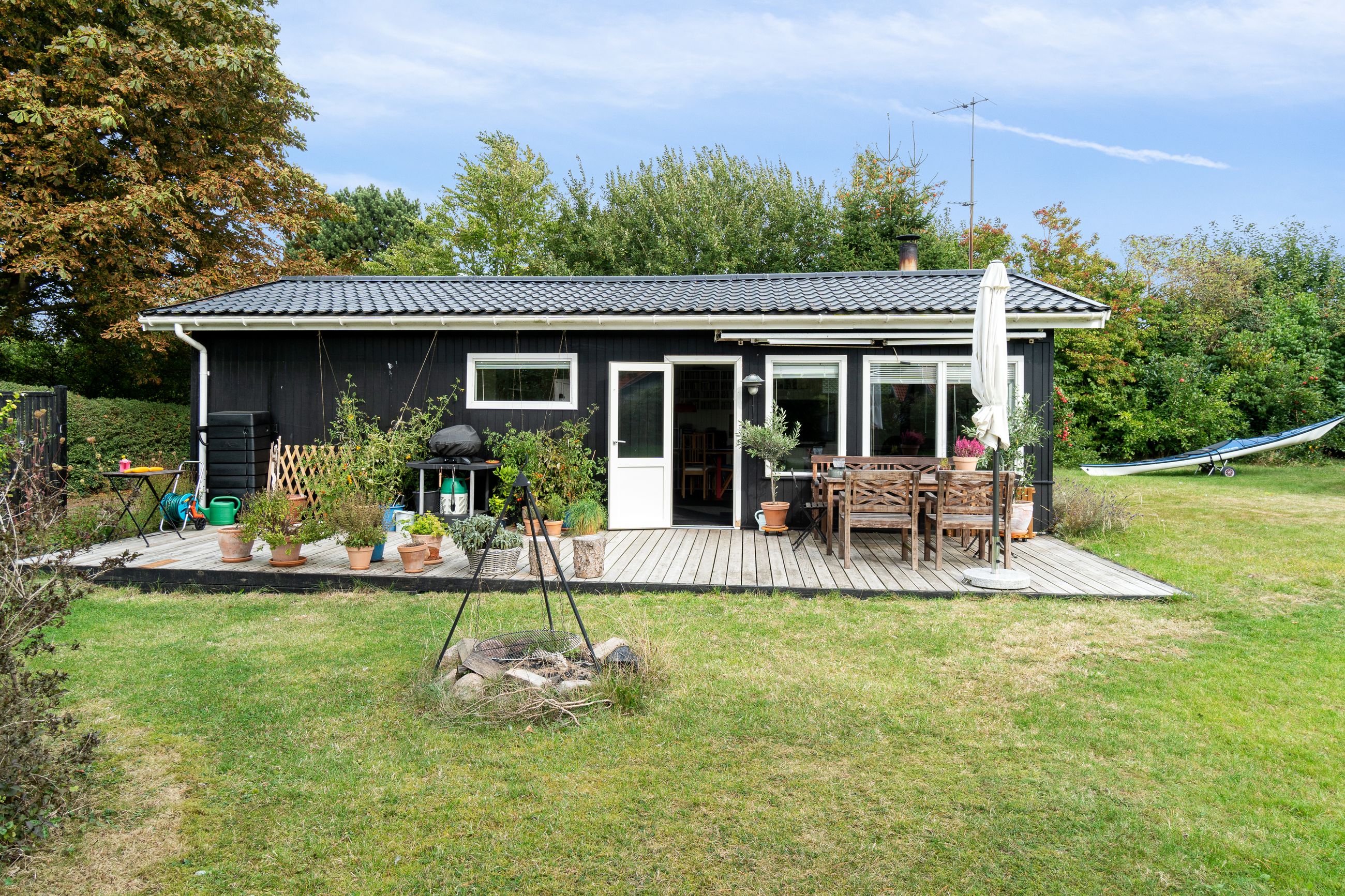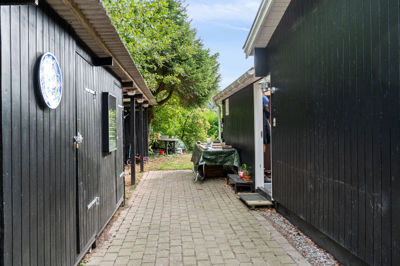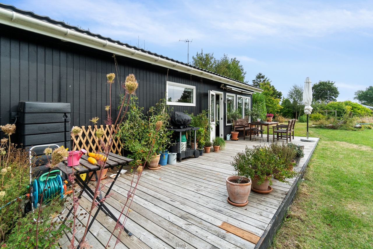 Tilbage på grunden, der tæller 1.246 m2, er der også rig mulighed for at nyde ferien. Haven er pragtfuldt anlagt med varieret beplantning, og de høje, omkransende træer skærmer på fin vis, så I kan sidde ganske uforstyrret på den sydvendte terrasse og slappe af. På grunden er der tillige en carport med to udhuse samt en overdækning med en skøn udendørsbruser.