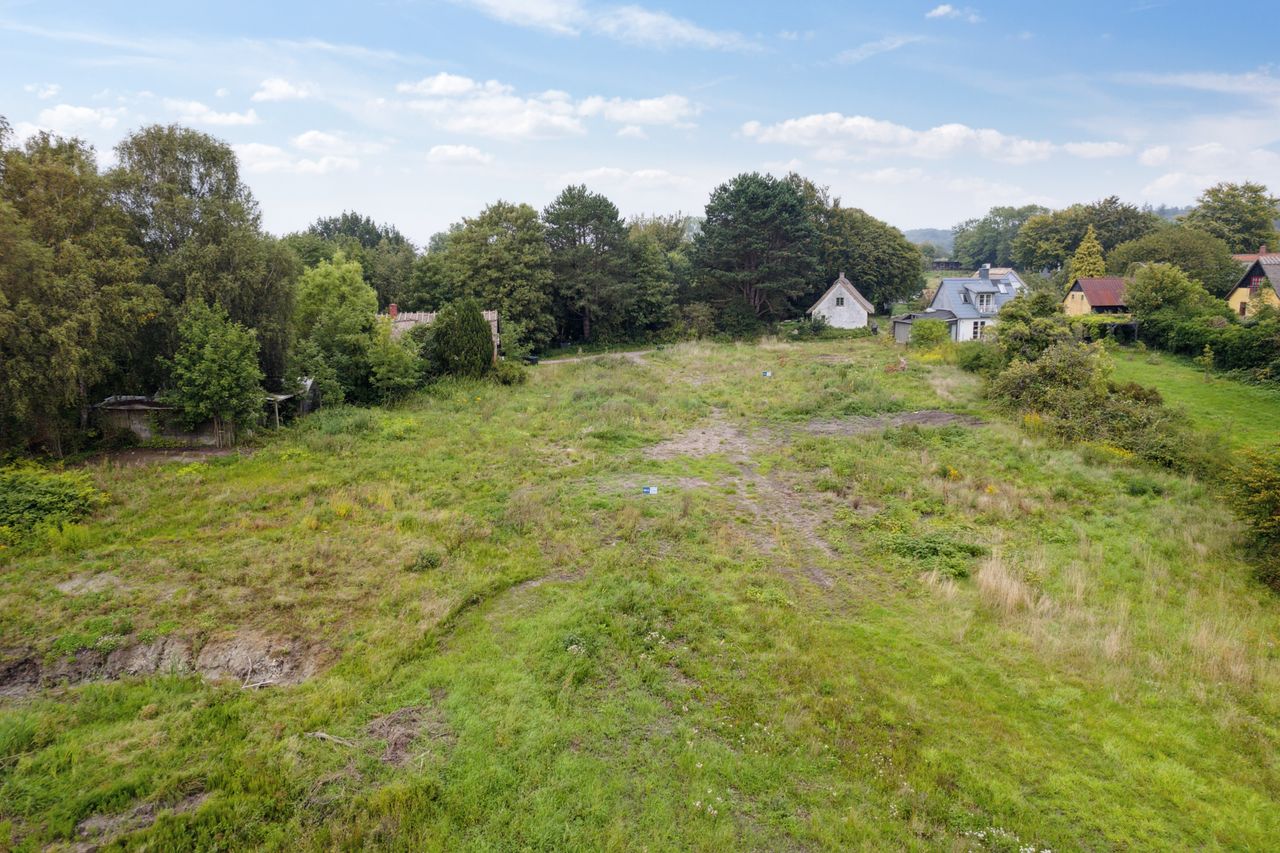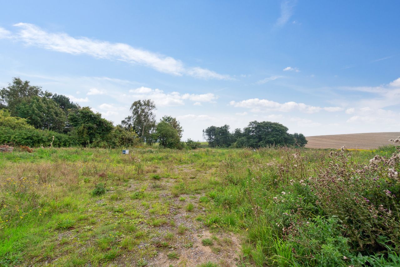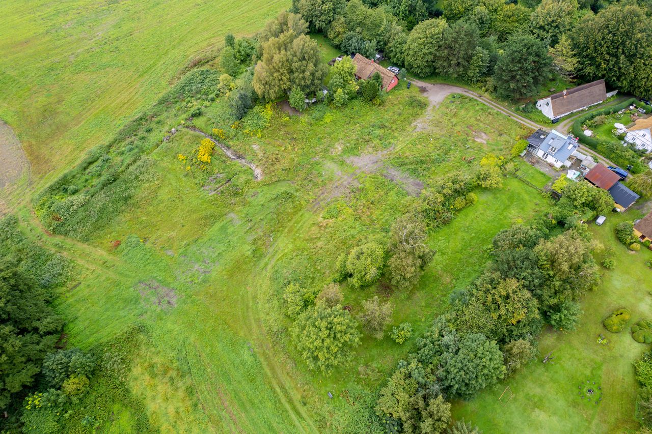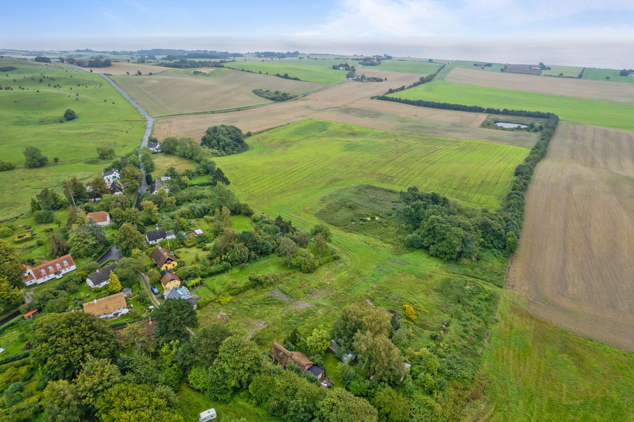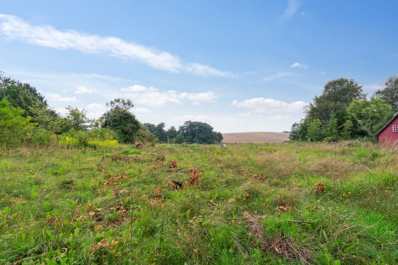 Grunden ligger højt og tilbagetrukket, næsten for enden af en blind stikvej, hvilket sikrer både udsigt og privatliv. Fra grunden er der frit kig ud over det smukke, bølgende landskab, hvor naturen folder sig ud i alle retninger og inviterer til både ro og oplevelser.