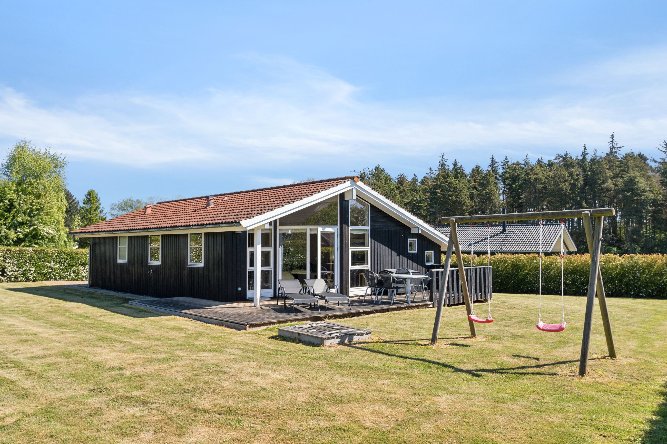 Med sine 72 m2 fremstår huset indbydende med sorte træfacader, klassiske hvide vinduer og rødlige betontagsten –