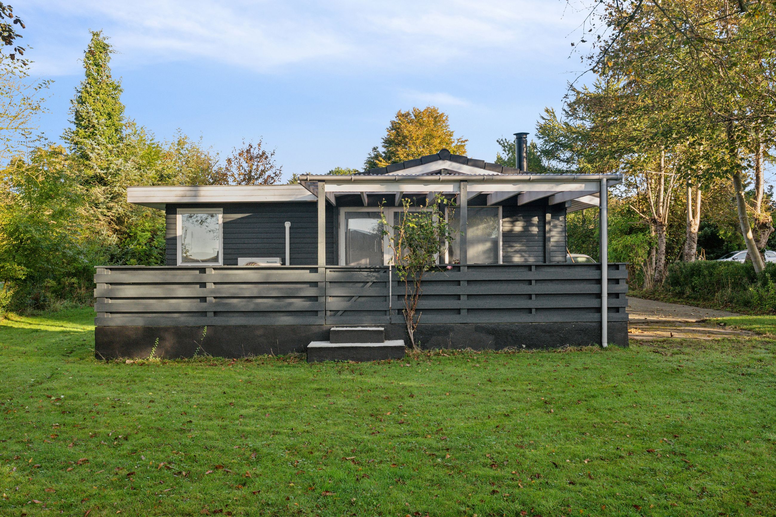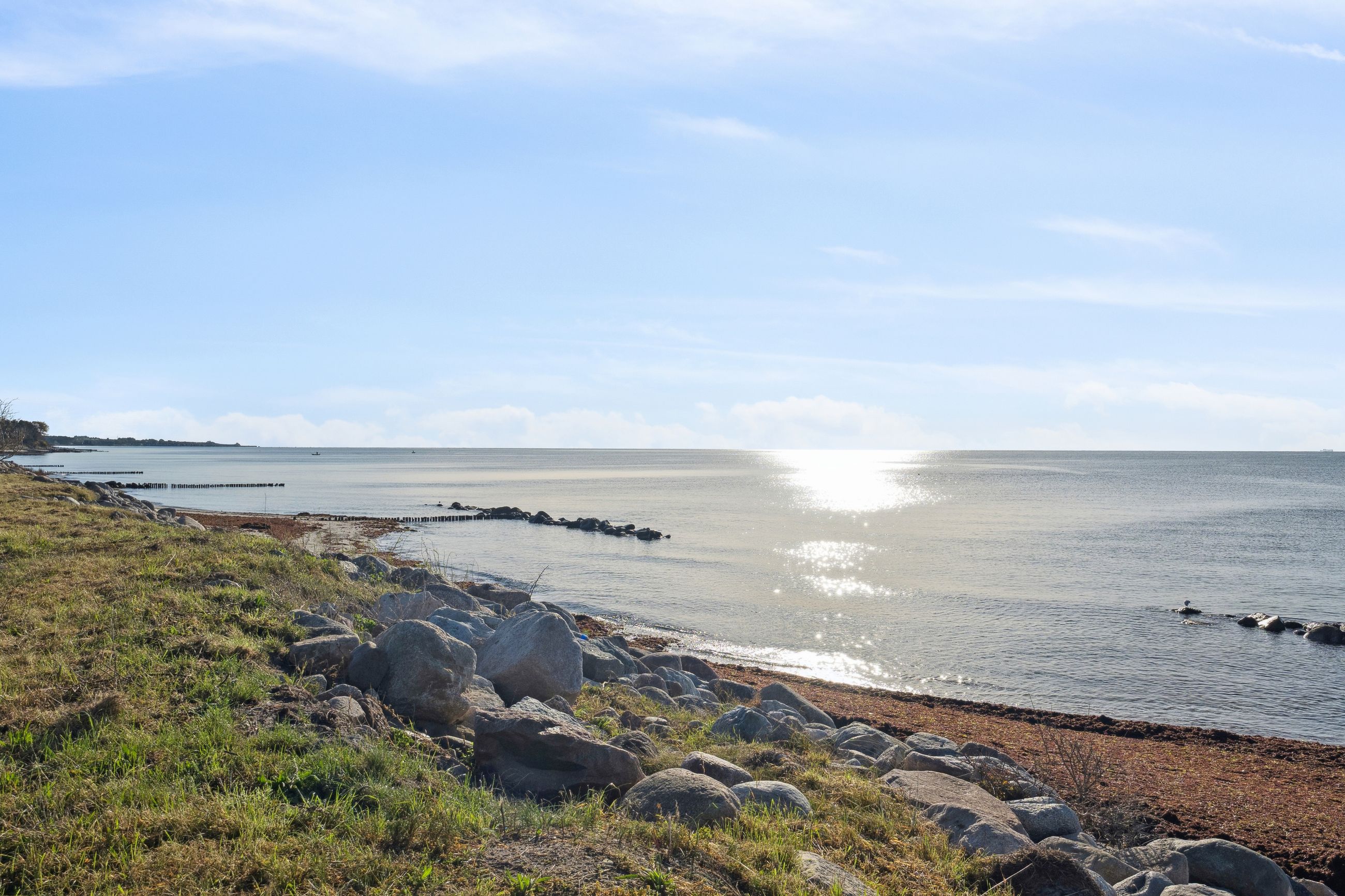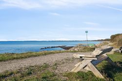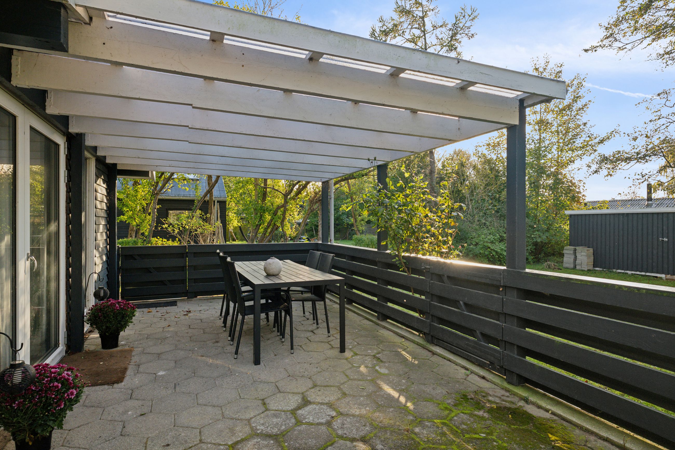 Grunden på 800 m2 er en fredelig, grøn oase med solrige terrasser og plads til leg, grillmiddage og ikke mindst spontane dukkerter i havet – kun få skridt væk.