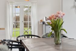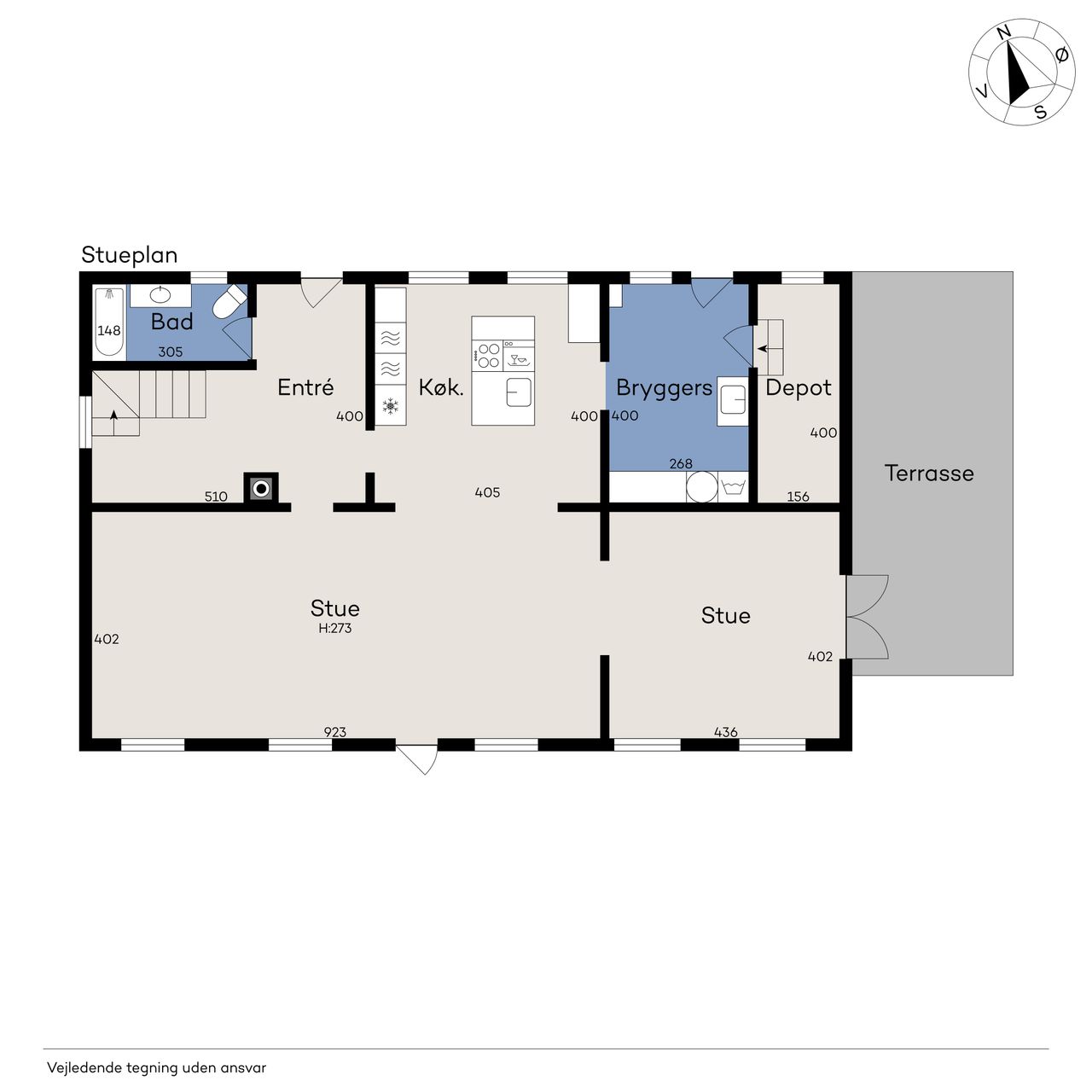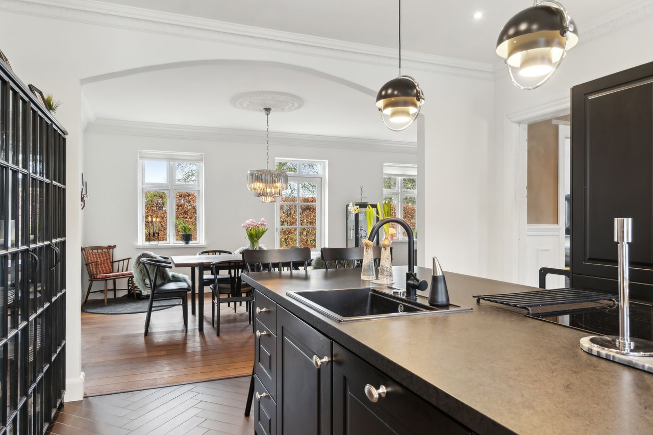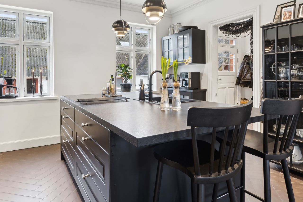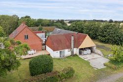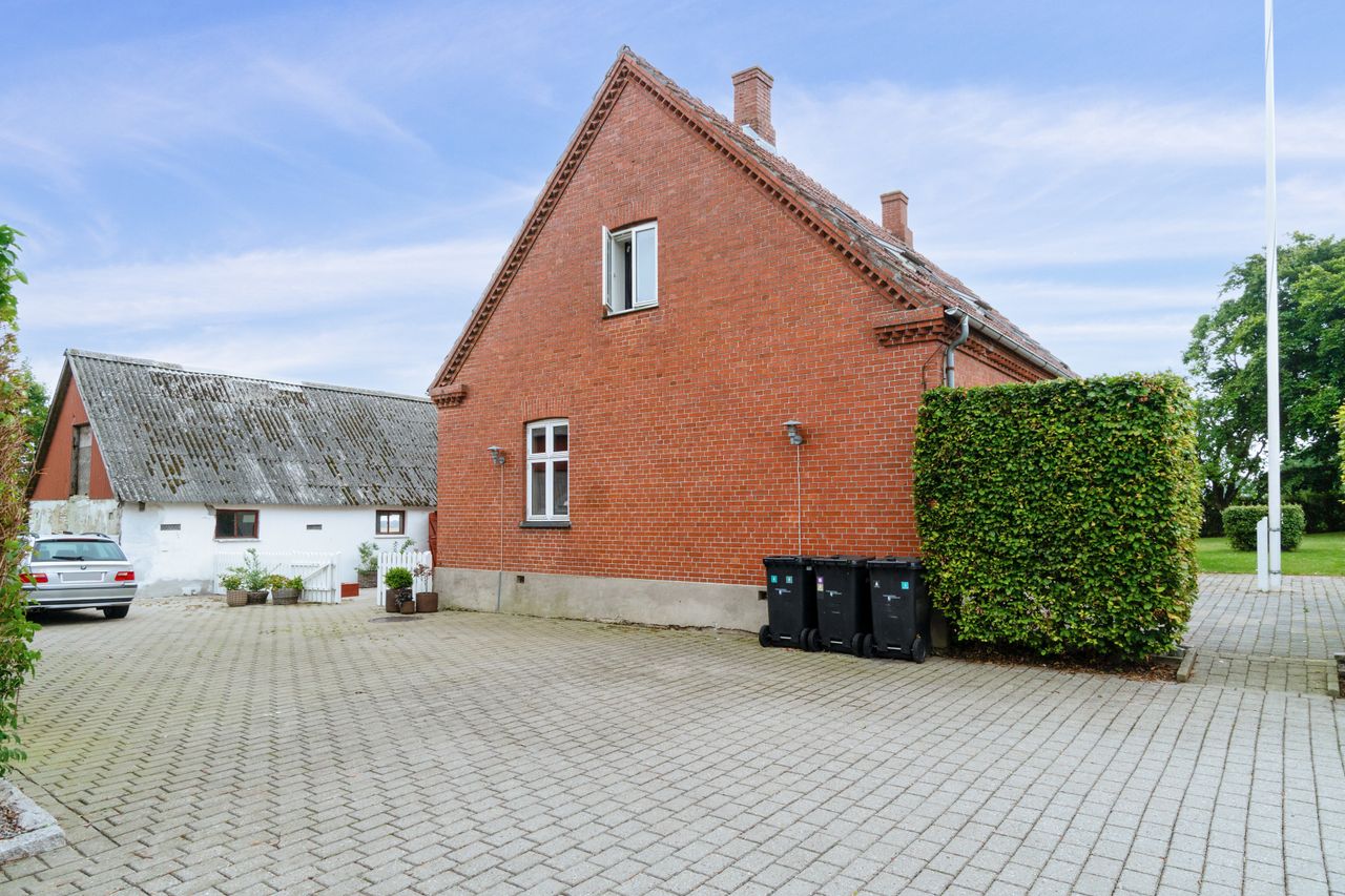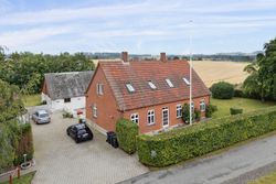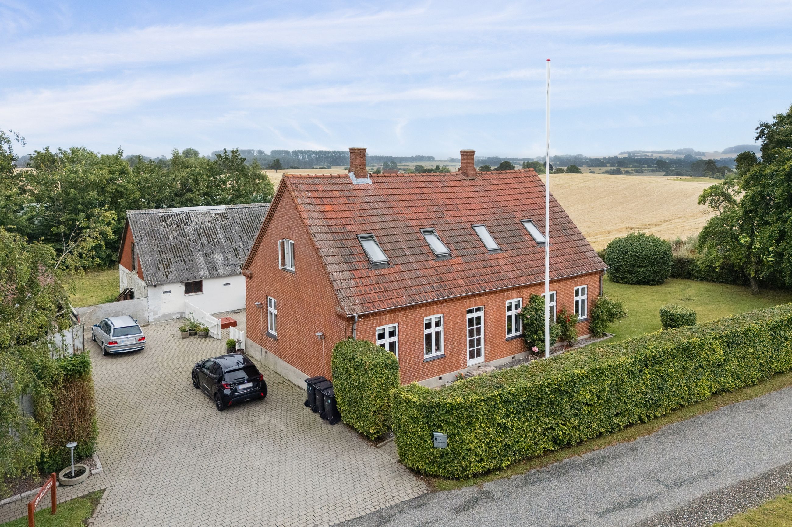 Stuehuset er opført i 1924 i røde mursten og fremstår med tegltag, termo- og energivinduer. Ejendommen ligger uforstyrret og fredfyldt med en fantastisk udsigt over marker og natur. Det flotte stuehus er løbende renoveret og fremstår indbydende med smukke detaljer og moderne komfort. Boligen opvarmes med et kombineret pille- og kornfyr, som sikrer en effektiv og økonomisk varmeløsning. Den rummelige entré byder velkommen med stil, mens det store samtalekøkken med gulvvarme indbyder til hyggelige stunder i åben forbindelse med den højloftede stue. Her finder du elegante stuklofter, skibsparket og gulvvarme, der skaber en varm og indbydende atmosfære.