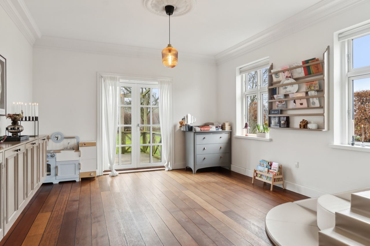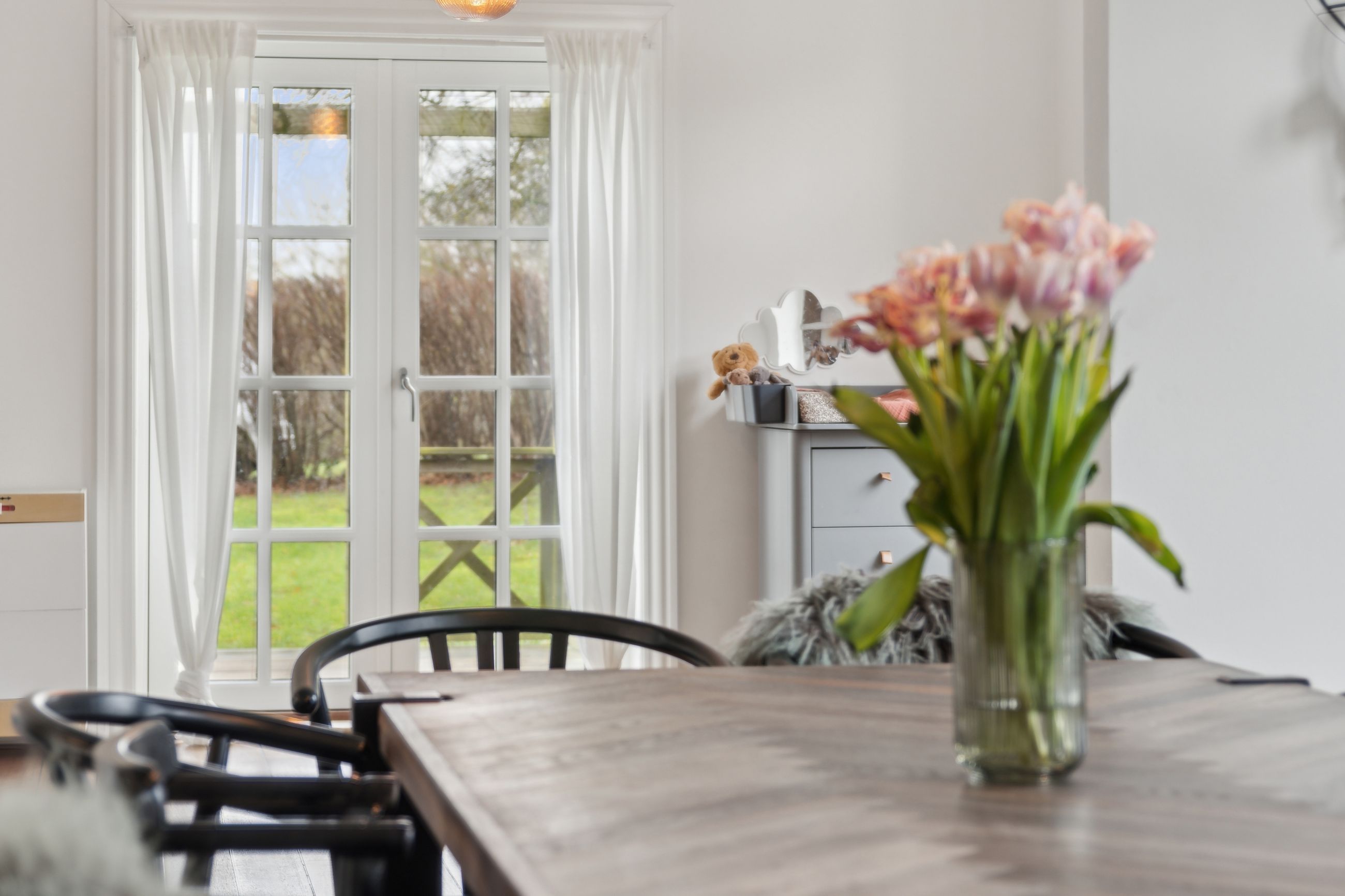 Fra den østvendte stue kan du nyde en pragtfuld udsigt og træde direkte ud på morgenterrassen – det perfekte sted at starte dagen med en kop kaffe i solopgangen.