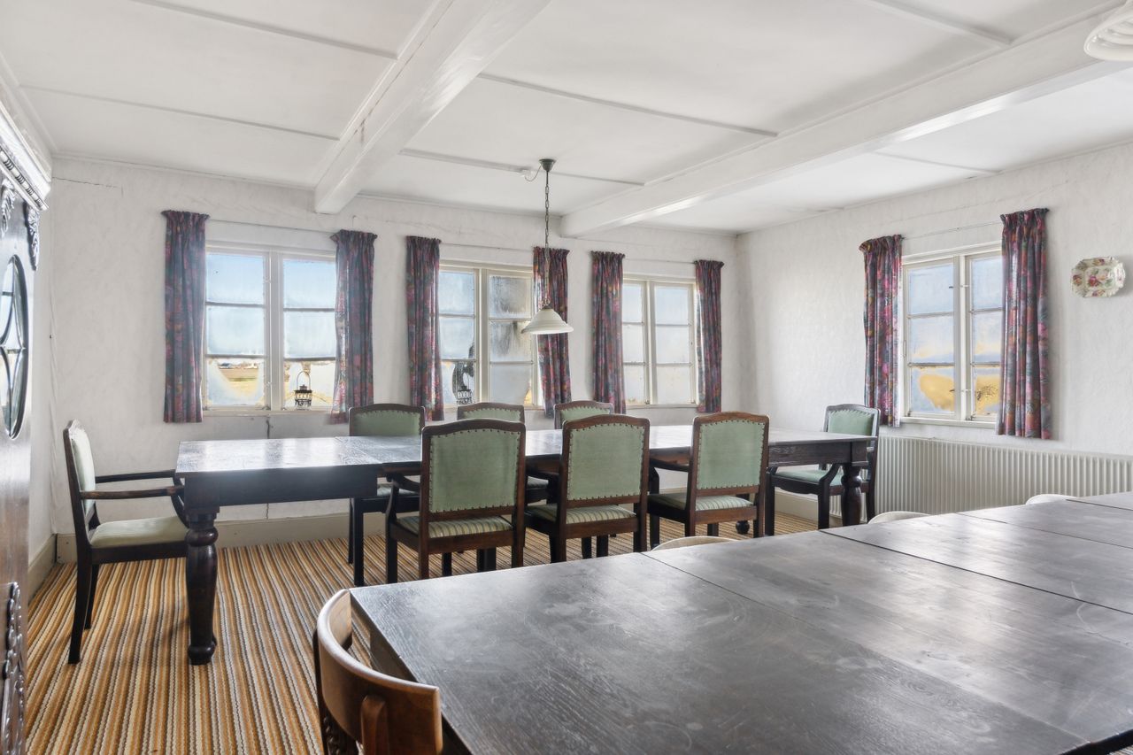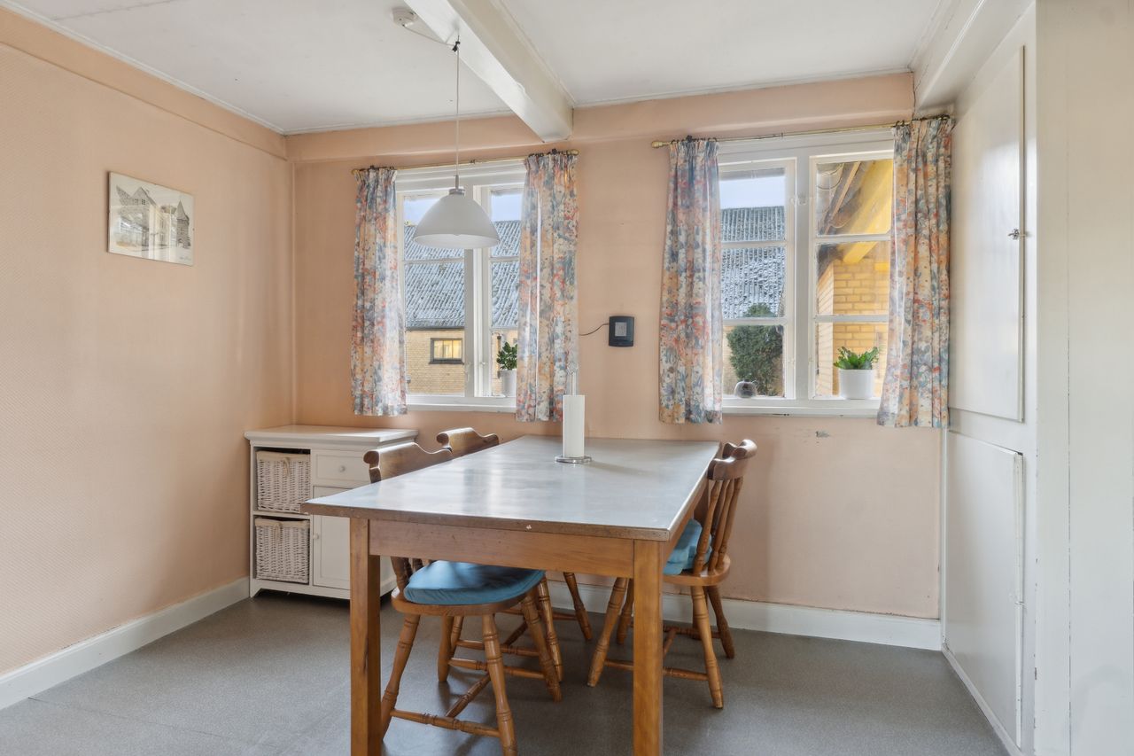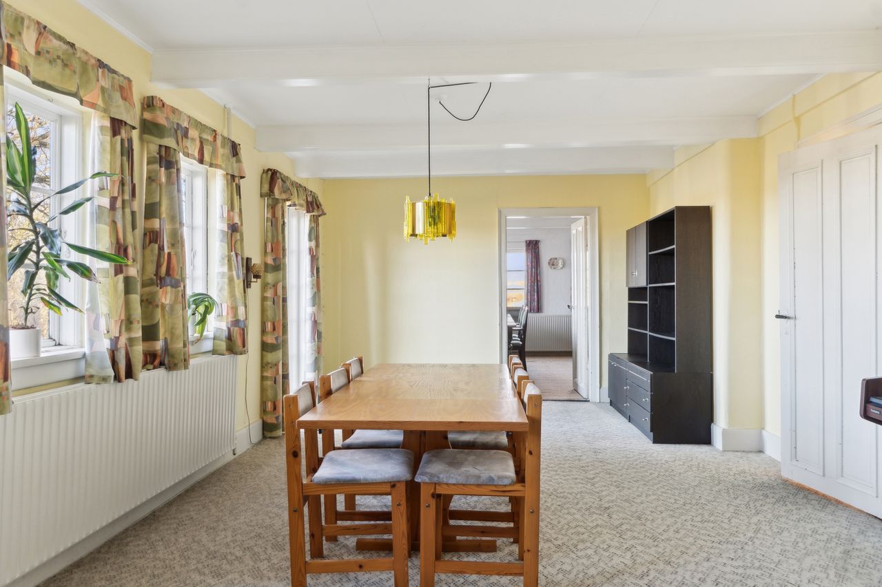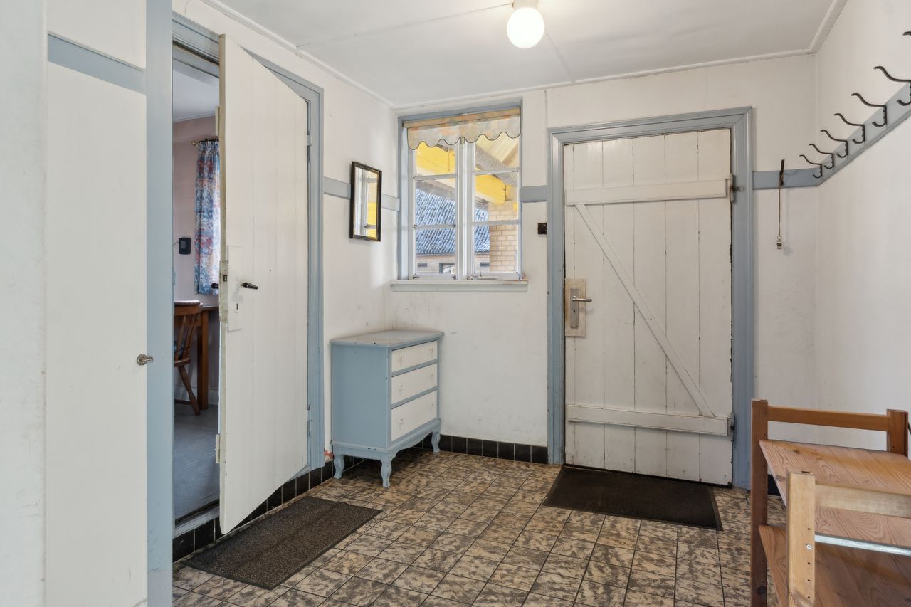 Indenfor mødes du af en rummelig entre, der fører videre til fyrrummet og forstuen. Det ældre køkken er fyldt med charmerende detaljer og har adgang til en lille viktualiekælder - perfekt til opbevaring af dine kulinariske skatte. Hjemmet rummer tre store stuer, hvoraf den ene nemt kan anvendes som spisestue eller opholdsstue alt efter behov.